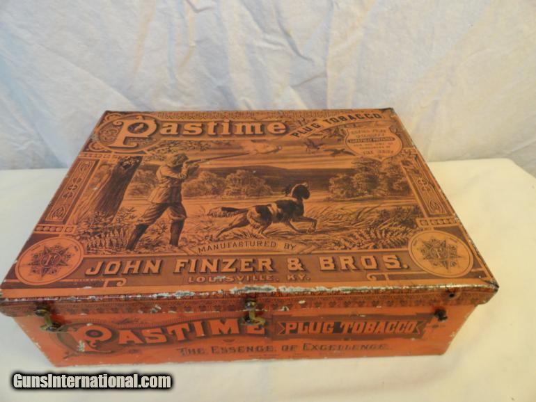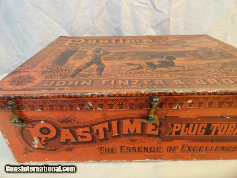Large graphic 13" in length, 9.5" in height and 4" in width comes this store display plug tabacco tin with graphics on three sides and the top features a well healed bird hunter and his dog in superb condition with just some edge wear and a bit of fading. Great Horse scene on inside of lid. Tin held 16 pounds of tabacco. Great early hunting scene.
