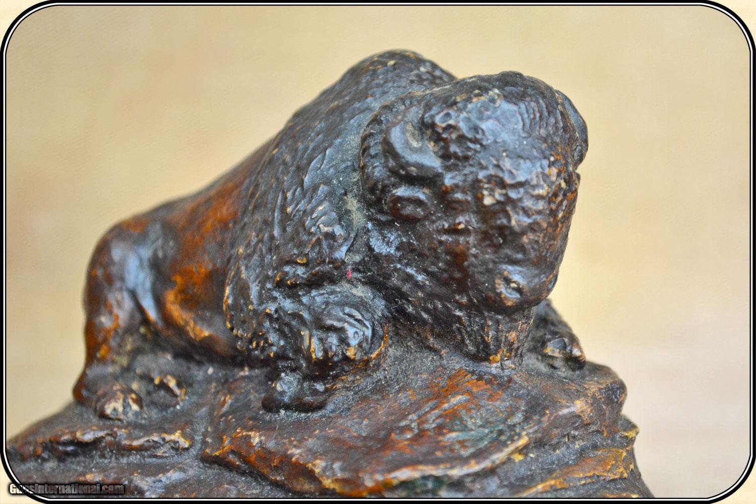Description: Old Calgary Brewing Company advertising ashtray with a horseshoe and buffalo skull along with thecompany founding date of 1892 on the front of the piece. I have rubbed chalk on the imprint so you can see it. It will wipe off. Condition is very good with only a few minor flecks of the finish missing. Base measures 5 3/4 x 5 1/2 inches. It is 3 1/2 inch tall at the buffalo. These were given to saloons and hotels to promote the Calgary Brew. The Brewing Co. was one of the original backers of the Calgary Stampeed. I can just imagine a bunch of crusty old characters with their cegars laying in the tray while heady thick smoke surrounded their heads as they hoist the golden brew. PAYMENT Cash, postal money order, cashiers check, personal & business checks. May order at riverjucntion on-line with credit card. SOLD |