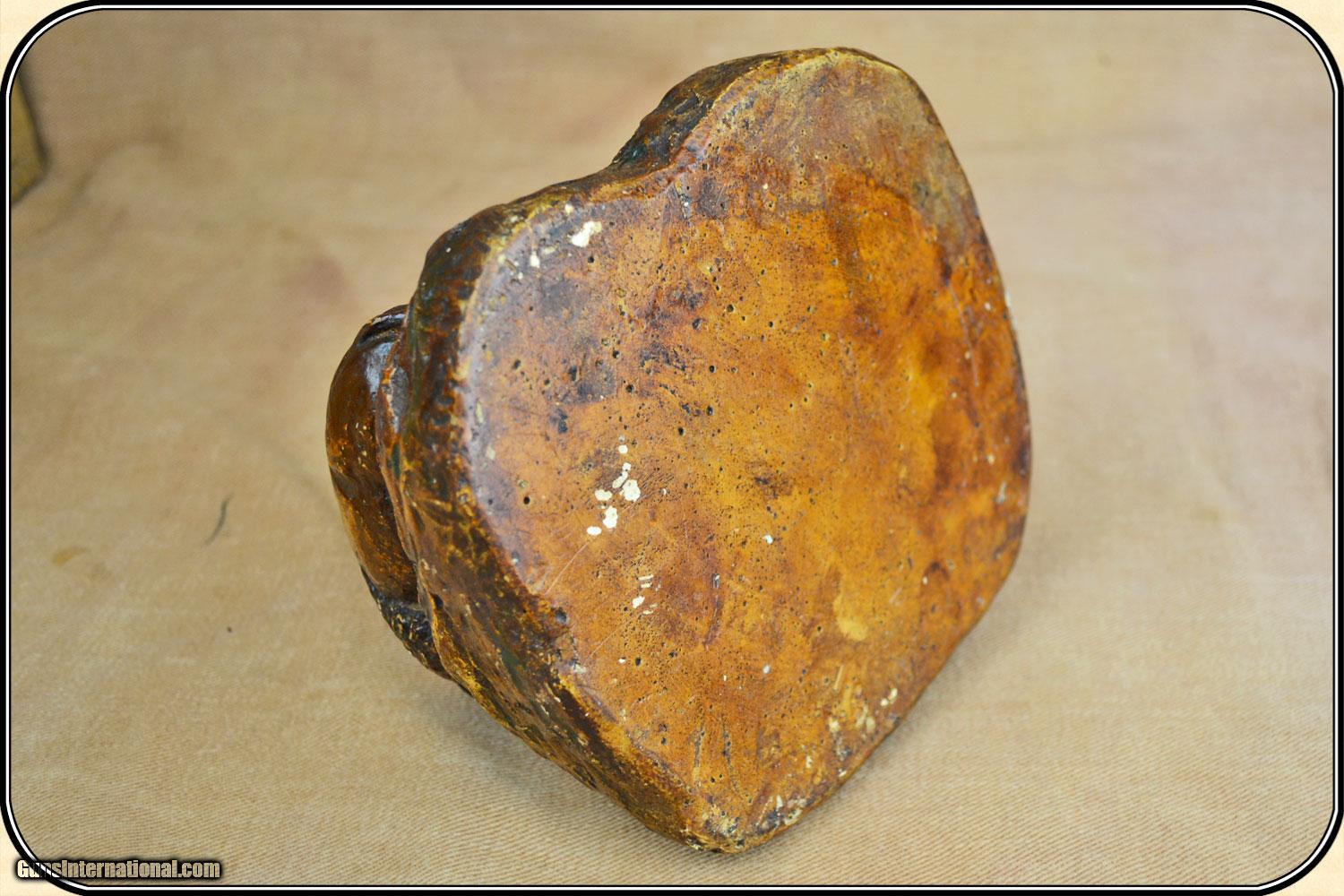 Description: Old Calgary Brewing Company advertising ashtray with a horseshoe and buffalo skull along with thecompany founding date of 1892 on the front of the piece. I have rubbed chalk on the imprint so you can see it. It will wipe off. Condition is very good with only a few minor flecks of the finish missing. Base measures 5 3/4 x 5 1/2 inches. It is 3 1/2 inch tall at the buffalo. These were given to saloons and hotels to promote the Calgary Brew. The Brewing Co. was one of the original backers of the Calgary Stampeed. I can just imagine a bunch of crusty old characters with their cegars laying in the tray while heady thick smoke surrounded their heads as they hoist the golden brew. PAYMENT Cash, postal money order, cashiers check, personal & business checks. May order at riverjucntion on-line with credit card. SOLD |