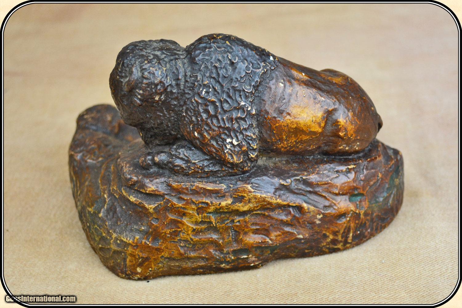 Description: Old Calgary Brewing Company advertising ashtray with a horseshoe and buffalo skull along with thecompany founding date of 1892 on the front of the piece. I have rubbed chalk on the imprint so you can see it. It will wipe off. Condition is very good with only a few minor flecks of the finish missing. Base measures 5 3/4 x 5 1/2 inches. It is 3 1/2 inch tall at the buffalo. These were given to saloons and hotels to promote the Calgary Brew. The Brewing Co. was one of the original backers of the Calgary Stampeed. I can just imagine a bunch of crusty old characters with their cegars laying in the tray while heady thick smoke surrounded their heads as they hoist the golden brew. PAYMENT Cash, postal money order, cashiers check, personal & business checks. May order at riverjucntion on-line with credit card. SOLD |