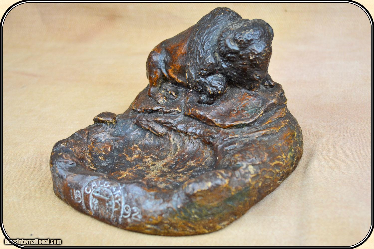 Description: Old Calgary Brewing Company advertising ashtray with a horseshoe and buffalo skull along with thecompany founding date of 1892 on the front of the piece. I have rubbed chalk on the imprint so you can see it. It will wipe off. Condition is very good with only a few minor flecks of the finish missing. Base measures 5 3/4 x 5 1/2 inches. It is 3 1/2 inch tall at the buffalo. These were given to saloons and hotels to promote the Calgary Brew. The Brewing Co. was one of the original backers of the Calgary Stampeed. I can just imagine a bunch of crusty old characters with their cegars laying in the tray while heady thick smoke surrounded their heads as they hoist the golden brew. PAYMENT Cash, postal money order, cashiers check, personal & business checks. May order at riverjucntion on-line with credit card. SOLD |