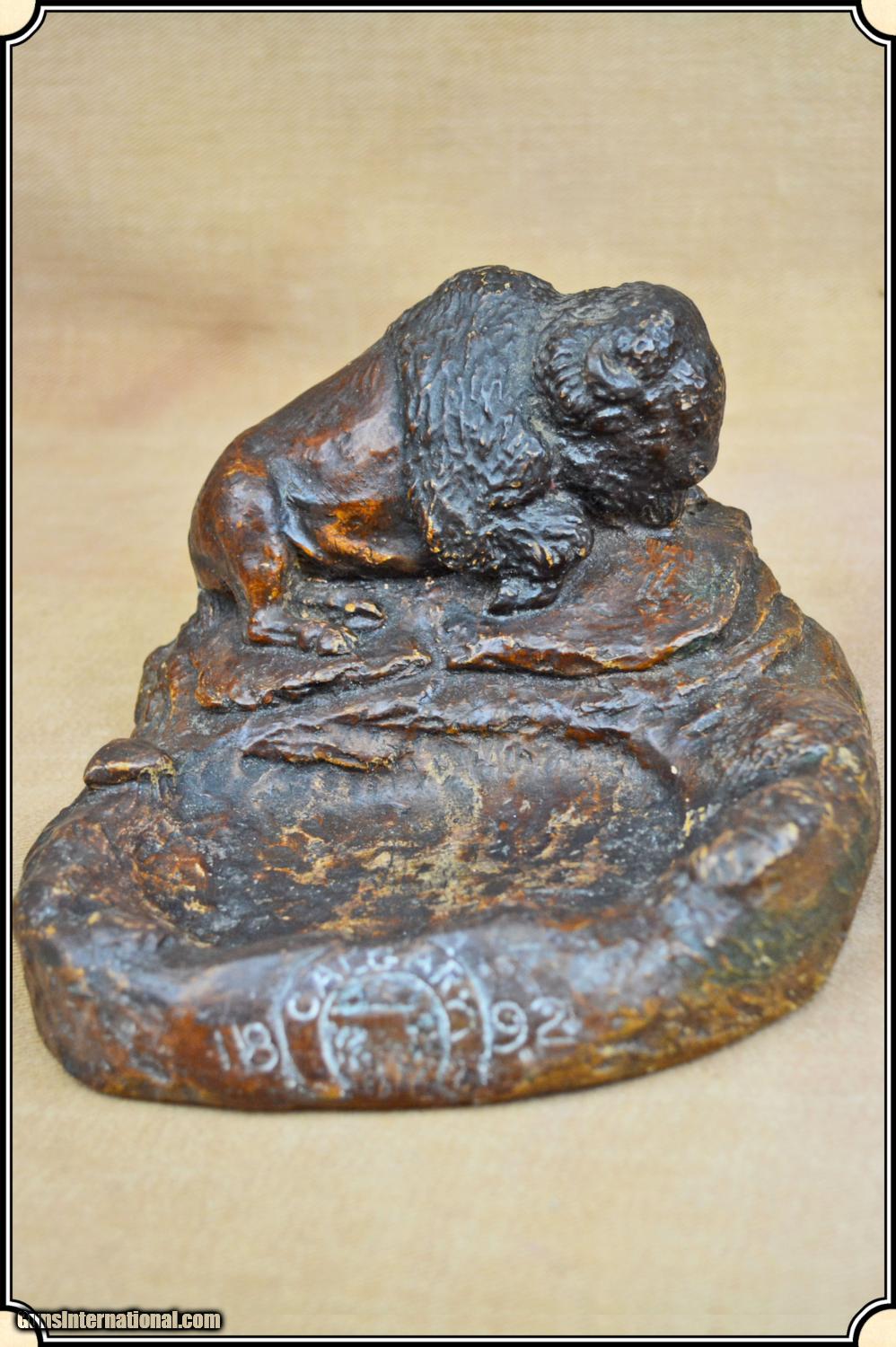 Description: Old Calgary Brewing Company advertising ashtray with a horseshoe and buffalo skull along with thecompany founding date of 1892 on the front of the piece. I have rubbed chalk on the imprint so you can see it. It will wipe off. Condition is very good with only a few minor flecks of the finish missing. Base measures 5 3/4 x 5 1/2 inches. It is 3 1/2 inch tall at the buffalo. These were given to saloons and hotels to promote the Calgary Brew. The Brewing Co. was one of the original backers of the Calgary Stampeed. I can just imagine a bunch of crusty old characters with their cegars laying in the tray while heady thick smoke surrounded their heads as they hoist the golden brew. PAYMENT Cash, postal money order, cashiers check, personal & business checks. May order at riverjucntion on-line with credit card. SOLD |