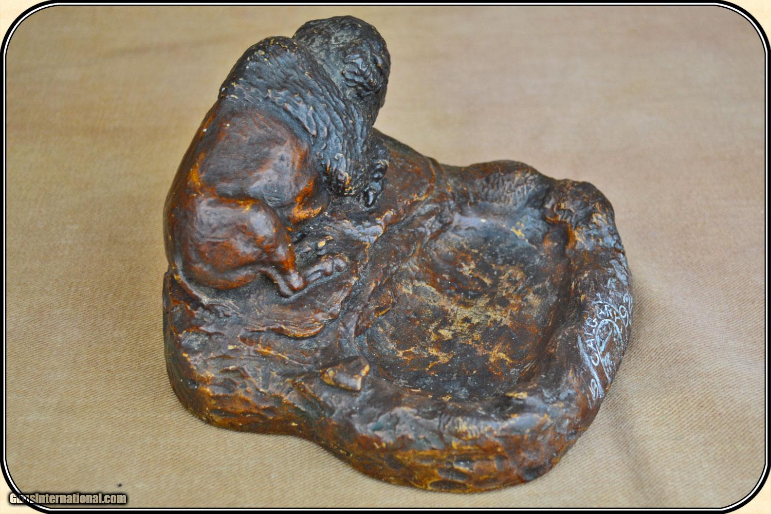 Description: Old Calgary Brewing Company advertising ashtray with a horseshoe and buffalo skull along with thecompany founding date of 1892 on the front of the piece. I have rubbed chalk on the imprint so you can see it. It will wipe off. Condition is very good with only a few minor flecks of the finish missing. Base measures 5 3/4 x 5 1/2 inches. It is 3 1/2 inch tall at the buffalo. These were given to saloons and hotels to promote the Calgary Brew. The Brewing Co. was one of the original backers of the Calgary Stampeed. I can just imagine a bunch of crusty old characters with their cegars laying in the tray while heady thick smoke surrounded their heads as they hoist the golden brew. PAYMENT Cash, postal money order, cashiers check, personal & business checks. May order at riverjucntion on-line with credit card. SOLD |