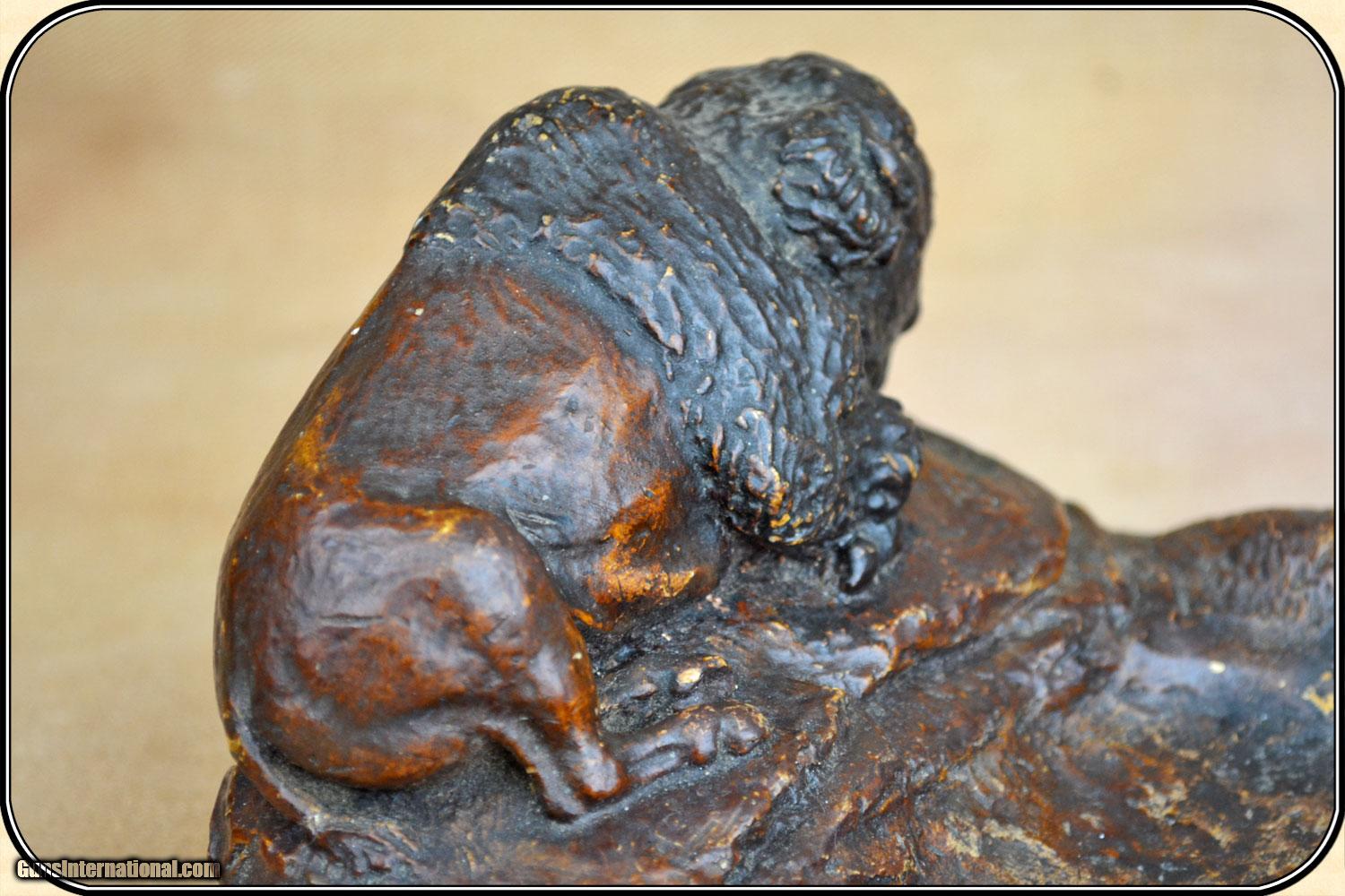Description: Old Calgary Brewing Company advertising ashtray with a horseshoe and buffalo skull along with thecompany founding date of 1892 on the front of the piece. I have rubbed chalk on the imprint so you can see it. It will wipe off. Condition is very good with only a few minor flecks of the finish missing. Base measures 5 3/4 x 5 1/2 inches. It is 3 1/2 inch tall at the buffalo. These were given to saloons and hotels to promote the Calgary Brew. The Brewing Co. was one of the original backers of the Calgary Stampeed. I can just imagine a bunch of crusty old characters with their cegars laying in the tray while heady thick smoke surrounded their heads as they hoist the golden brew. PAYMENT Cash, postal money order, cashiers check, personal & business checks. May order at riverjucntion on-line with credit card. SOLD |
