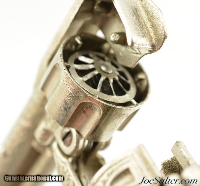 Description: This is a 1960's Hubley "Texan" Die-Cast Cap Pistol. The pistol is in very good to excellent original condition with little signs of being used, retains all most all of the original finish. The trigger works flawless as dose the cylinder with near pristine internal parts. This is a must have USA Hubley produced pistol that and is a full 9" long with white long horn grips in very good condition with no ships and two tiny cracks and most of the original red paint on the stars. This pistol is a handful with substantial weight and feel. SOLD |