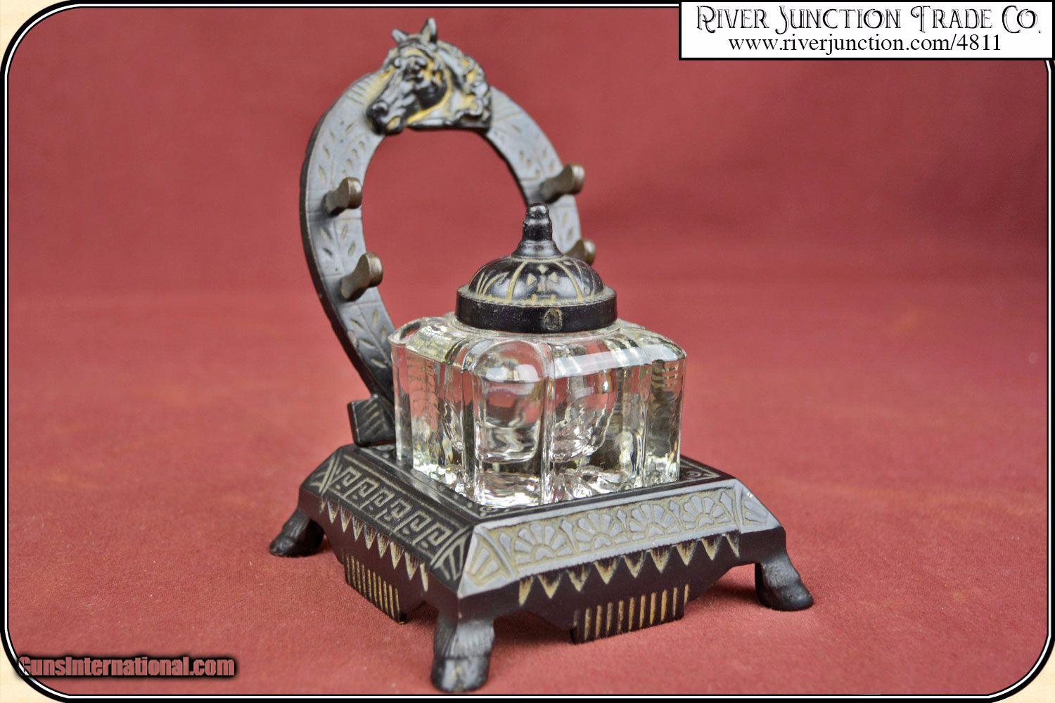 Description: An antique cast iron Horseshoe Inkwell stand with pressed glass covered ink reservoir. The cast iron stand has a horse head as a main focal point with attached ledges to accommodate vintage or modern day ink pens. The glass ink reservoir has its original cast iron top which fits securely on top, does not screw on. The overall design though equestrian in context has an Eastlake look to it. Measurements: Approximately 3-3/4 inches wide by 4-3/4 inches deep and 5-1/8 inches tall. Condition: Near perfect antique condition. The original pressed glass ink reservoir fits secure in the stand. There are no rim nicks/chips to its exterior rim under the lid. Marks: On the base of the glass ink reservoir are the impressed letters P S & W Co. for Peck, Stow & Wilcox Co. PAT DEC. 11, and 77 for the year 1877. An ideal desk piece for a Victorian decor or horse or ranch lovers home or office. Note, the horse hoof feet. Payment Cash, postal money order, cashiers check, personal & business checks. Can be ordered with a credit card or paypal at wxx.riverjunction,cxx just type in the number 4811 in the search box. SOLD |