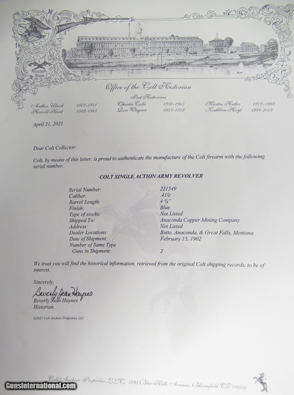 Description: Colt Single Action Army Revolver; Serial No. 221549; Per Included Factory Letter: .41 Caliber with 4 ¾” Barrel and Blue Finish; Shipped to Anaconda Copper Mining Company on February 15, 1902; Dealer Locations in Butte, Anaconda, & Great Falls, Montana; Part of a 2 Gun Shipment; All Numbers Match; Decent Amount of Original Metal Finish Present but trigger guard and backstrap re-blued; Worn Original Colt Hard Rubber Grips; Perfect Action and Very Strong Bore with only minor imperfections; Antique by Caliber and Design; Historic Montana Shipped 120 Year-Old Colt S.A.A.; See All Photos for Condition; No Texts; Call (254)541-5765 or Email Only; PERSONAL PROPERTY of Harold Wieser; Price: $5,975 + $45 S&H Via USPS PRIORITY MAIL; Payment Address: Harold Wieser - 1466 U.S. Hwy 77 - Rosebud, TX 76570; SEND PAYMENTS VIA USPS PRIORITY MAIL; BEWARE of SCAMS!!! – DO NOT SEND MONEY or CORRESPONDENTS ELECTRONICALLY UNLESS YOU HAVE SPOKEN to HAROLD WIESER FIRST! 254-541-5765 SOLD |