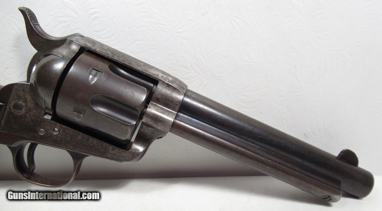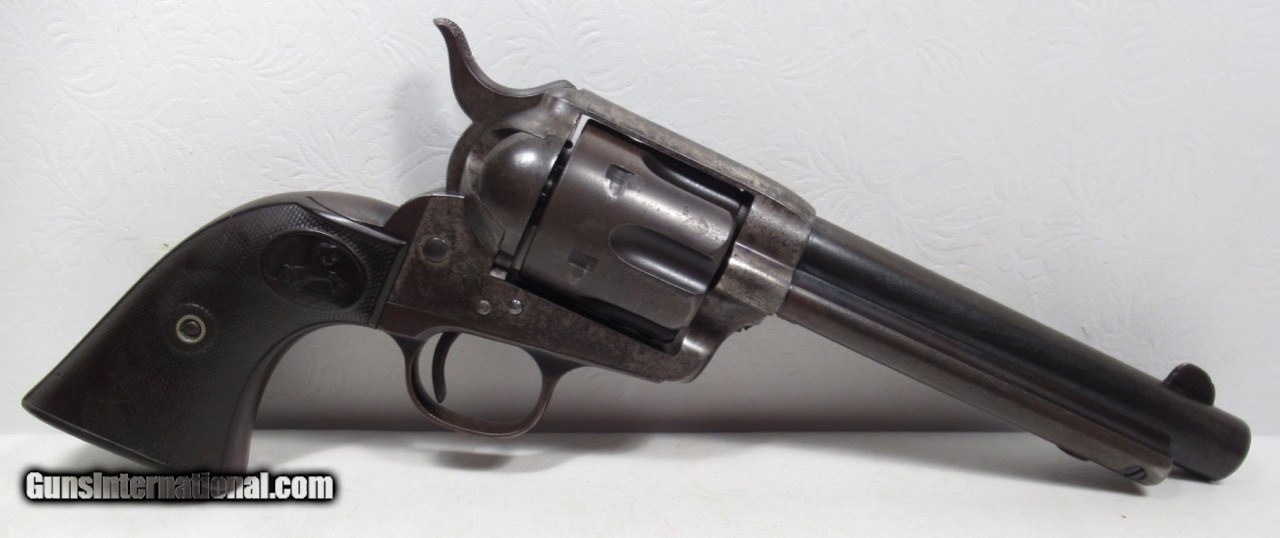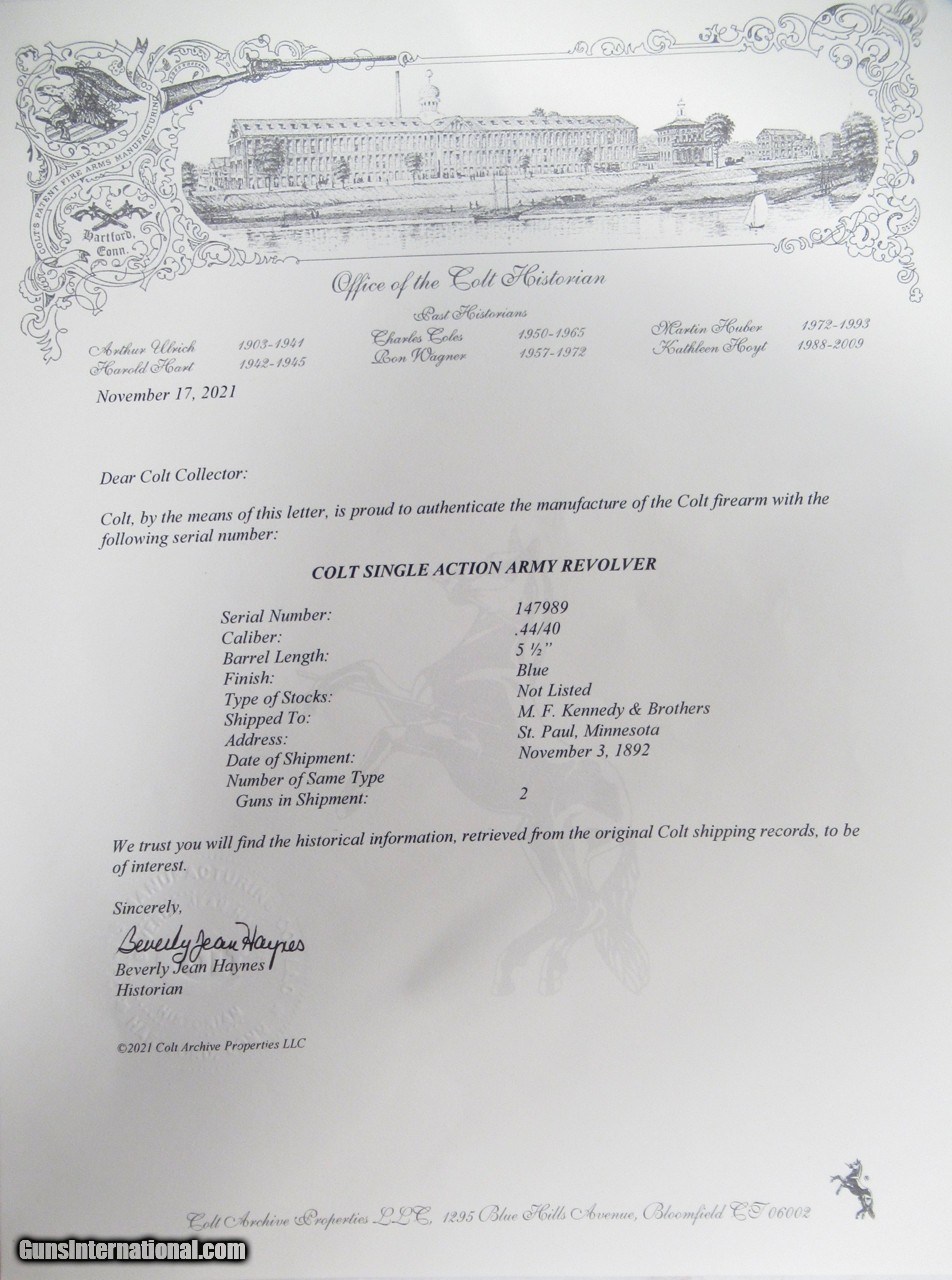 Description: Colt Single Action Army Revolver; Serial No. 147989; Per Included Factory Letter: .44/40 Caliber with 5 ½” Barrel and Blue Finish; Shipped to M.F. Kennedy & Brothers of St. Paul, Minnesota on November 3, 1892 as Part of a 2 Gun Shipment; Most Likely Colt Ended up in North Dakota; Lots of Original Metal Finish Present; Grips Have Last 2 Digits 89 Scratched Inside; “ELFF” Scratched on Inside of Right Grip, Also has “89” and Name “Holland”? (See Photos); Perfect Action and Lockup; Strong Shiny Bore with very minor flaws; Nice Original 130 Year-Old “COLT FRONTIER SIX SHOOTER”; See All Photos for Condition; No Texts; Call (254)541-5765 or Email Only; PERSONAL PROPERTY of Harold Wieser; Price: $6,975 + $45 S&H Via USPS PRIORITY MAIL; Payment Address: Harold Wieser - 1466 U.S. Hwy 77 - Rosebud, TX 76570; SEND PAYMENTS VIA USPS PRIORITY MAIL; BEWARE of SCAMS!!! – DO NOT SEND MONEY or CORRESPONDENTS ELECTRONICALLY UNLESS YOU HAVE SPOKEN to HAROLD WIESER FIRST! 254-541-5765 SOLD |