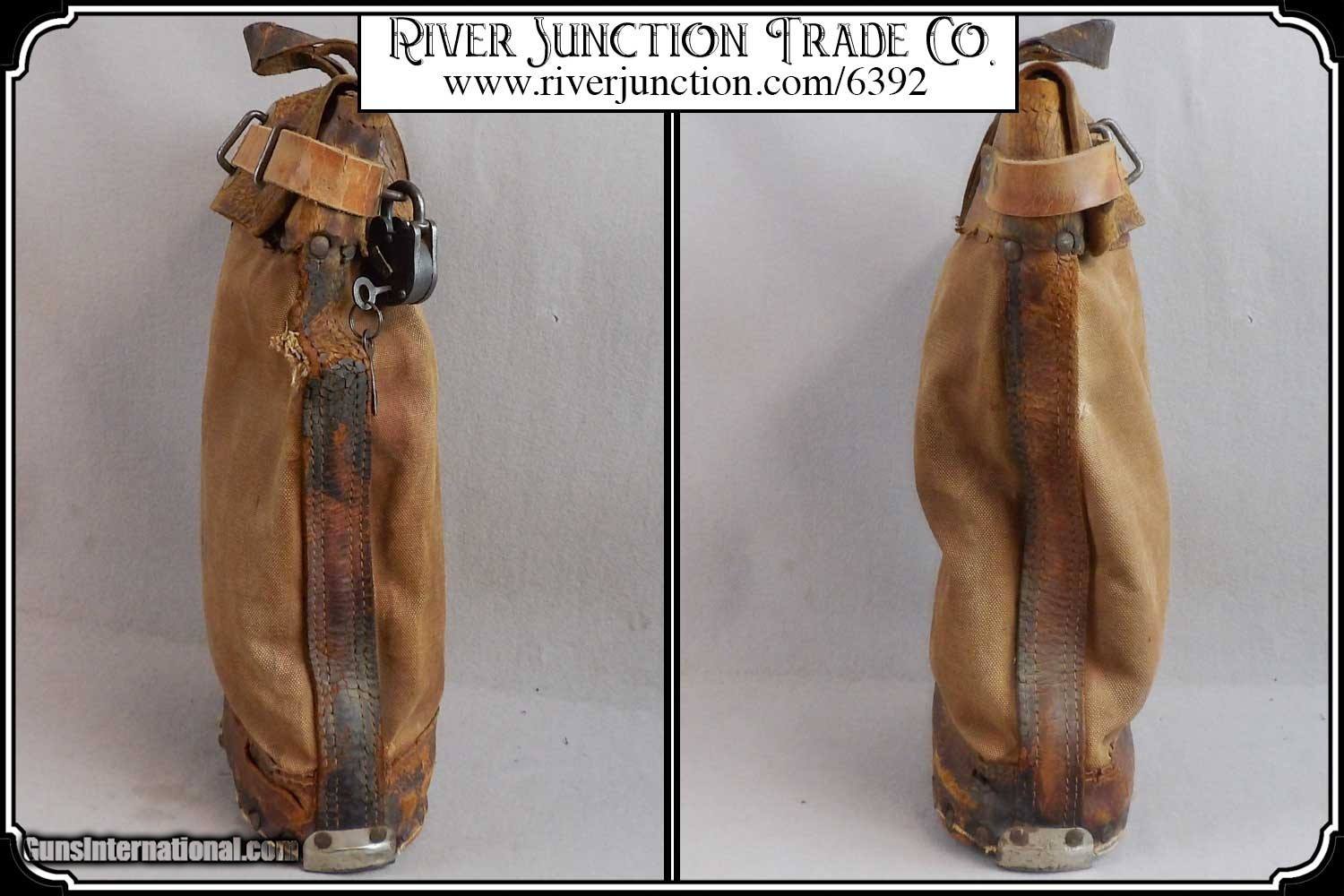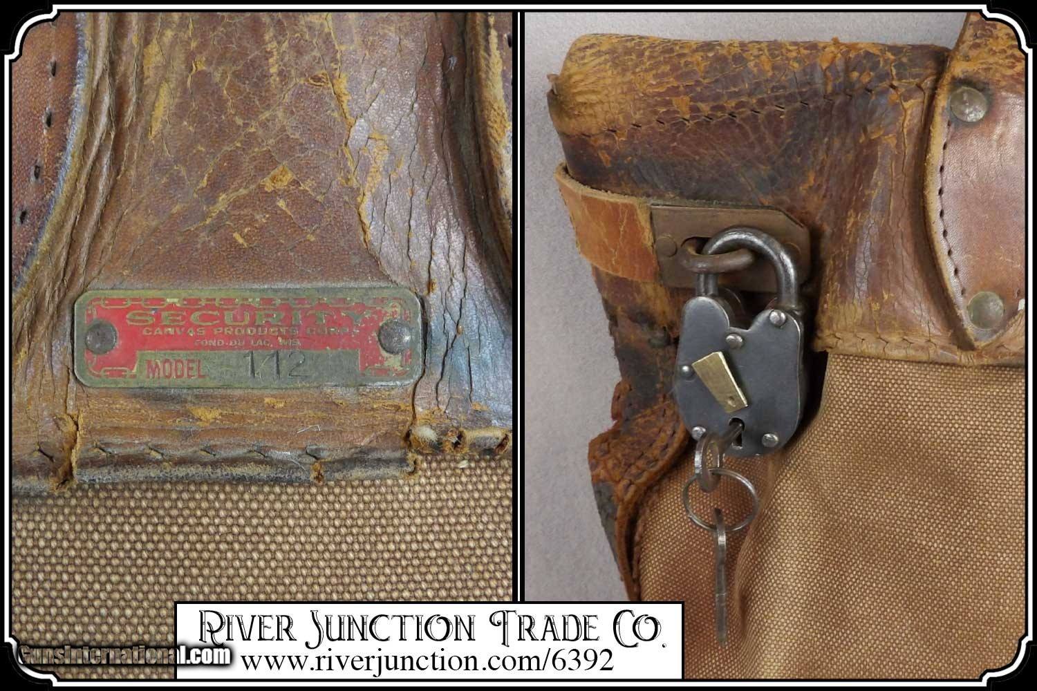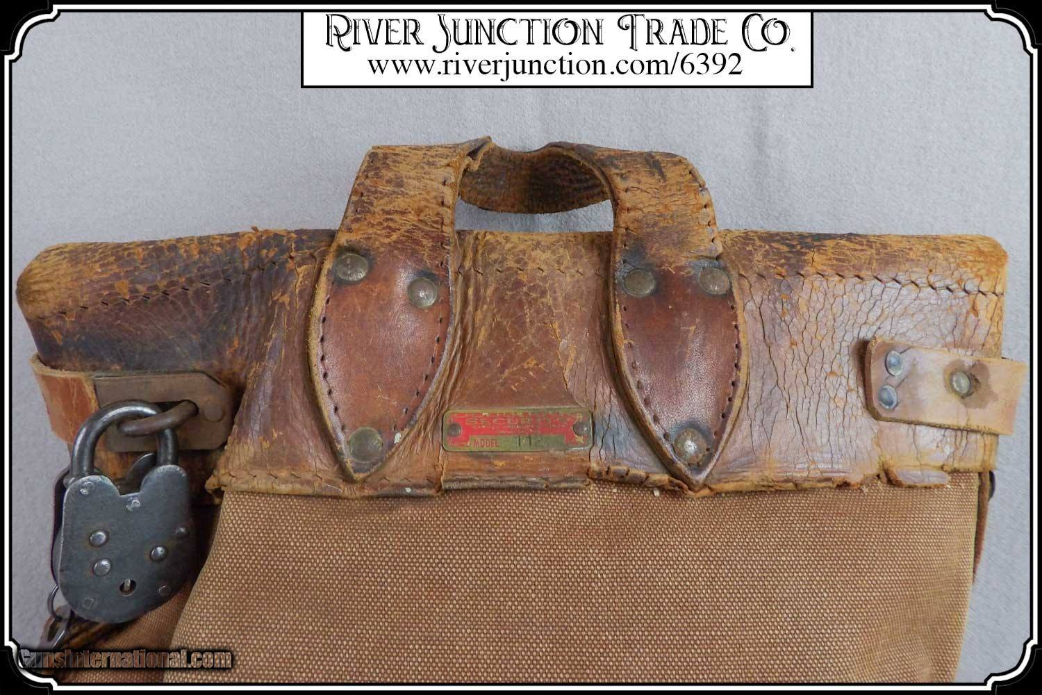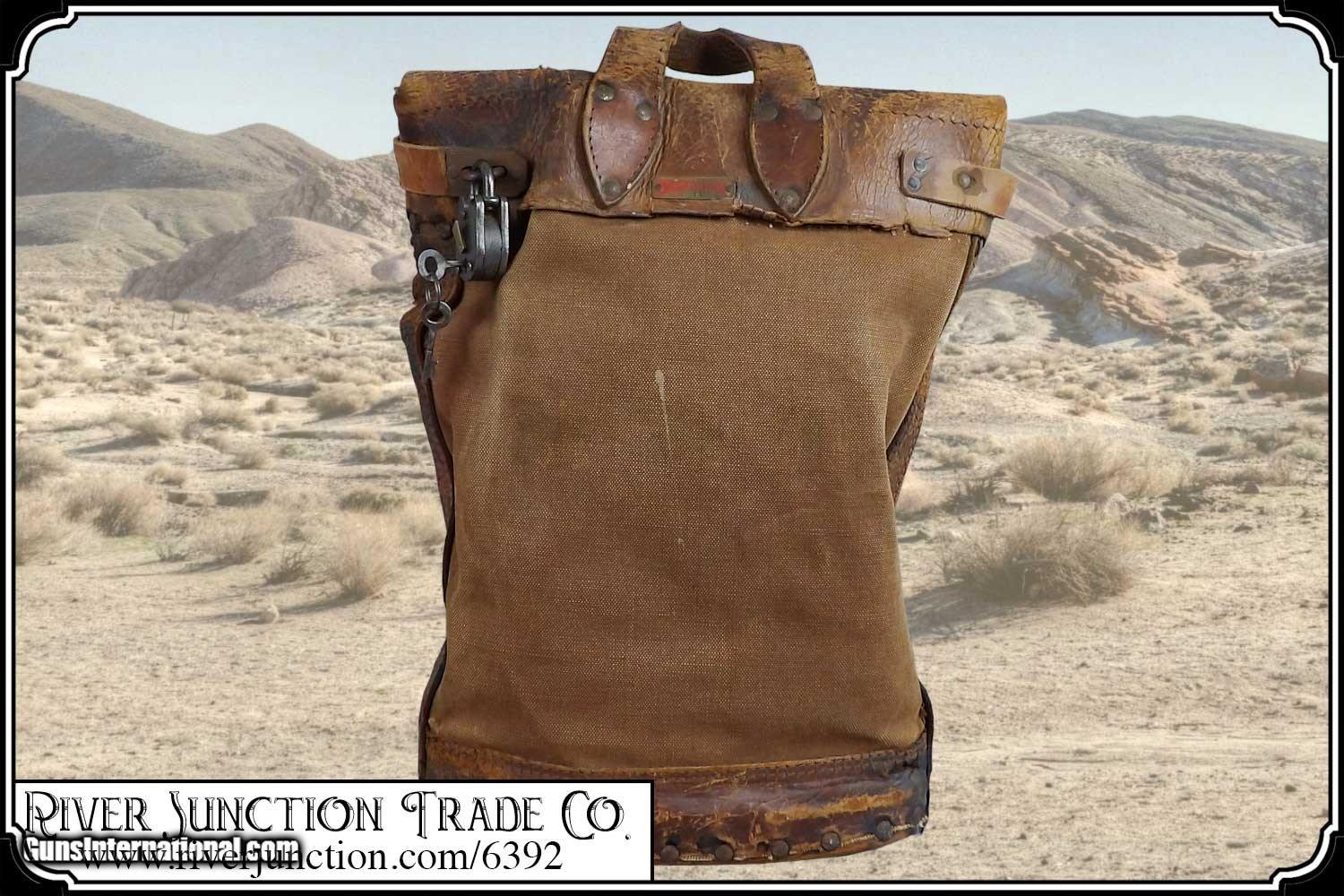 Description: Here's a rare antique, 19th Century leather express pouch. These were used by Wells Fargo, Adams and American Express companies as well as the railroads. The "Registered pouch was carried right along with the Wells Fargo strong box and often had more valuables than the box it's self." It has a handle attached to the back. The flap is secured with a strap run through 3 steel loops on the front. The strap attaches to a hasp on the back with a padlock. The included pad lock is a reproduction" This was a very rugged, old express mailbag with heavy duty rivets around the bottom and leather straps on both sides.. The handle is attached with steel rivets and also sewn on. It shows reddish brown oiled finish along with the scars and abuse of years of hard service. It has a great look with rich coloring and will add much to a display of stagecoach, railroad or outlaw collectables. The leather is in a condition that shows its age. It would look right in place on a frontier stagecoach or on board an early steam train express car. The belt is still intact and attached to its original brass latch at the end. Despite all the heavy loads this pouch has carried, even the bottom of this pouch is still attached. For it's age this bag would display very well. It measures about 18 inches tall, 12 inches tall, and about 4 1/2 inches wide. There is a makers metal tag marked Security Canvas Products Corp. that pictures chain links around its boarder. It was an important piece of express and postal history that you don't find everyday. This would be a wonderful addition to a mining display, express collection or outlaw loot and strong box. I have added a reproduction iron padlock with keys just for fun. Other items show are not included. Payment: Item, can be ordered on line with a credit card or paypal on our sight. Just Google (riverjunction) and type in the River Junction Trade Co. item number (6392) in the search box. Before you checkout you will see shipping cost and total. OR If you prefer: Pay by cash, postal money order, cashiers check, personal & business checks. We wait for checks to clear. We always answer questions and entertain offers. Have questions? Call me 563-880-4588. Jim SOLD |