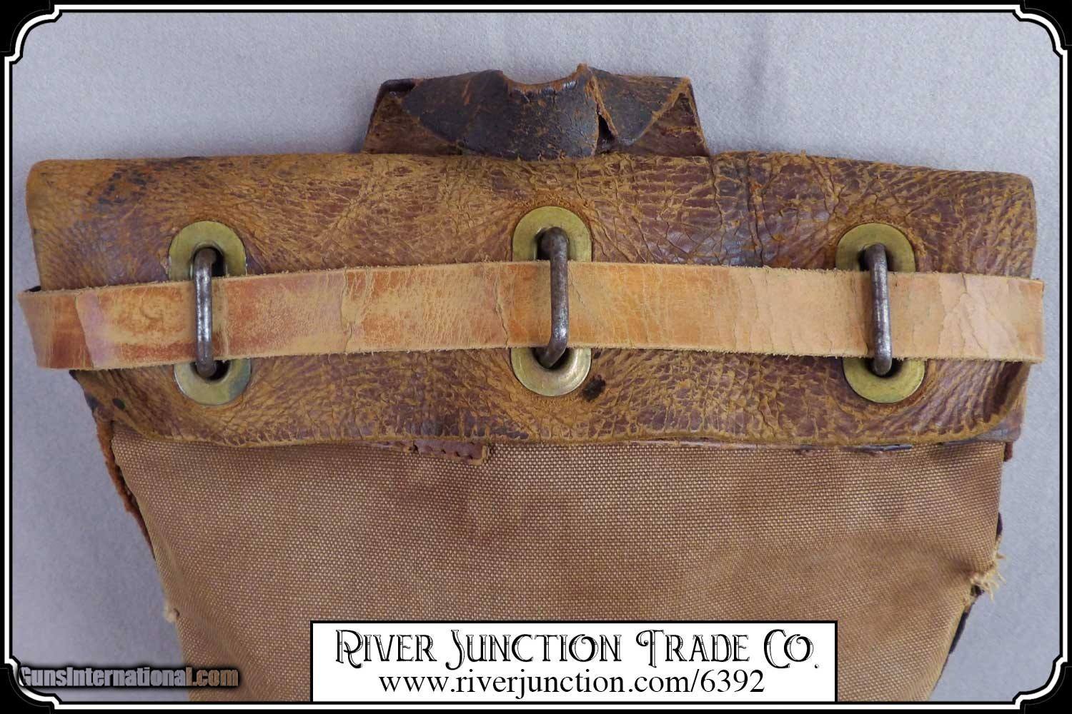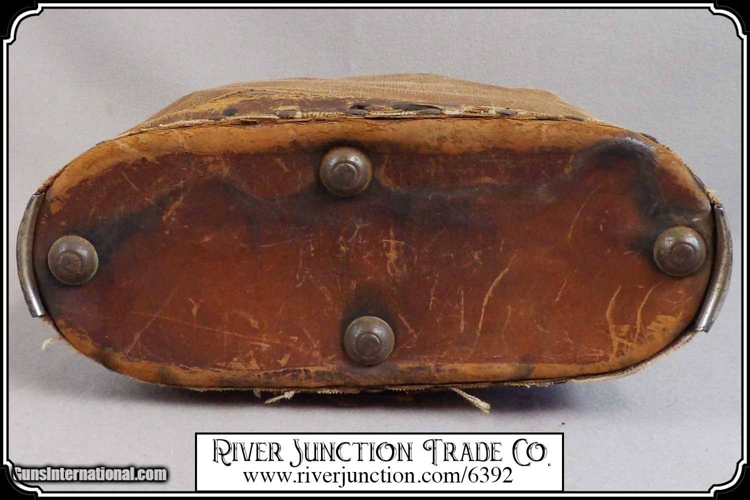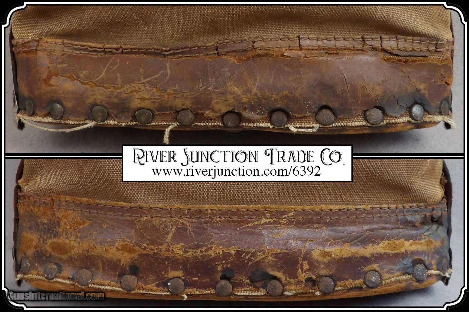 Description: Here's a rare antique, 19th Century leather express pouch. These were used by Wells Fargo, Adams and American Express companies as well as the railroads. The "Registered pouch was carried right along with the Wells Fargo strong box and often had more valuables than the box it's self." It has a handle attached to the back. The flap is secured with a strap run through 3 steel loops on the front. The strap attaches to a hasp on the back with a padlock. The included pad lock is a reproduction" This was a very rugged, old express mailbag with heavy duty rivets around the bottom and leather straps on both sides.. The handle is attached with steel rivets and also sewn on. It shows reddish brown oiled finish along with the scars and abuse of years of hard service. It has a great look with rich coloring and will add much to a display of stagecoach, railroad or outlaw collectables. The leather is in a condition that shows its age. It would look right in place on a frontier stagecoach or on board an early steam train express car. The belt is still intact and attached to its original brass latch at the end. Despite all the heavy loads this pouch has carried, even the bottom of this pouch is still attached. For it's age this bag would display very well. It measures about 18 inches tall, 12 inches tall, and about 4 1/2 inches wide. There is a makers metal tag marked Security Canvas Products Corp. that pictures chain links around its boarder. It was an important piece of express and postal history that you don't find everyday. This would be a wonderful addition to a mining display, express collection or outlaw loot and strong box. I have added a reproduction iron padlock with keys just for fun. Other items show are not included. Payment: Item, can be ordered on line with a credit card or paypal on our sight. Just Google (riverjunction) and type in the River Junction Trade Co. item number (6392) in the search box. Before you checkout you will see shipping cost and total. OR If you prefer: Pay by cash, postal money order, cashiers check, personal & business checks. We wait for checks to clear. We always answer questions and entertain offers. Have questions? Call me 563-880-4588. Jim SOLD |