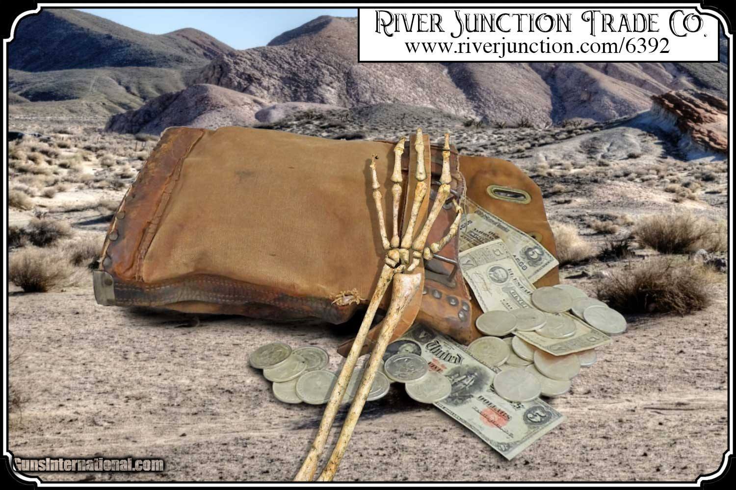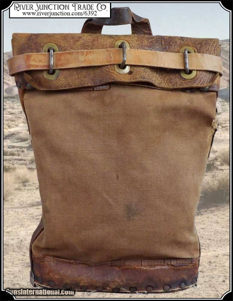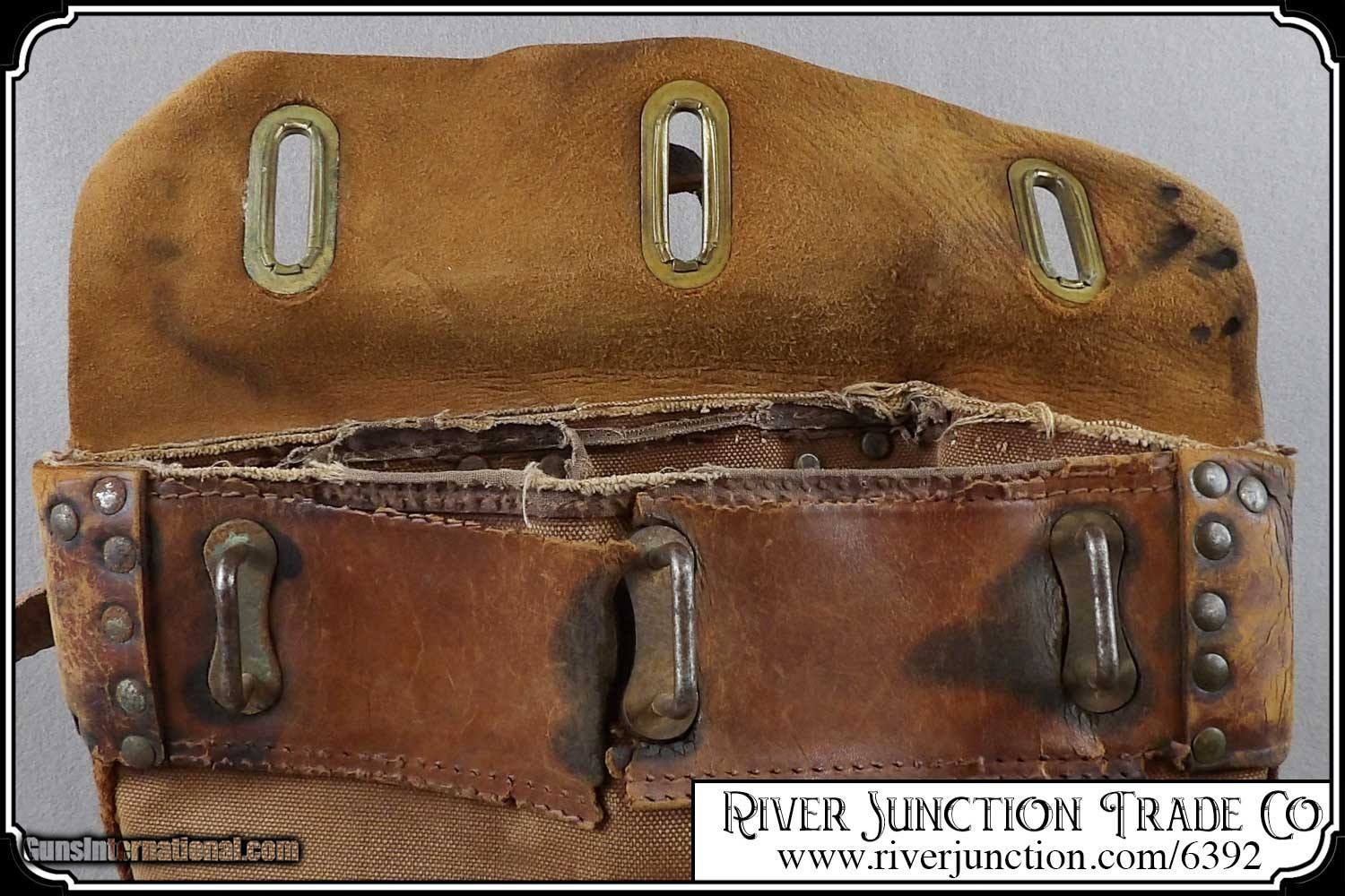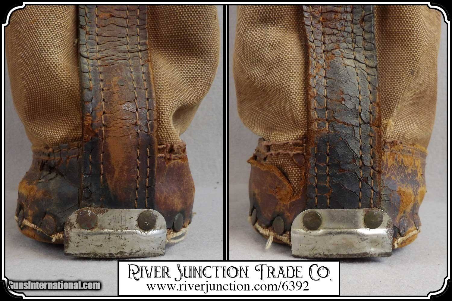 Description: Here's a rare antique, 19th Century leather express pouch. These were used by Wells Fargo, Adams and American Express companies as well as the railroads. The "Registered pouch was carried right along with the Wells Fargo strong box and often had more valuables than the box it's self." It has a handle attached to the back. The flap is secured with a strap run through 3 steel loops on the front. The strap attaches to a hasp on the back with a padlock. The included pad lock is a reproduction" This was a very rugged, old express mailbag with heavy duty rivets around the bottom and leather straps on both sides.. The handle is attached with steel rivets and also sewn on. It shows reddish brown oiled finish along with the scars and abuse of years of hard service. It has a great look with rich coloring and will add much to a display of stagecoach, railroad or outlaw collectables. The leather is in a condition that shows its age. It would look right in place on a frontier stagecoach or on board an early steam train express car. The belt is still intact and attached to its original brass latch at the end. Despite all the heavy loads this pouch has carried, even the bottom of this pouch is still attached. For it's age this bag would display very well. It measures about 18 inches tall, 12 inches tall, and about 4 1/2 inches wide. There is a makers metal tag marked Security Canvas Products Corp. that pictures chain links around its boarder. It was an important piece of express and postal history that you don't find everyday. This would be a wonderful addition to a mining display, express collection or outlaw loot and strong box. I have added a reproduction iron padlock with keys just for fun. Other items show are not included. Payment: Item, can be ordered on line with a credit card or paypal on our sight. Just Google (riverjunction) and type in the River Junction Trade Co. item number (6392) in the search box. Before you checkout you will see shipping cost and total. OR If you prefer: Pay by cash, postal money order, cashiers check, personal & business checks. We wait for checks to clear. We always answer questions and entertain offers. Have questions? Call me 563-880-4588. Jim SOLD |