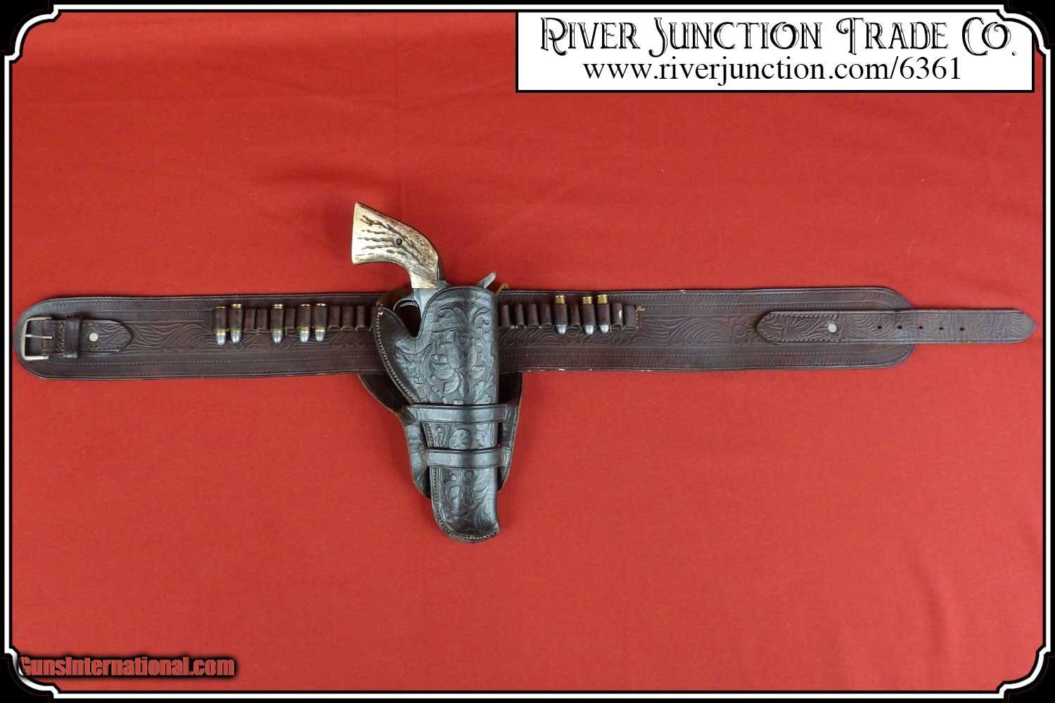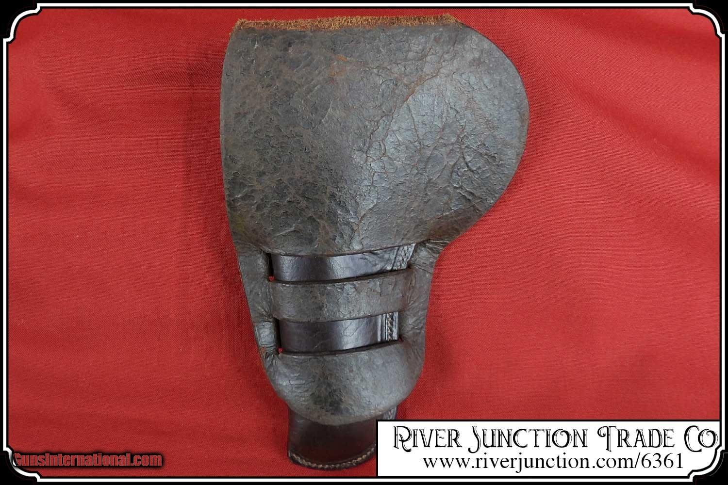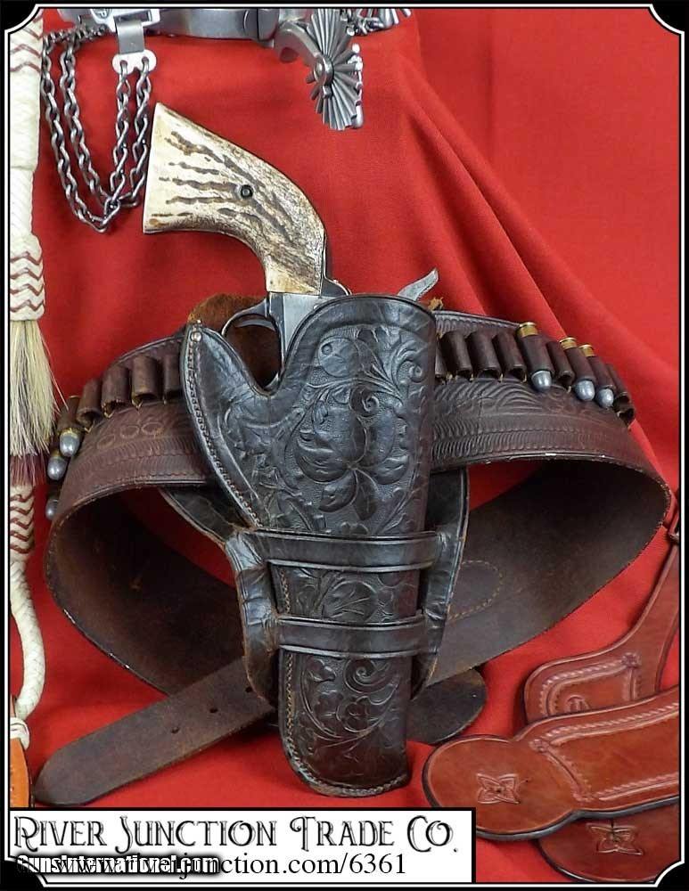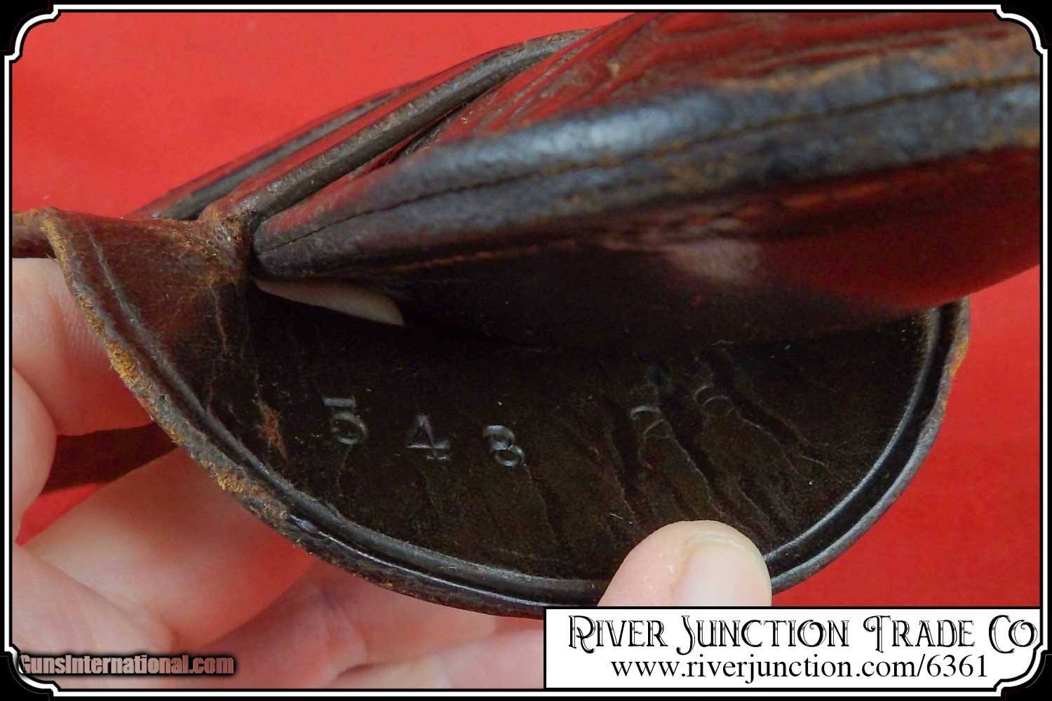 Description: Original Holster 1880 to1890. Civilian holster and belt from the Old West era. This classic rig with tooling makes for a most attractive outfit. This holster was a popular civilian style of the 80's and 90's. and beyond. Double loop style with its typical sewn closed toe. Made of medium weight russet colored leather, with pressed design on the main pouch. This holster could be worn as right hand draw or cross draw. It fits a 1873 Colt Single Action Army with a 5 1/2 inch barrel perfectly. The leather is soft and pliable. It would be perfect for displaying with your original vintage Colt or you could just use it. All the stitches are strong and intact. A very nice, hard to find holster and belt for a 5 1/2 barreled Colt and others as in this case it holds my old Colt 1873 SAA. Vintage leather holster made for BIFFAR CHICAGO. Fred Biffar is recognized for his Chicago-based business "Fred Biffar was a retailer in sporting goods. This holster is in very good condition no breaks or tears and the belt is likewise. Nice for the collector to show off his vintage Colt six gun or S&W Frontier. Holster marked with the model number "548 and 26". The belt is marked "Brauer Bros Mfg. Co St. Louis 20 32 38 C". It is a perfect fit for my 5 1/2 in. barrel Colt SAA but would service equally as well for a Colt Bisley 4 3/4", 5 1/2", a Colt 1878 D.A., or a S&W D.A. or S.A. Frontier 6". To find one in good condition is a rarity. There are no loose or missing stitching. My Old six shooter and other Items are not included . Payment: Item, can be ordered on line with a credit card or paypal on our sight. Just Google (riverjunction) and type in the River Junction Trade Co. item number (6361) in the search box. Before you checkout you will see shipping cost and total. OR If you prefer: Pay by cash, postal money order, cashiers check, personal & business checks. We wait for checks to clear. We always answer questions and entertain offers. Have questions? Call me 563-880-4588. Jim SOLD |