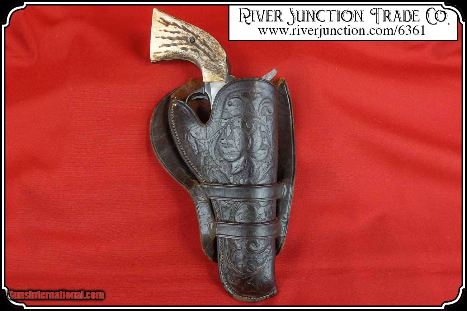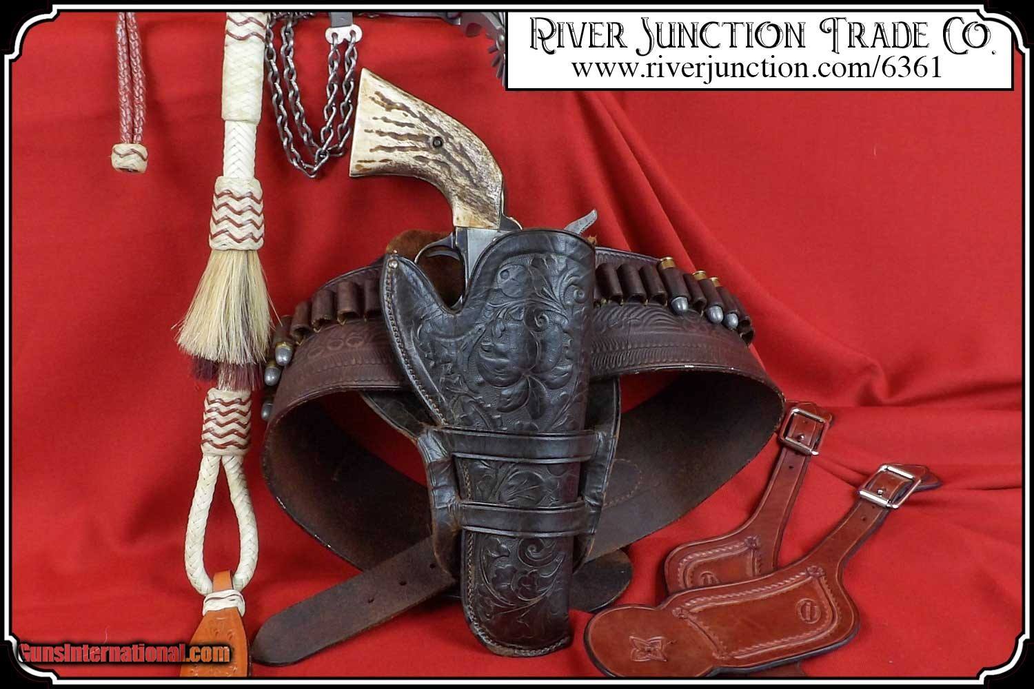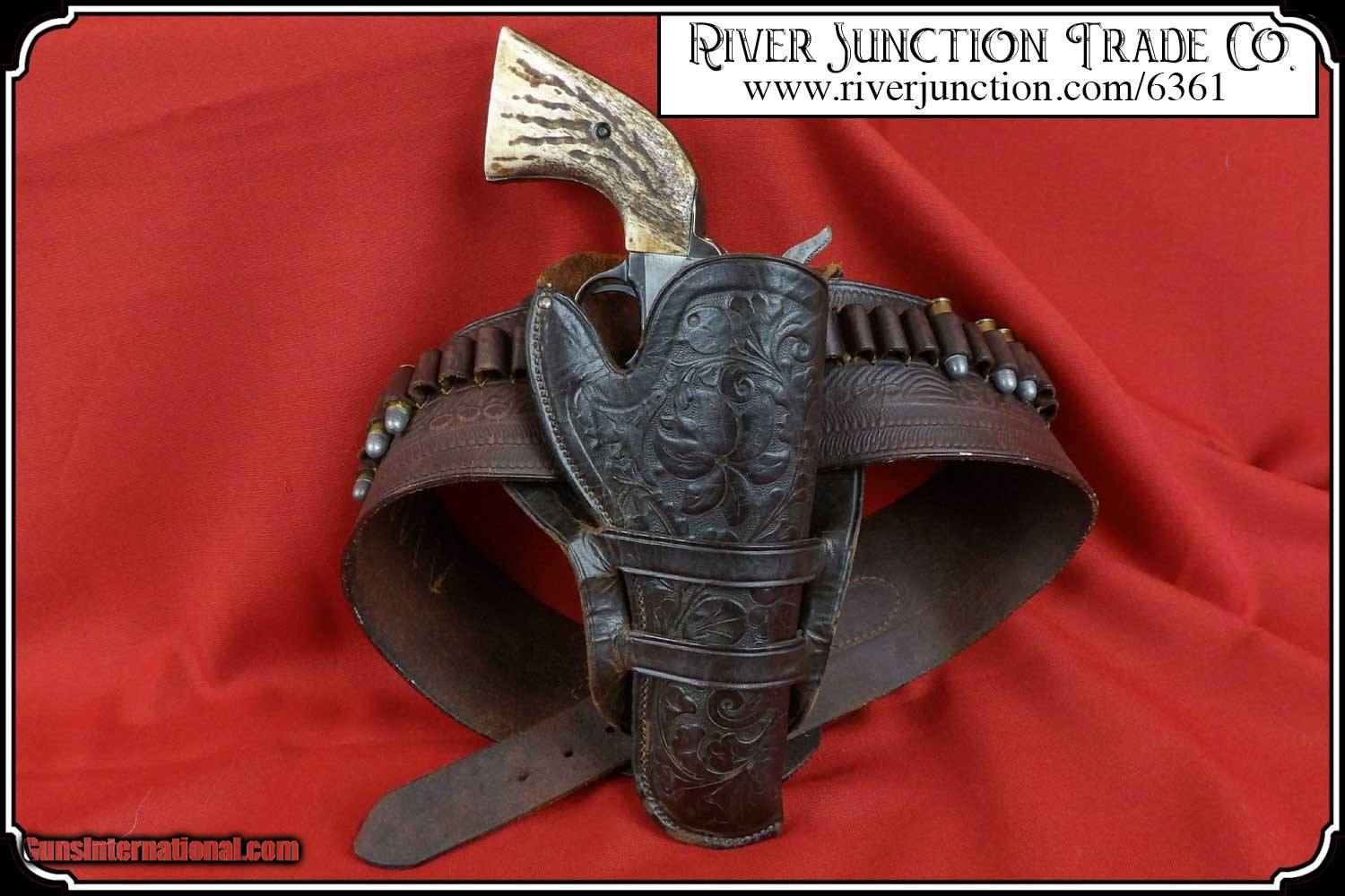 Description: Original Holster 1880 to1890. Civilian holster and belt from the Old West era. This classic rig with tooling makes for a most attractive outfit. This holster was a popular civilian style of the 80's and 90's. and beyond. Double loop style with its typical sewn closed toe. Made of medium weight russet colored leather, with pressed design on the main pouch. This holster could be worn as right hand draw or cross draw. It fits a 1873 Colt Single Action Army with a 5 1/2 inch barrel perfectly. The leather is soft and pliable. It would be perfect for displaying with your original vintage Colt or you could just use it. All the stitches are strong and intact. A very nice, hard to find holster and belt for a 5 1/2 barreled Colt and others as in this case it holds my old Colt 1873 SAA. Vintage leather holster made for BIFFAR CHICAGO. Fred Biffar is recognized for his Chicago-based business "Fred Biffar was a retailer in sporting goods. This holster is in very good condition no breaks or tears and the belt is likewise. Nice for the collector to show off his vintage Colt six gun or S&W Frontier. Holster marked with the model number "548 and 26". The belt is marked "Brauer Bros Mfg. Co St. Louis 20 32 38 C". It is a perfect fit for my 5 1/2 in. barrel Colt SAA but would service equally as well for a Colt Bisley 4 3/4", 5 1/2", a Colt 1878 D.A., or a S&W D.A. or S.A. Frontier 6". To find one in good condition is a rarity. There are no loose or missing stitching. My Old six shooter and other Items are not included . Payment: Item, can be ordered on line with a credit card or paypal on our sight. Just Google (riverjunction) and type in the River Junction Trade Co. item number (6361) in the search box. Before you checkout you will see shipping cost and total. OR If you prefer: Pay by cash, postal money order, cashiers check, personal & business checks. We wait for checks to clear. We always answer questions and entertain offers. Have questions? Call me 563-880-4588. Jim SOLD |