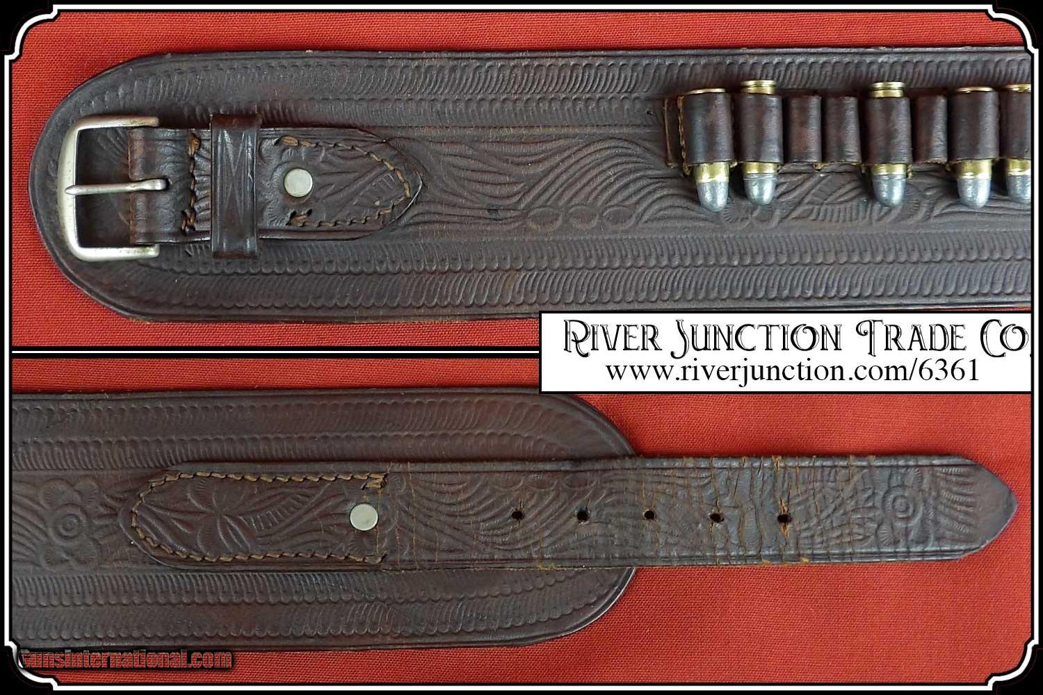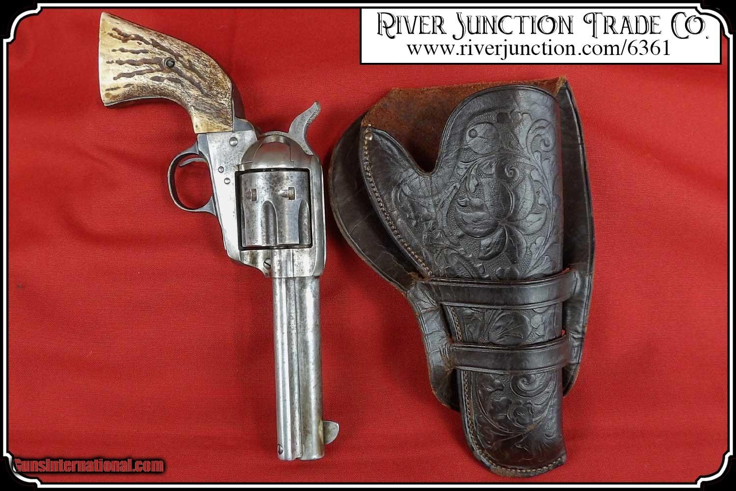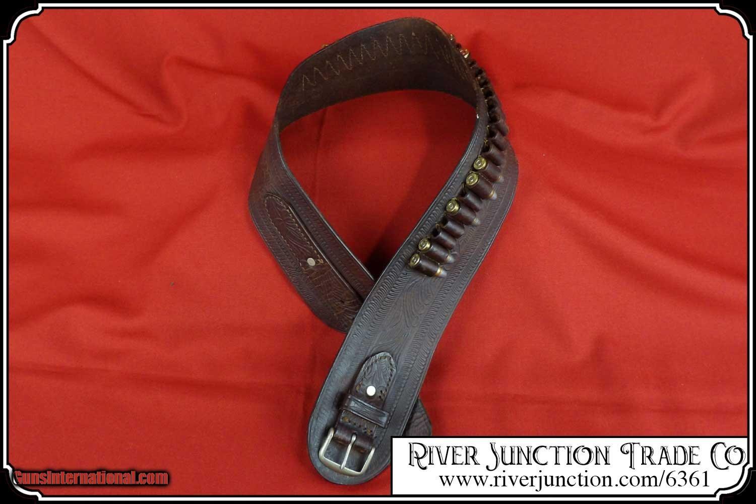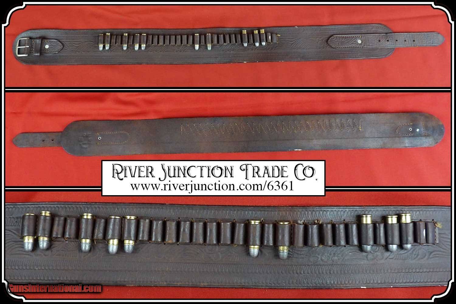 Description: Original Holster 1880 to1890. Civilian holster and belt from the Old West era. This classic rig with tooling makes for a most attractive outfit. This holster was a popular civilian style of the 80's and 90's. and beyond. Double loop style with its typical sewn closed toe. Made of medium weight russet colored leather, with pressed design on the main pouch. This holster could be worn as right hand draw or cross draw. It fits a 1873 Colt Single Action Army with a 5 1/2 inch barrel perfectly. The leather is soft and pliable. It would be perfect for displaying with your original vintage Colt or you could just use it. All the stitches are strong and intact. A very nice, hard to find holster and belt for a 5 1/2 barreled Colt and others as in this case it holds my old Colt 1873 SAA. Vintage leather holster made for BIFFAR CHICAGO. Fred Biffar is recognized for his Chicago-based business "Fred Biffar was a retailer in sporting goods. This holster is in very good condition no breaks or tears and the belt is likewise. Nice for the collector to show off his vintage Colt six gun or S&W Frontier. Holster marked with the model number "548 and 26". The belt is marked "Brauer Bros Mfg. Co St. Louis 20 32 38 C". It is a perfect fit for my 5 1/2 in. barrel Colt SAA but would service equally as well for a Colt Bisley 4 3/4", 5 1/2", a Colt 1878 D.A., or a S&W D.A. or S.A. Frontier 6". To find one in good condition is a rarity. There are no loose or missing stitching. My Old six shooter and other Items are not included . Payment: Item, can be ordered on line with a credit card or paypal on our sight. Just Google (riverjunction) and type in the River Junction Trade Co. item number (6361) in the search box. Before you checkout you will see shipping cost and total. OR If you prefer: Pay by cash, postal money order, cashiers check, personal & business checks. We wait for checks to clear. We always answer questions and entertain offers. Have questions? Call me 563-880-4588. Jim SOLD |