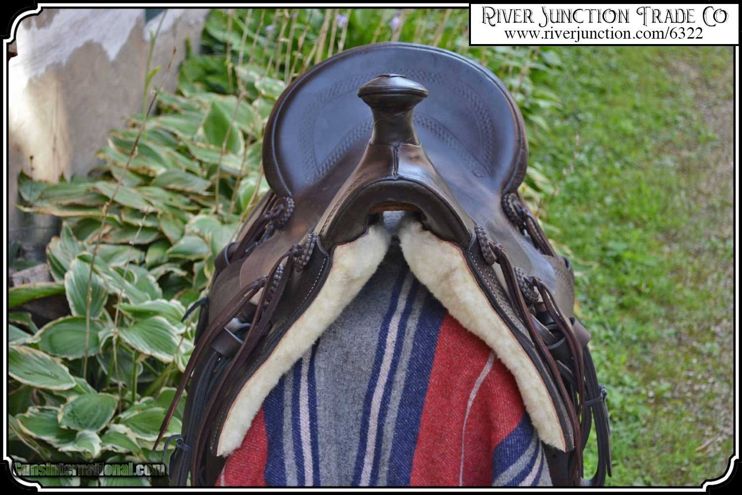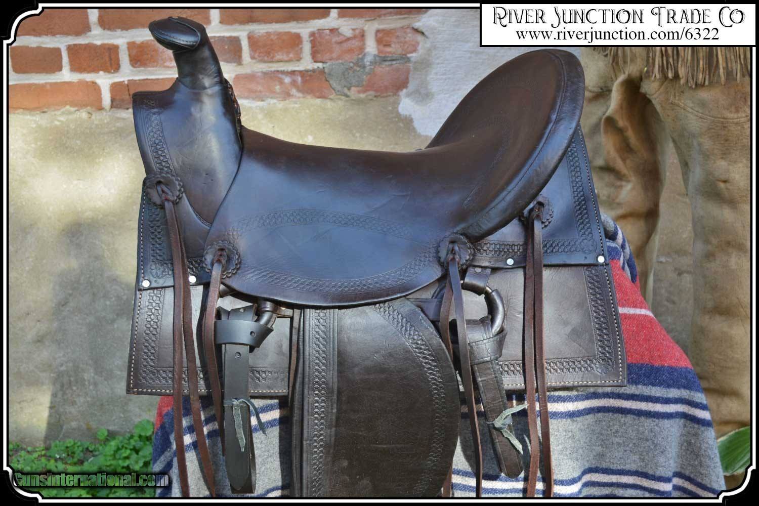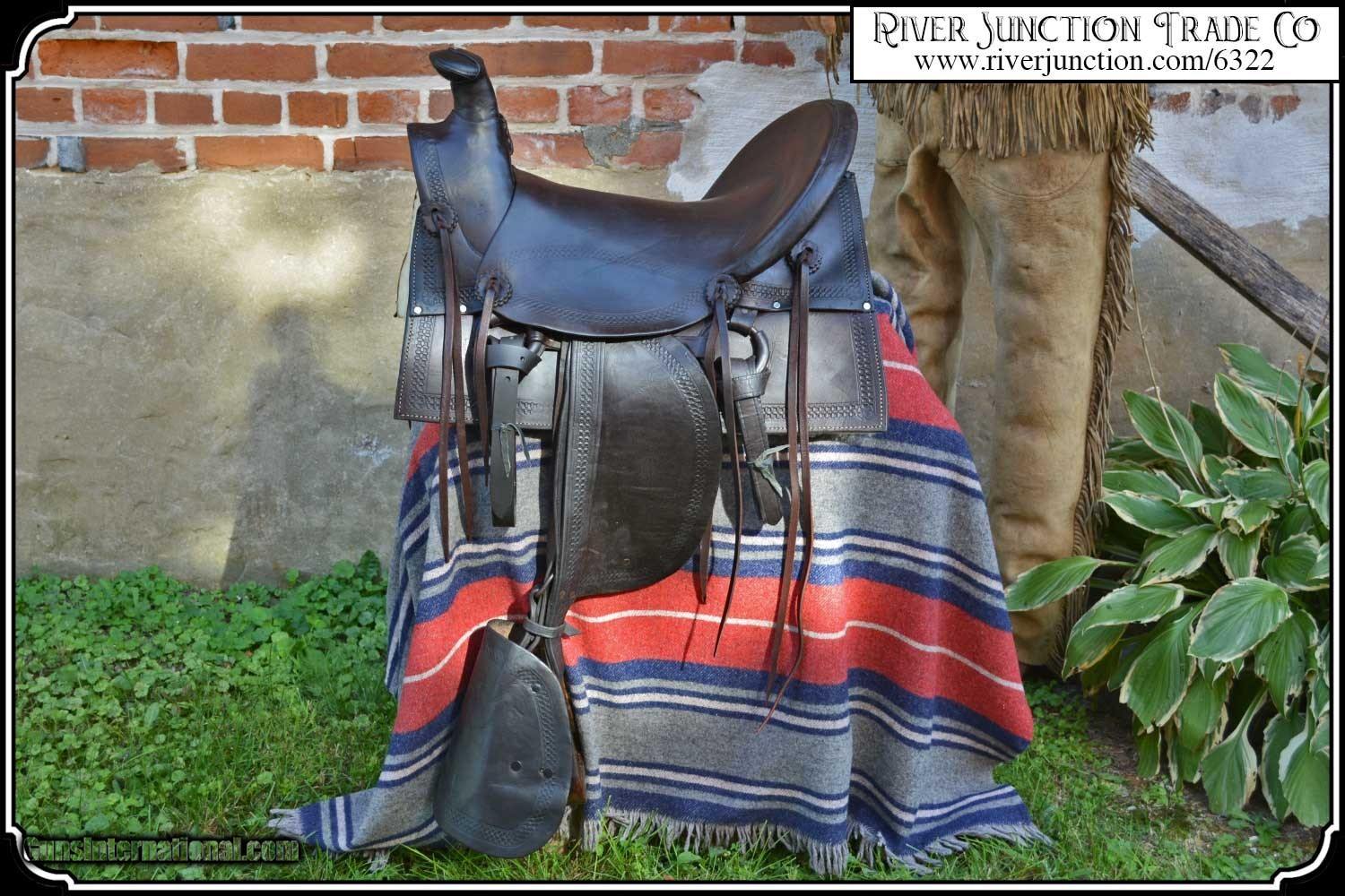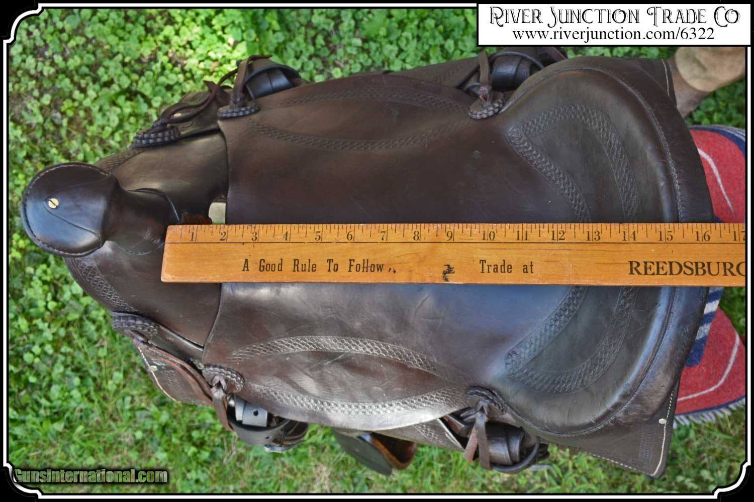 Description: What a nice piece of history! This saddle shows original, roller boarder stamping on all major parts. The saddle seat measurements are 15" seat / Fenders 14" long and Antique hand made wooden Western doghouse stirrups 5" wide x 5" high. The left stirrup has a vintage repair. This repair is very sound and we choose to clean and check it. We have left it as a testament of years of service once provided. This saddle has been completely restored by "Montana Ed". The beautiful condition of this saddle does not show its true age. It has a scant few handling marks from daily use. It is ready to ride with only the addition of cinches for its double rigging. A classic Old West Cowboy Saddle that would add an air of authenticity to any western decor. The leather tie strings have all been replaced. There is litterly no surface cracking a great rarity on these old saddles. The tree is solid and true. The fenders are well preserved and the tooling well-defined. New fleece has been added and is thick and very usable. All stitching has been redone through the original stitching holes and is tight and secure. You can count on this saddle to provide another century of service. I find no makers name on this saddle, and it was obviously done by a talented saddler. To have a saddle like this made new today would cost you $3000.00 plus. SAVVY SAYIN! Admire a big horse. Saddle a small one. Payment: Item, can be ordered on line with a credit card or paypal on our sight. Just Google (riverjunction) and type in the River Junction Trade Co. item number (6322) in the search box. Before you checkout you will see shipping cost and total. OR If you prefer: Pay by cash, postal money order, cashiers check, personal & business checks. We wait for checks to clear. We always answer questions and entertain offers. Have questions? Call me 563-880-4588. Jim SOLD |
