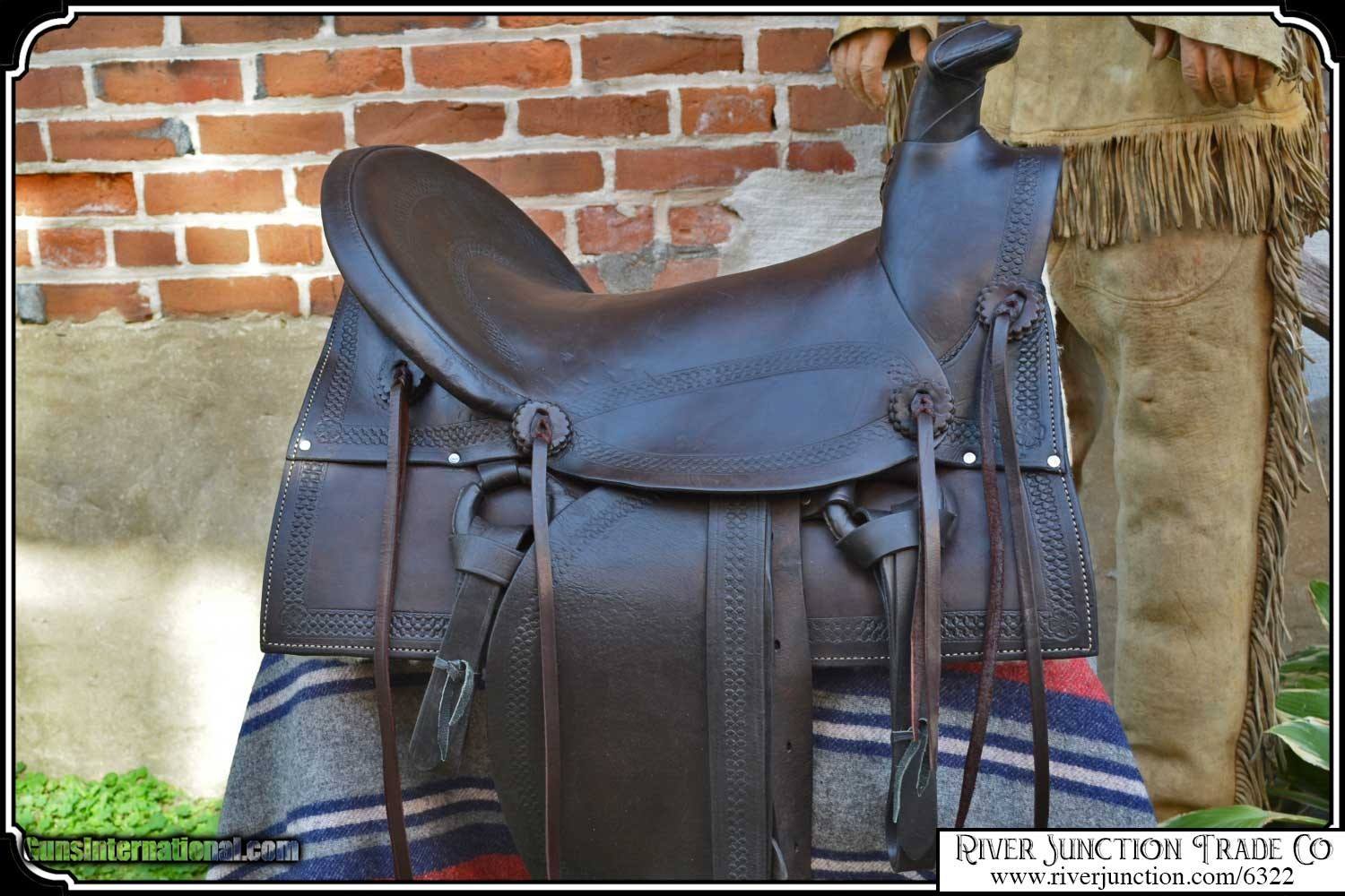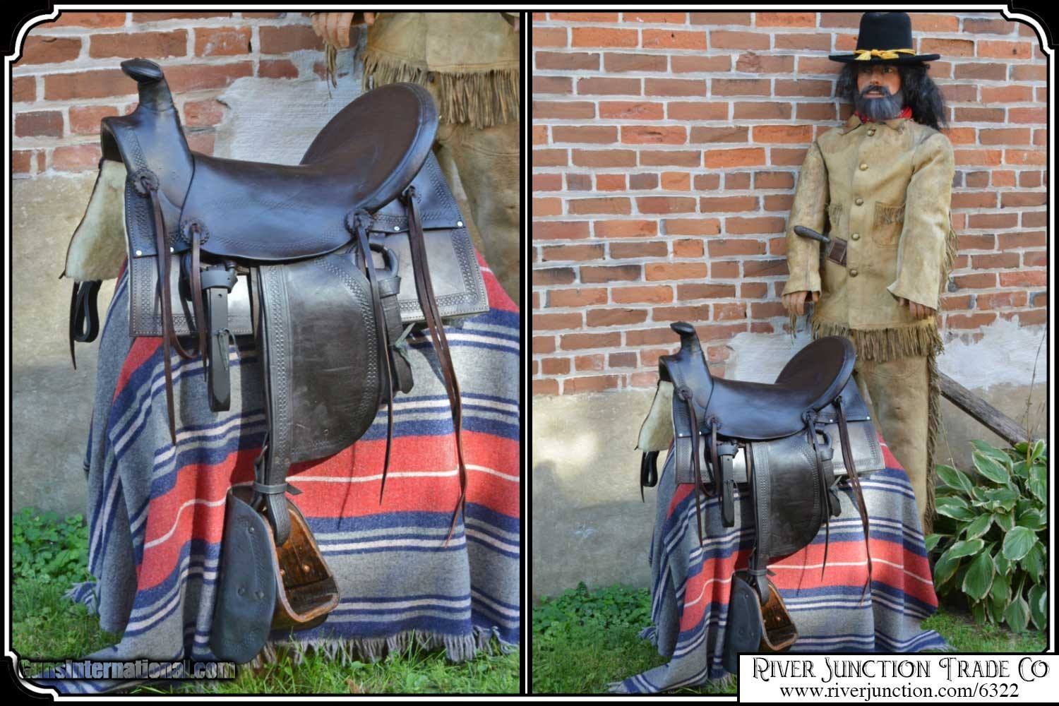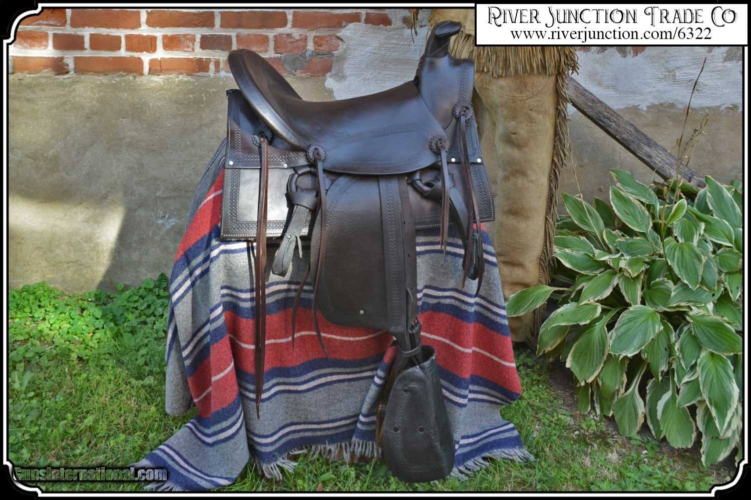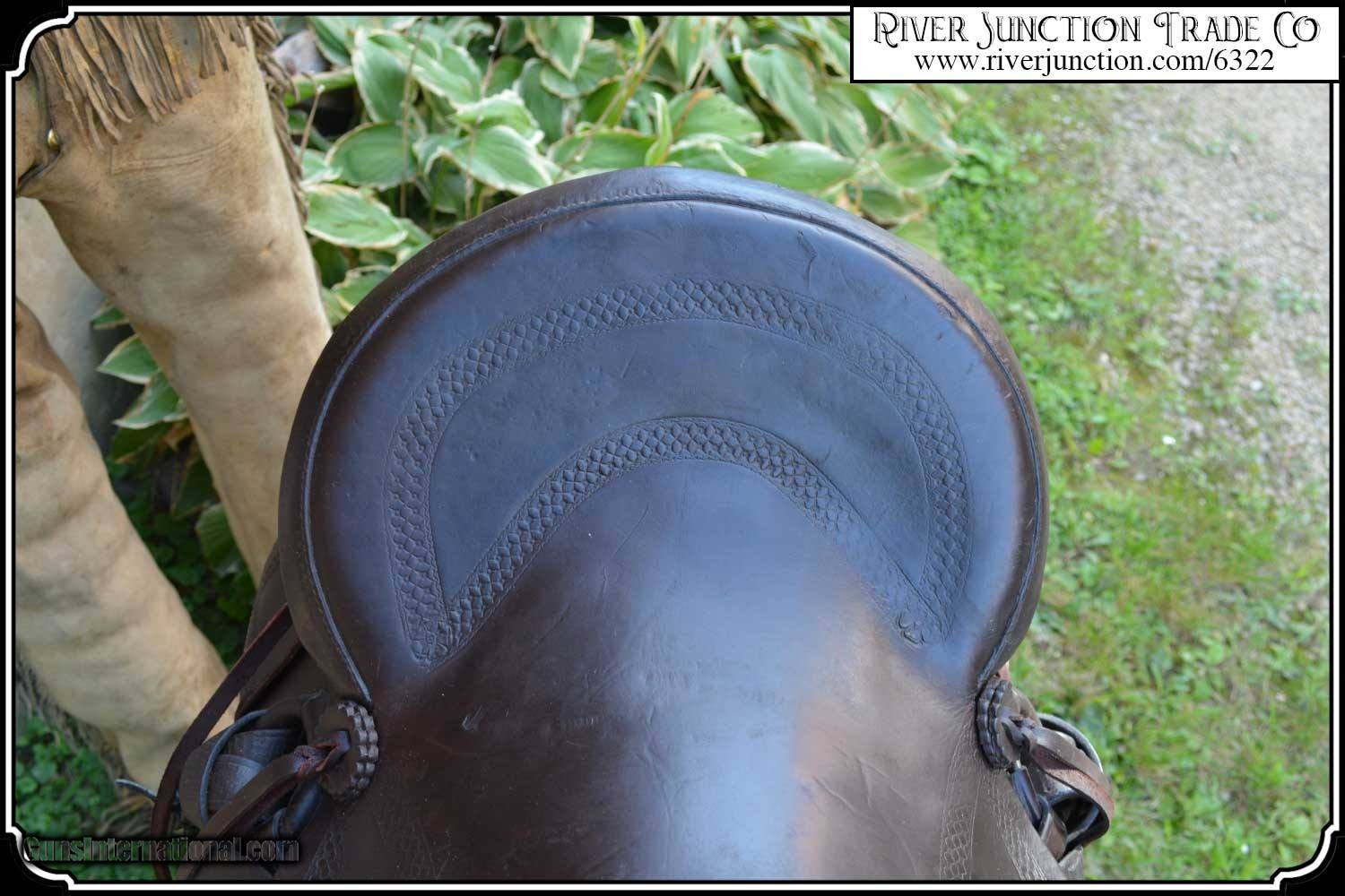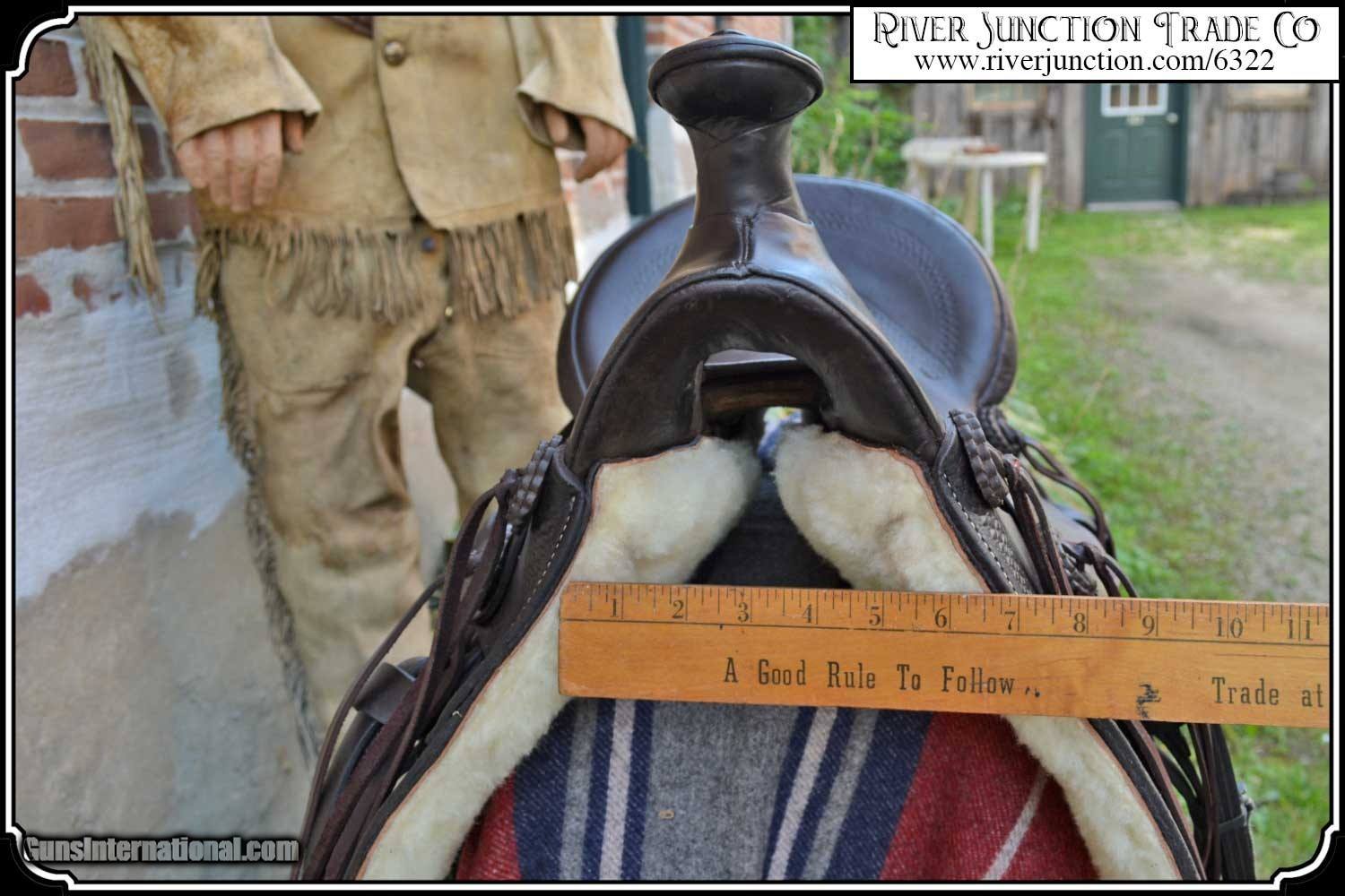 Description: What a nice piece of history! This saddle shows original, roller boarder stamping on all major parts. The saddle seat measurements are 15" seat / Fenders 14" long and Antique hand made wooden Western doghouse stirrups 5" wide x 5" high. The left stirrup has a vintage repair. This repair is very sound and we choose to clean and check it. We have left it as a testament of years of service once provided. This saddle has been completely restored by "Montana Ed". The beautiful condition of this saddle does not show its true age. It has a scant few handling marks from daily use. It is ready to ride with only the addition of cinches for its double rigging. A classic Old West Cowboy Saddle that would add an air of authenticity to any western decor. The leather tie strings have all been replaced. There is litterly no surface cracking a great rarity on these old saddles. The tree is solid and true. The fenders are well preserved and the tooling well-defined. New fleece has been added and is thick and very usable. All stitching has been redone through the original stitching holes and is tight and secure. You can count on this saddle to provide another century of service. I find no makers name on this saddle, and it was obviously done by a talented saddler. To have a saddle like this made new today would cost you $3000.00 plus. SAVVY SAYIN! Admire a big horse. Saddle a small one. Payment: Item, can be ordered on line with a credit card or paypal on our sight. Just Google (riverjunction) and type in the River Junction Trade Co. item number (6322) in the search box. Before you checkout you will see shipping cost and total. OR If you prefer: Pay by cash, postal money order, cashiers check, personal & business checks. We wait for checks to clear. We always answer questions and entertain offers. Have questions? Call me 563-880-4588. Jim SOLD |