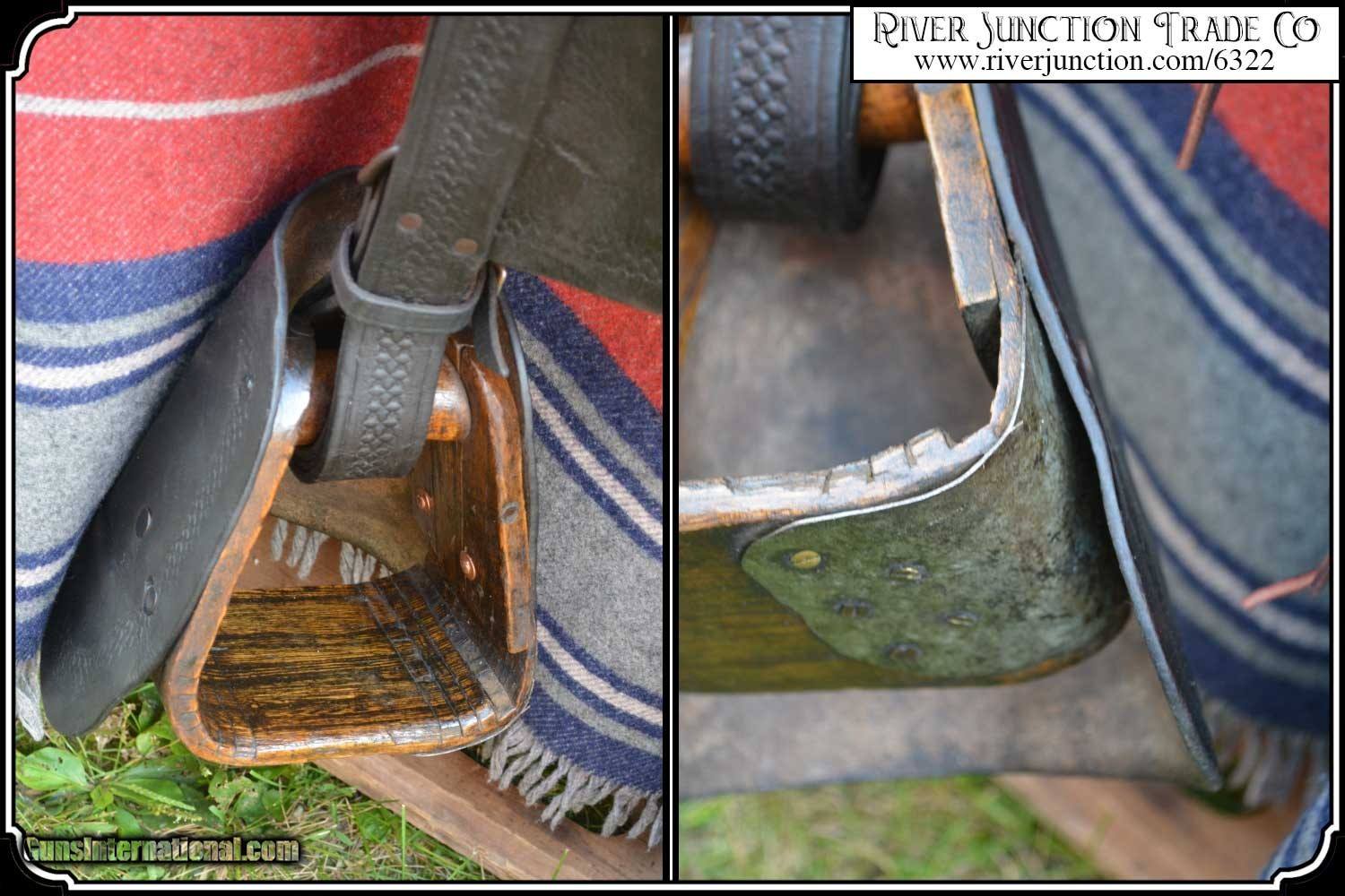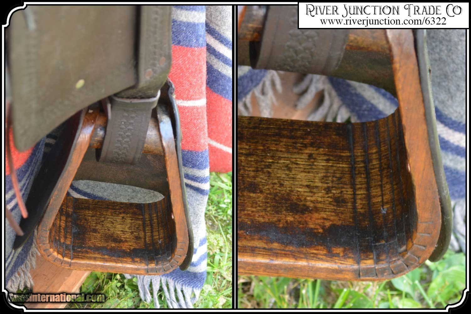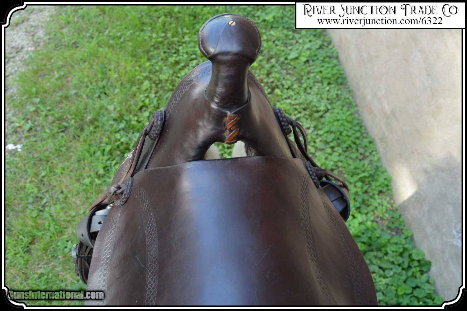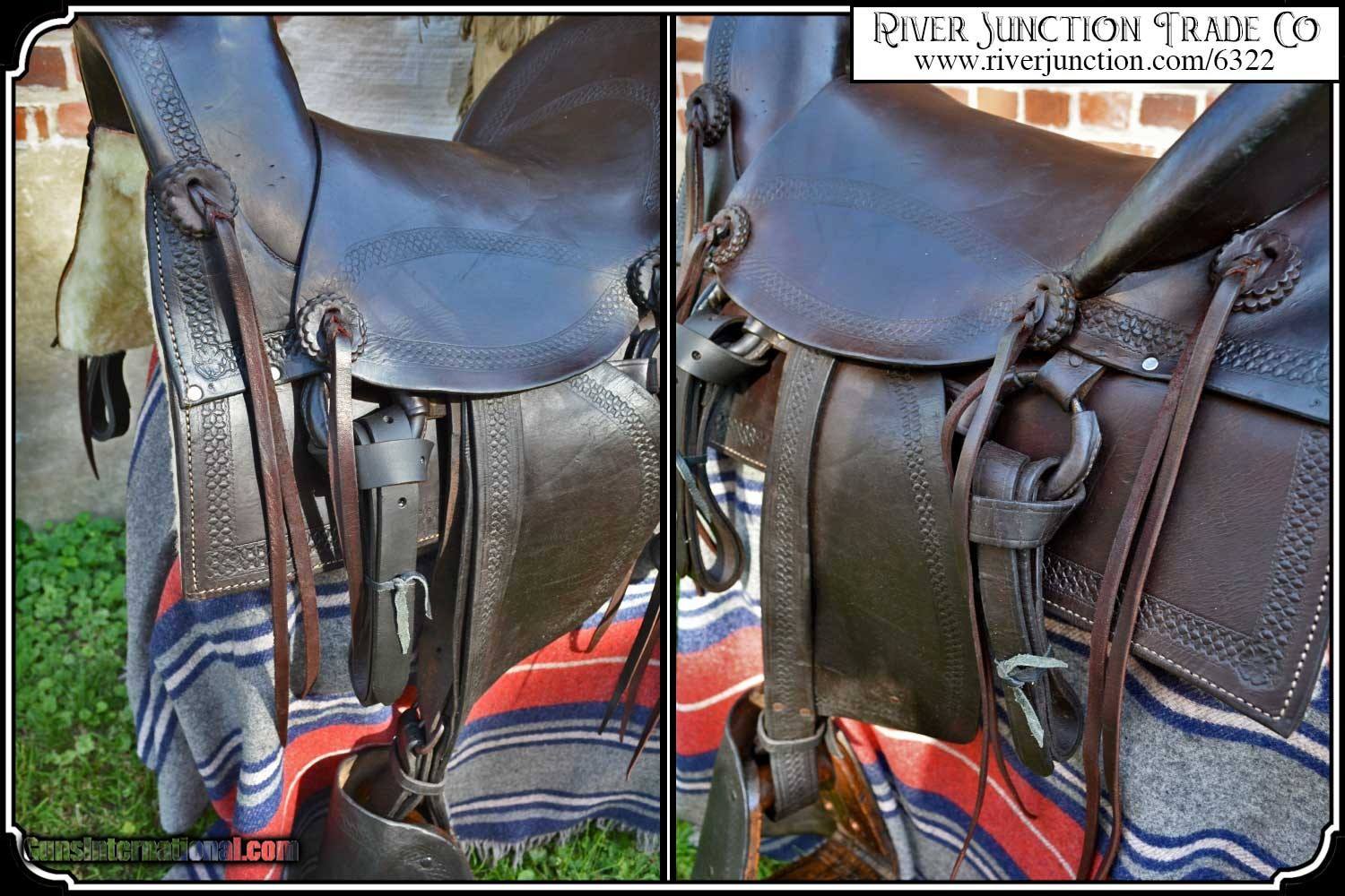 Description: What a nice piece of history! This saddle shows original, roller boarder stamping on all major parts. The saddle seat measurements are 15" seat / Fenders 14" long and Antique hand made wooden Western doghouse stirrups 5" wide x 5" high. The left stirrup has a vintage repair. This repair is very sound and we choose to clean and check it. We have left it as a testament of years of service once provided. This saddle has been completely restored by "Montana Ed". The beautiful condition of this saddle does not show its true age. It has a scant few handling marks from daily use. It is ready to ride with only the addition of cinches for its double rigging. A classic Old West Cowboy Saddle that would add an air of authenticity to any western decor. The leather tie strings have all been replaced. There is litterly no surface cracking a great rarity on these old saddles. The tree is solid and true. The fenders are well preserved and the tooling well-defined. New fleece has been added and is thick and very usable. All stitching has been redone through the original stitching holes and is tight and secure. You can count on this saddle to provide another century of service. I find no makers name on this saddle, and it was obviously done by a talented saddler. To have a saddle like this made new today would cost you $3000.00 plus. SAVVY SAYIN! Admire a big horse. Saddle a small one. Payment: Item, can be ordered on line with a credit card or paypal on our sight. Just Google (riverjunction) and type in the River Junction Trade Co. item number (6322) in the search box. Before you checkout you will see shipping cost and total. OR If you prefer: Pay by cash, postal money order, cashiers check, personal & business checks. We wait for checks to clear. We always answer questions and entertain offers. Have questions? Call me 563-880-4588. Jim SOLD |