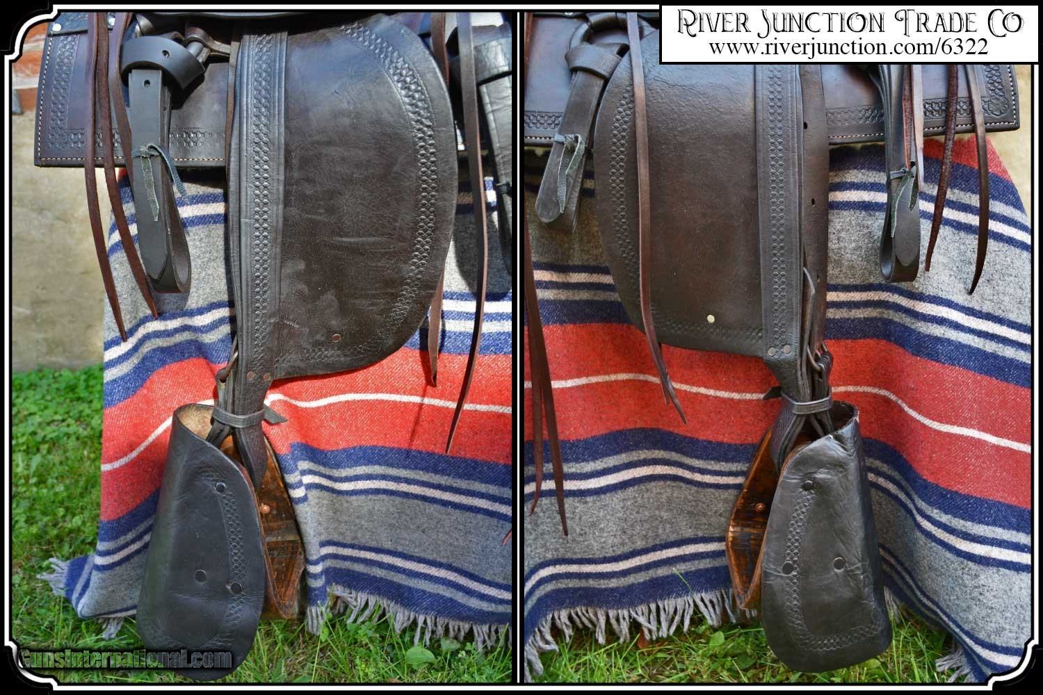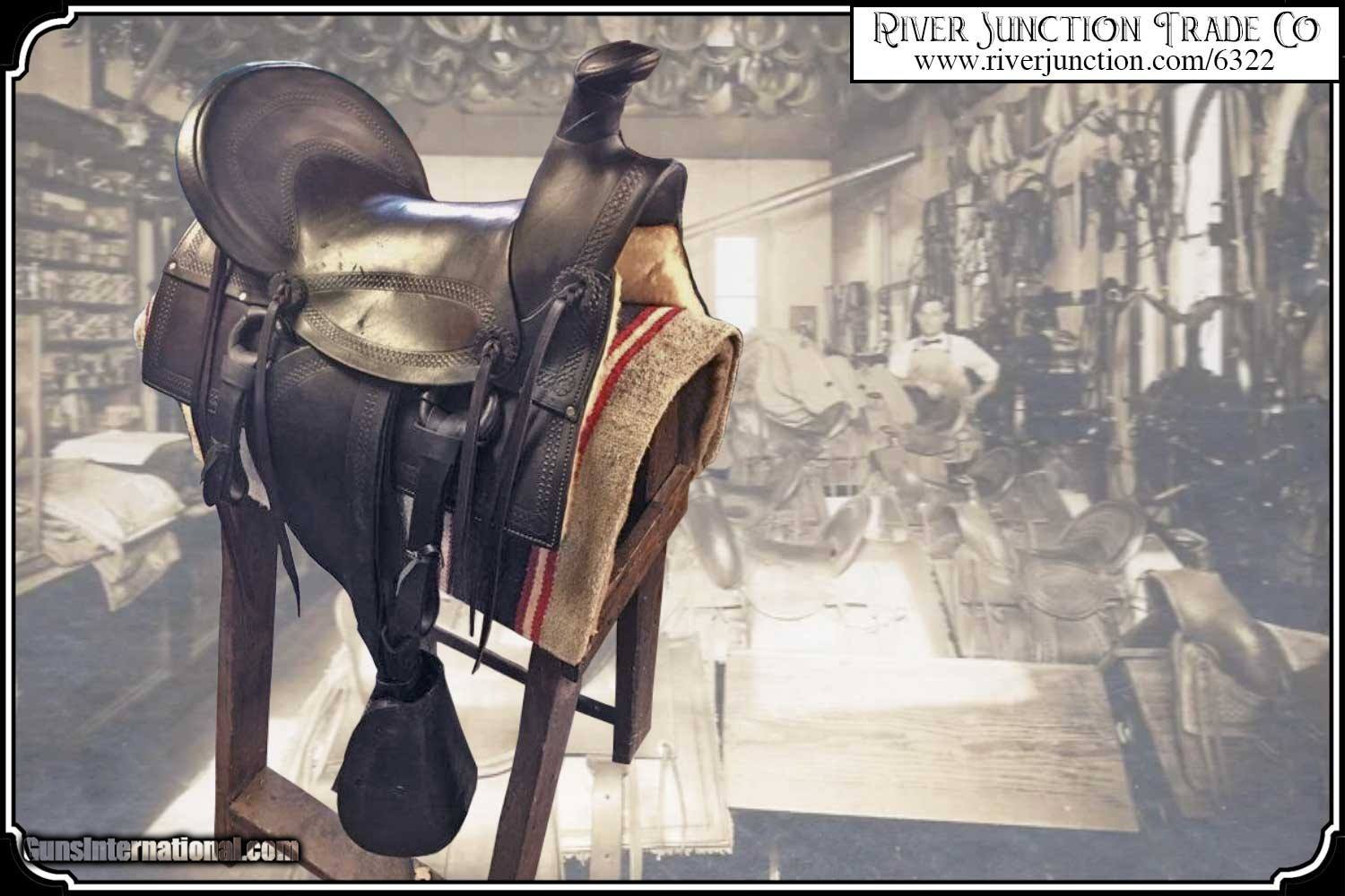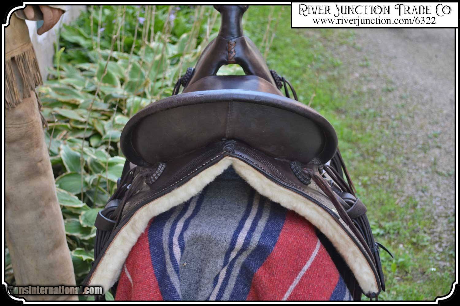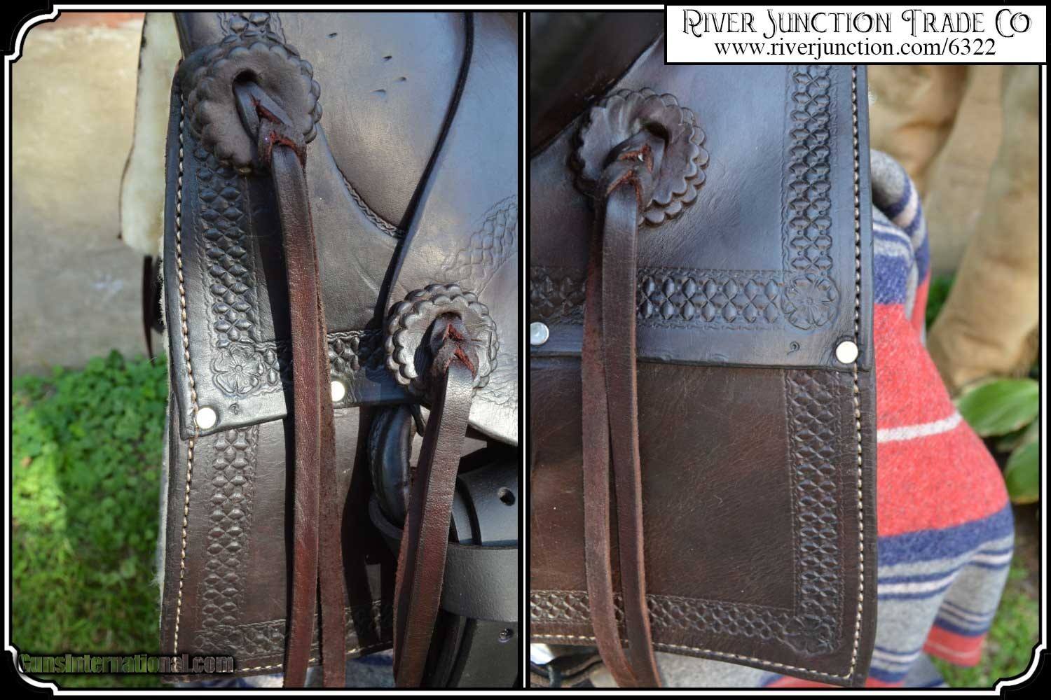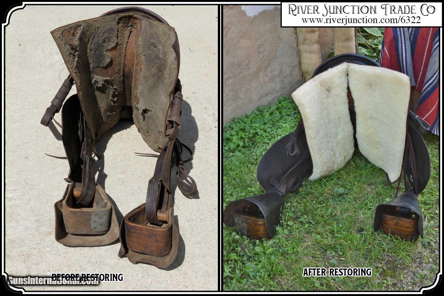 Description: What a nice piece of history! This saddle shows original, roller boarder stamping on all major parts. The saddle seat measurements are 15" seat / Fenders 14" long and Antique hand made wooden Western doghouse stirrups 5" wide x 5" high. The left stirrup has a vintage repair. This repair is very sound and we choose to clean and check it. We have left it as a testament of years of service once provided. This saddle has been completely restored by "Montana Ed". The beautiful condition of this saddle does not show its true age. It has a scant few handling marks from daily use. It is ready to ride with only the addition of cinches for its double rigging. A classic Old West Cowboy Saddle that would add an air of authenticity to any western decor. The leather tie strings have all been replaced. There is litterly no surface cracking a great rarity on these old saddles. The tree is solid and true. The fenders are well preserved and the tooling well-defined. New fleece has been added and is thick and very usable. All stitching has been redone through the original stitching holes and is tight and secure. You can count on this saddle to provide another century of service. I find no makers name on this saddle, and it was obviously done by a talented saddler. To have a saddle like this made new today would cost you $3000.00 plus. SAVVY SAYIN! Admire a big horse. Saddle a small one. Payment: Item, can be ordered on line with a credit card or paypal on our sight. Just Google (riverjunction) and type in the River Junction Trade Co. item number (6322) in the search box. Before you checkout you will see shipping cost and total. OR If you prefer: Pay by cash, postal money order, cashiers check, personal & business checks. We wait for checks to clear. We always answer questions and entertain offers. Have questions? Call me 563-880-4588. Jim SOLD |