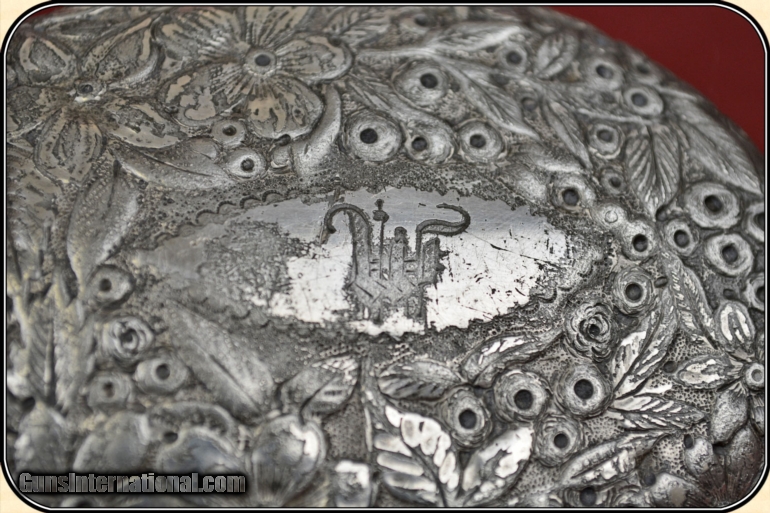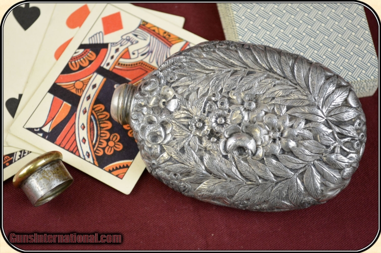 Description: A fine 19th century American repousse pewter silver plated flask, circa 1860 Civil War era. A bulbous oval form with a weighty feel in the hand. It has the lid which is often missing on these early flasks. The rich floral repousse is in very good shape, not caved in as so many of these pewter flasks are. The back does show some dents and silver wear. SIZE: 5 inches Height x 3 inches Width. x 1" Thickness. CONDITION: normal wear consistent with age, overall clean and in good condition. Will need a new cork seal in the lid to prevent leaking. MARKINGS: Repousse designs. No manufactures marking present. SOLD |