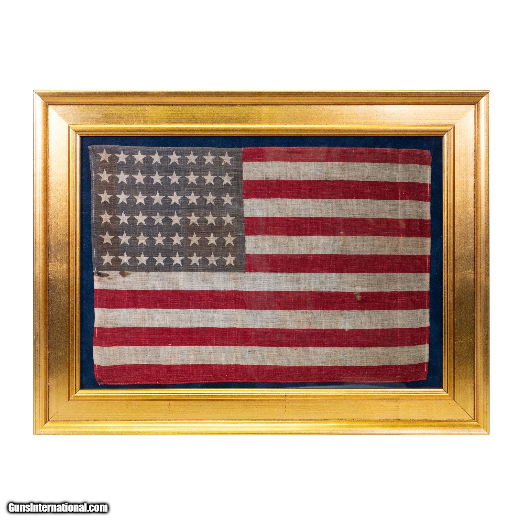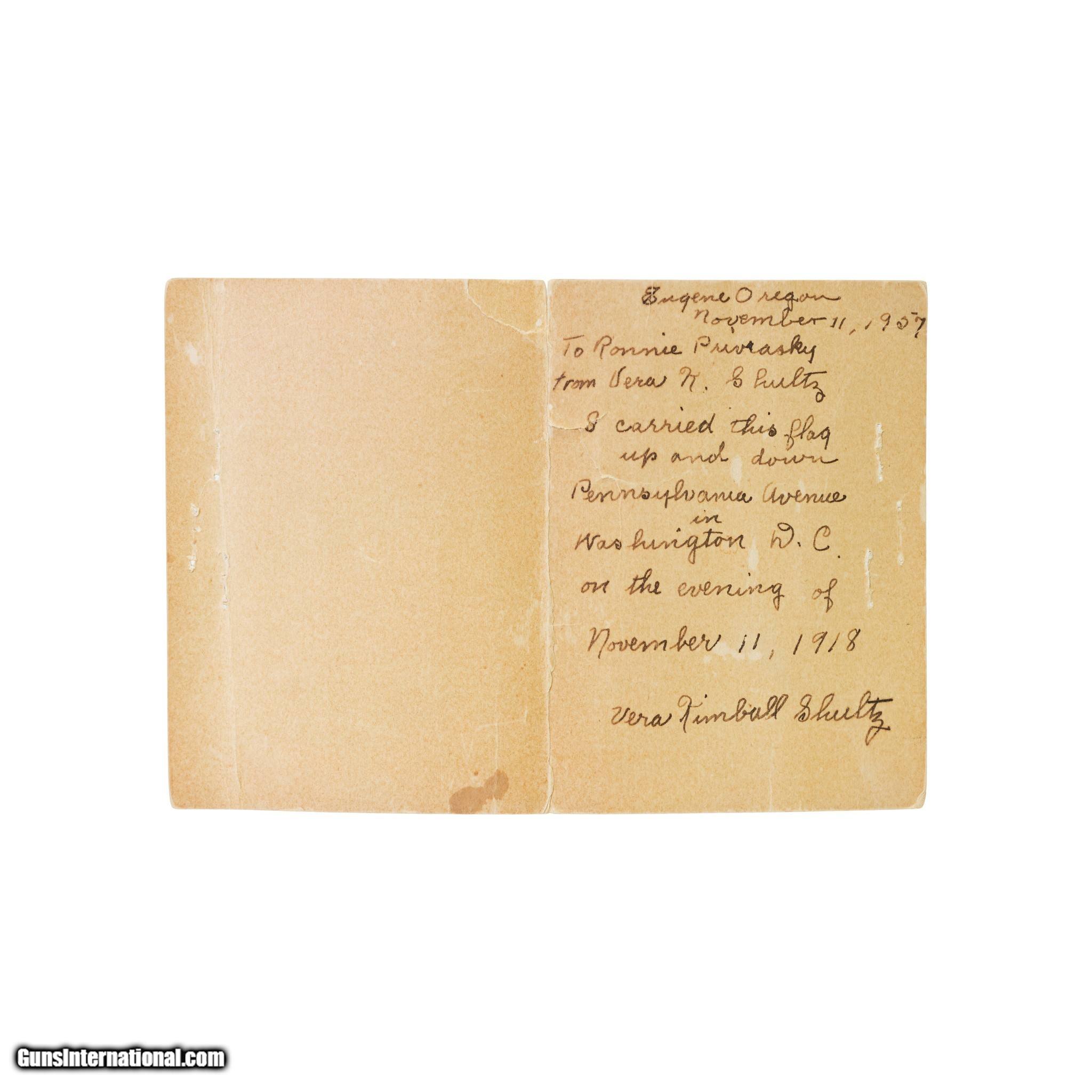 Description: 48 star Arizona statehood flag. Arizona gained statehood on February 14, 1912. Printed flag on cotton. Notation on staff "Souvenir of St. Mary's Junior Dance January 29, 1938." Period flags are common. This is the star count widely known to most Americans when they think of an "antique" flag. Because this is the flag that most grandparents and great grandparents would have from their youth, it is commonly found in estate sales and among the possessions of veterans of World War I, World War II and the Korean War. President Taft's executive order of June 24, 1912, which standardized the canton of the stars on the flag to 6 even rows of 8 stars makes unusual star configurations relatively uncommon and often indicative of an early flag. A card that was included "Eugene Oregon November 11, 1957. To Ronnie Prubasky from Vera K. Shultz. I carried this flag up and down Pennsylvania Avenue in Washington DC on the evening of November 11, 1918. Kara Kimball Shultz." Ex. Richard Pierce. 17 1/2" x 11 1/2". SOLD |