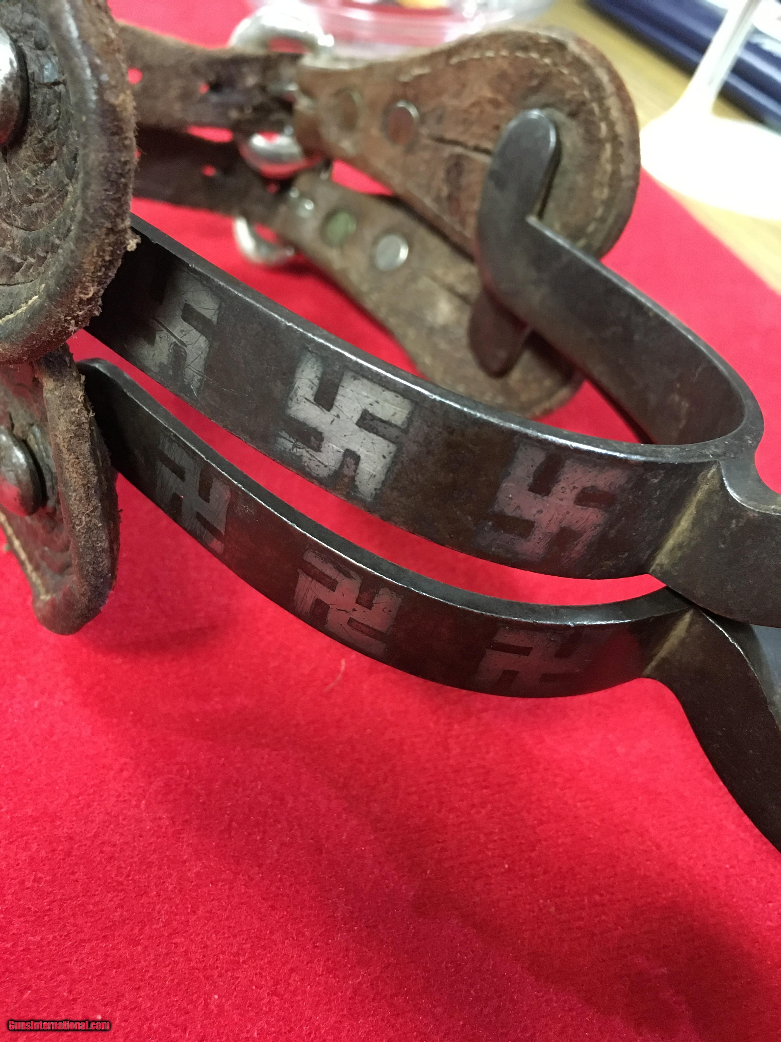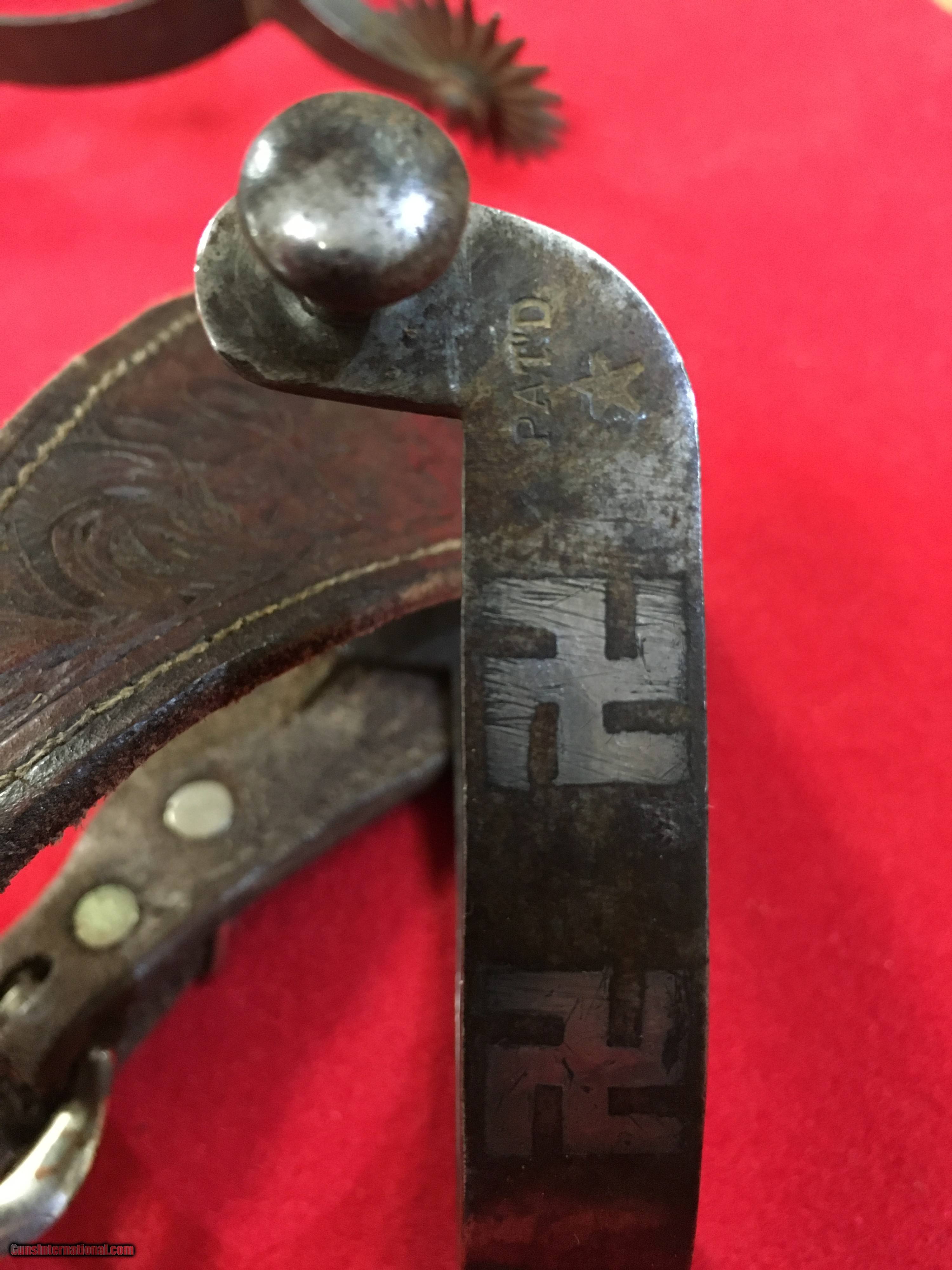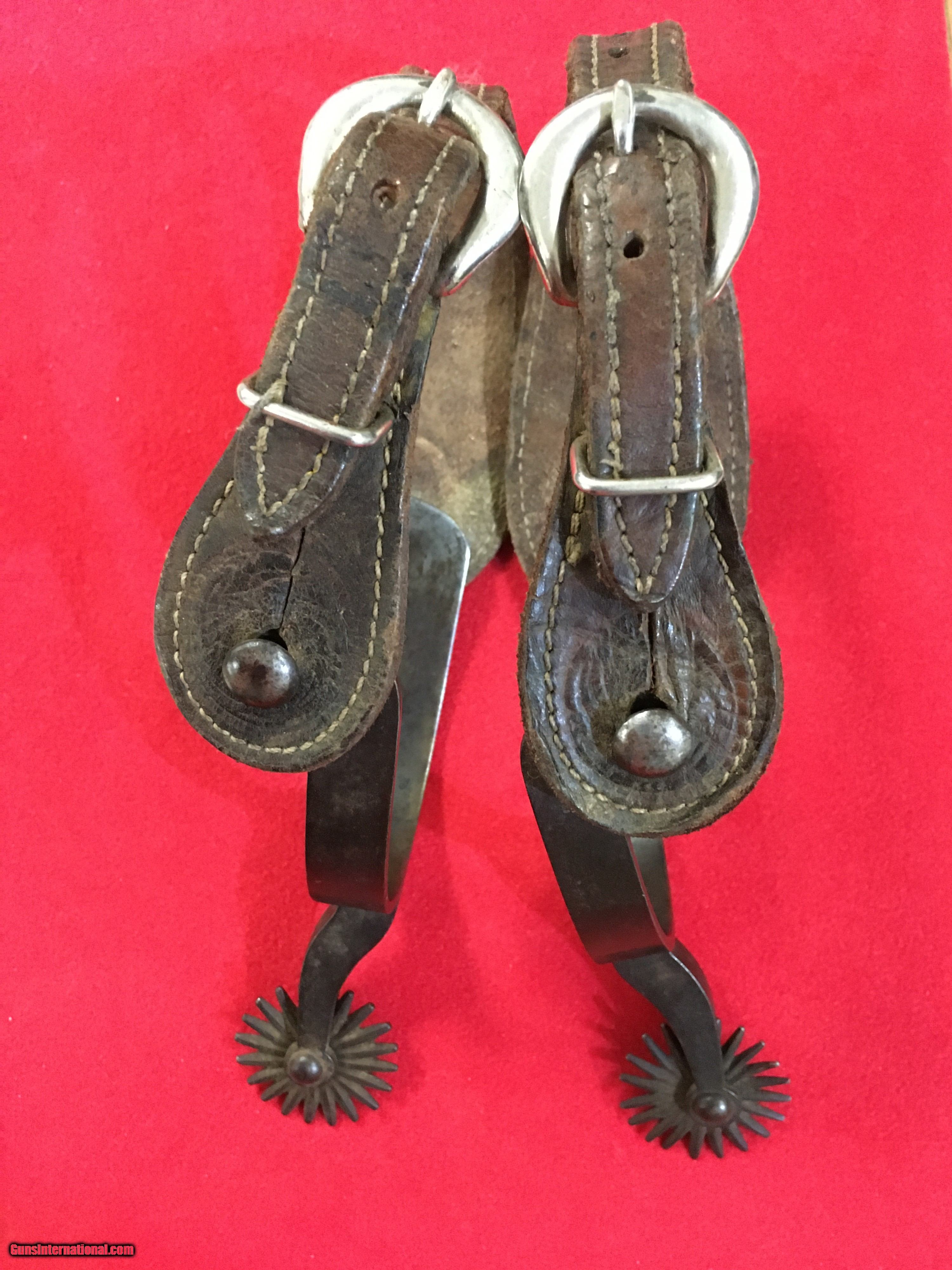 Description: Rare August Buermann "Whirling Logs" Indian Good Luck Symbol Silver Inlaid Single Mount Spurs & Orig. Leathers. SOLD |