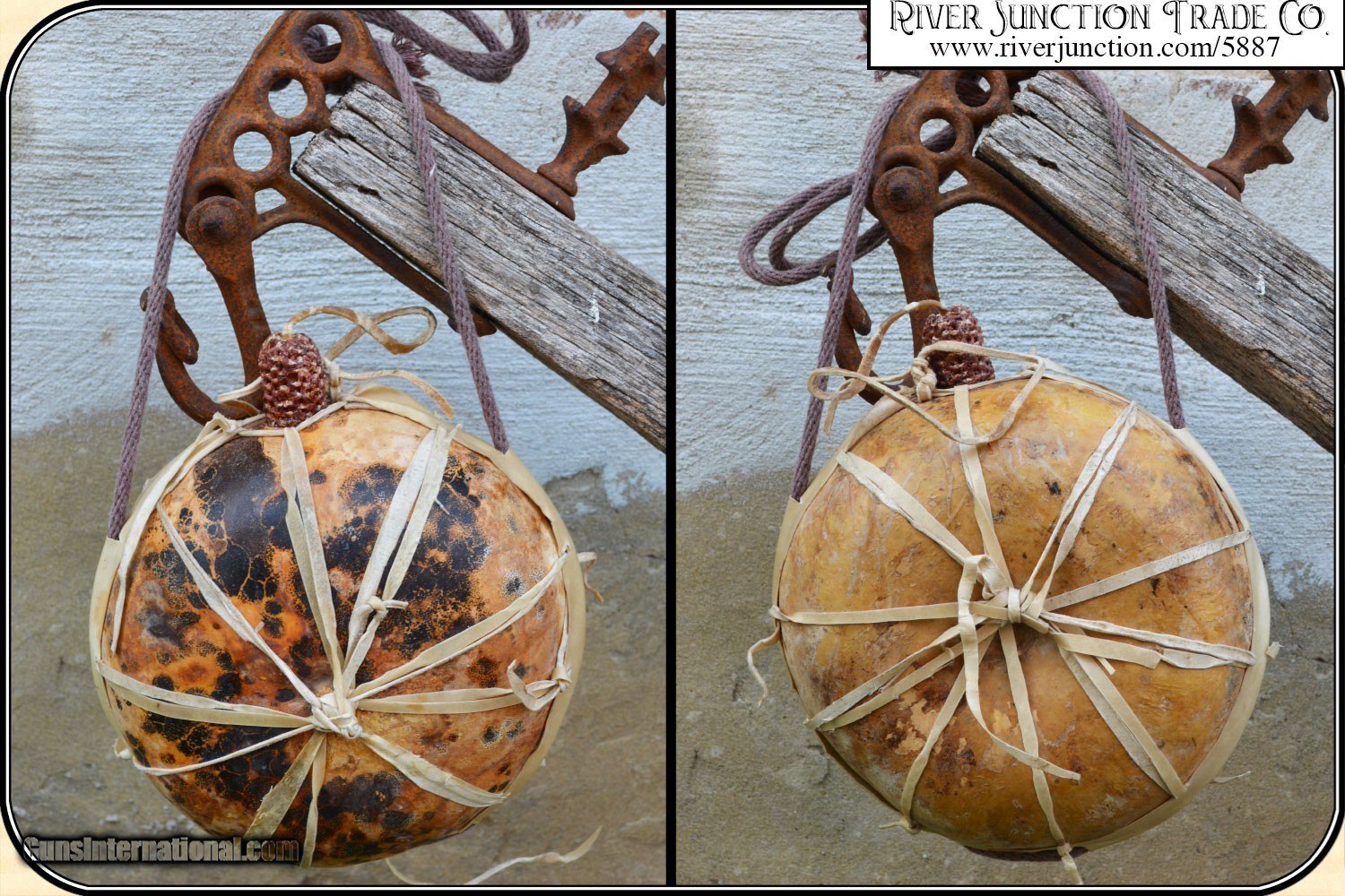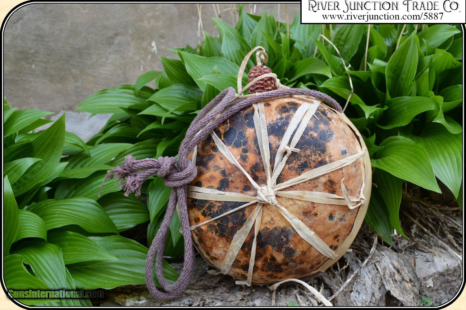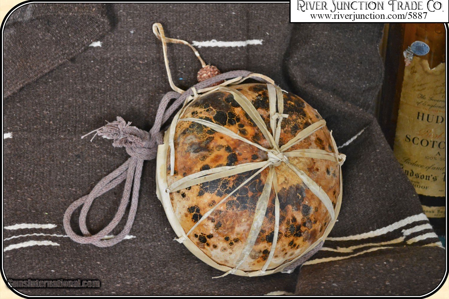 Description: Authentic Gourd Canteen The perfect historically correct gourd canteen features genuine rawhide reinforcement. Includes a rope carrying strap. Each gourd canteen water bottle is hand-made in the U.S.A. - supply is limited! The Canteen measures approximately 8” to 8 1/2” in diameter. and has no spout just like the original native made canteens. That allows them to be completely drain so that they remain fresh. These vessels are double-coated on the inside with paraffin wax. The outside of the canteen is cinched with a rawhide band. A corn Cobb stopper is waxed and fit to the mouth of the canteen. Payment: Item, can be ordered on line with a credit card or paypal on our sight. Just Google (riverjunction) and type in the River Junction Trade Co. item number (5887) in the search box. Before you checkout you will see shipping cost and total. OR If you prefer: Pay by cash, postal money order, cashiers check, personal & business checks. We wait for checks to clear. We always answer questions and entertain offers. Have questions? Call me 563-880-4588. Jim SOLD |