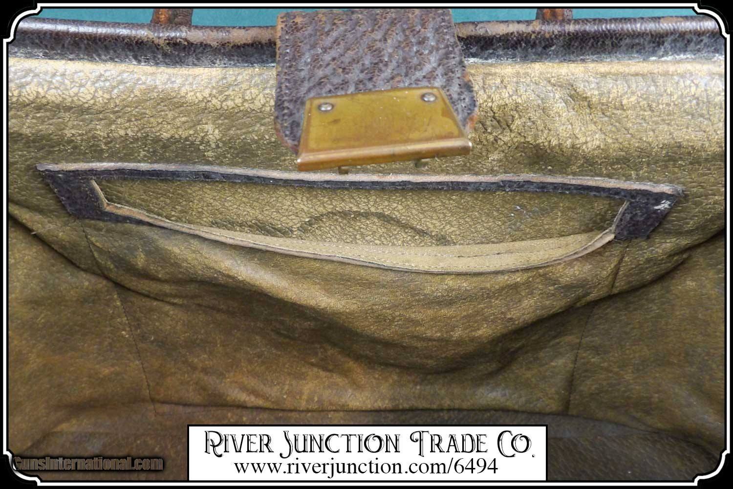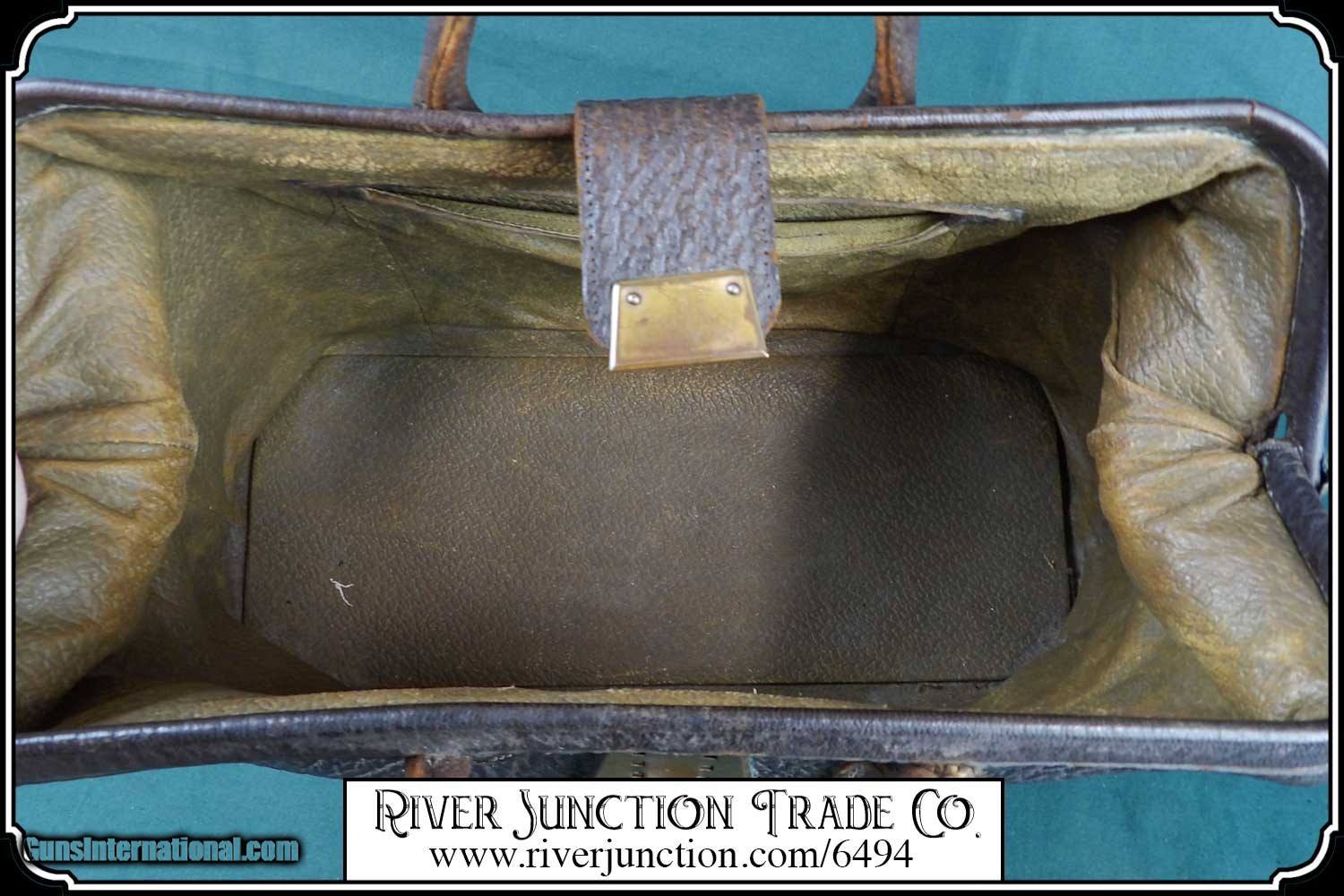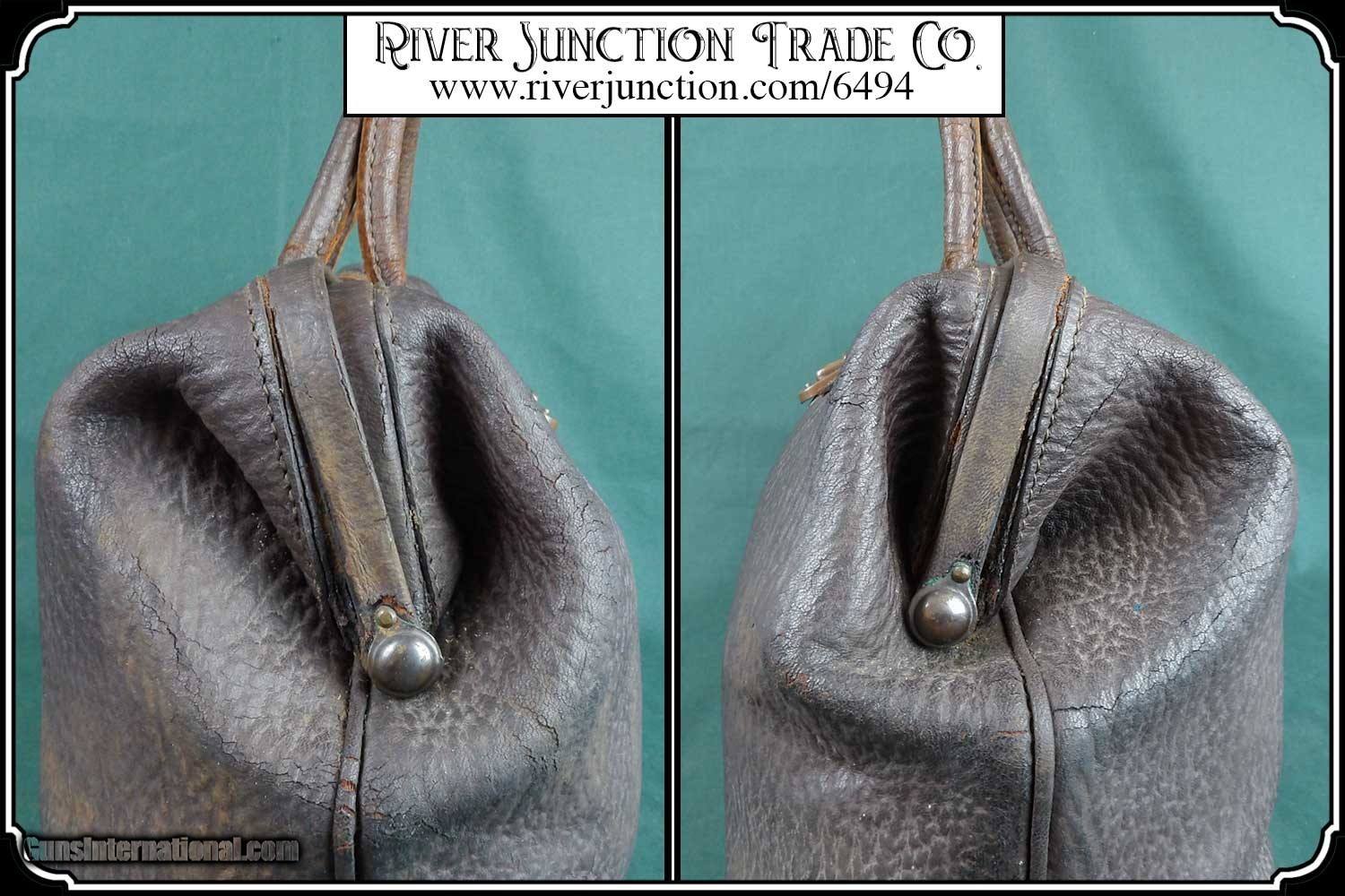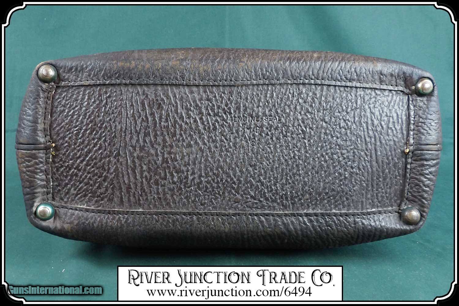 Description: What a great bag. I can think of 100+ uses for it. Doctor's bag, burglar's tool bag, gun tote bag for holster, belt and ammo. Or Gamblers bag. With cards, chips, dice, small cheating devices, a deadly push dagger or brass knuckles to use as your 5th ACE.I hunt for these bags for my customers. I think this is THE NICEST ONE I HAVE EVER FOUND. An antique leather bag made of strong brown leather with a nice patina. THE LEATHER IS FULLY ALIVE WITH ALL STITCHES TIGHT AND INTACT. These bags were mostly used up in the 19th century only a few survive. To find one that is usable and with the handles solidly attached is near impossible. Great for any display or Civil War or Victorian re-enactor. The Leather strap closer clasp functions as it should, though the key is missing. The inside buck tan leather lining is all intact. There is one nice sized inner pocket, able to hold your flask and a pair of sleeve garters or anything else you may need. The Leather Handles are strong and holding just as strong. The stamp on the bottom reads "Genuine Seal” with the number 16 over an 8. Dimensions : 17” x 9” x 10” approx. With handles height 13". This antique leather bag is in very good top condition, and remains fully usable for your travels! Other items are not included. Payment: Item, can be ordered on line with a credit card or paypal on our sight. Just Google (riverjunction) and type in the River Junction Trade Co. item number (6494) in the search box. Before you checkout you will see shipping cost and total. OR If you prefer: Pay by cash, postal money order, cashiers check, personal & business checks. We wait for checks to clear. We always answer questions and entertain offers. Have questions? Call me 563-880-4588. Jim SOLD |