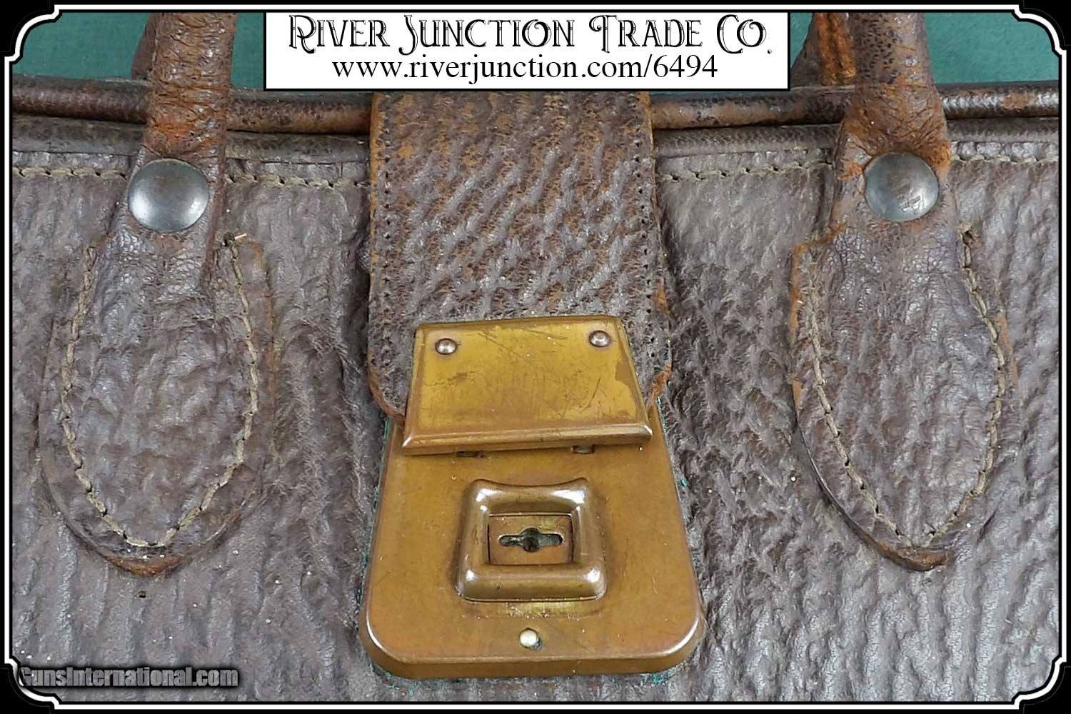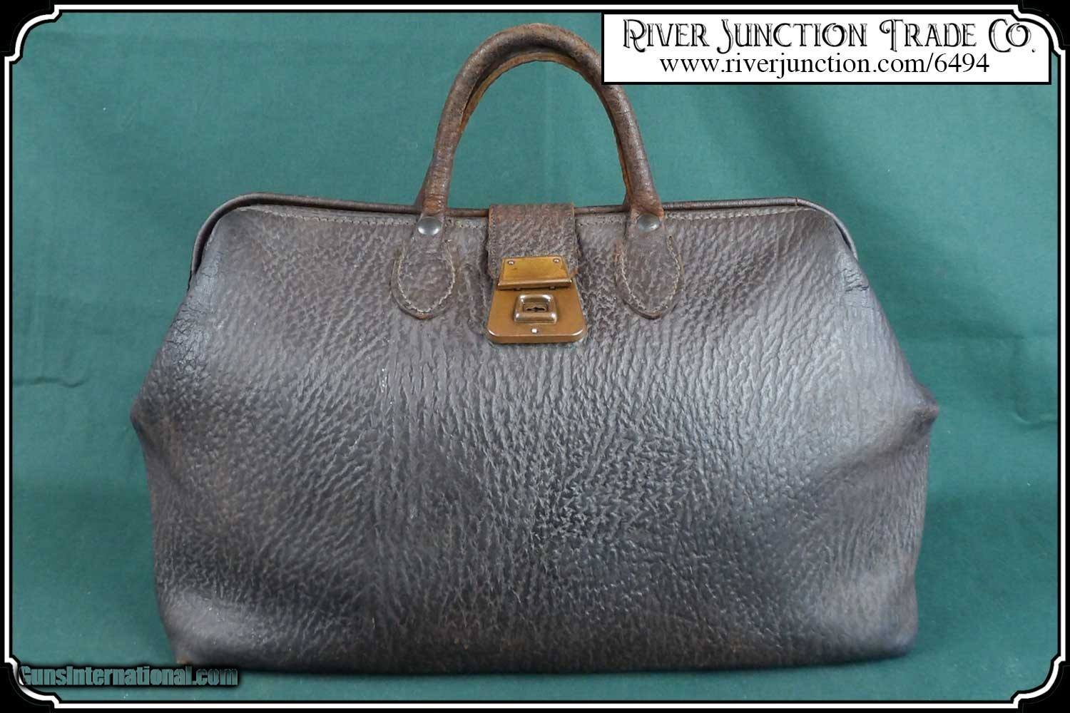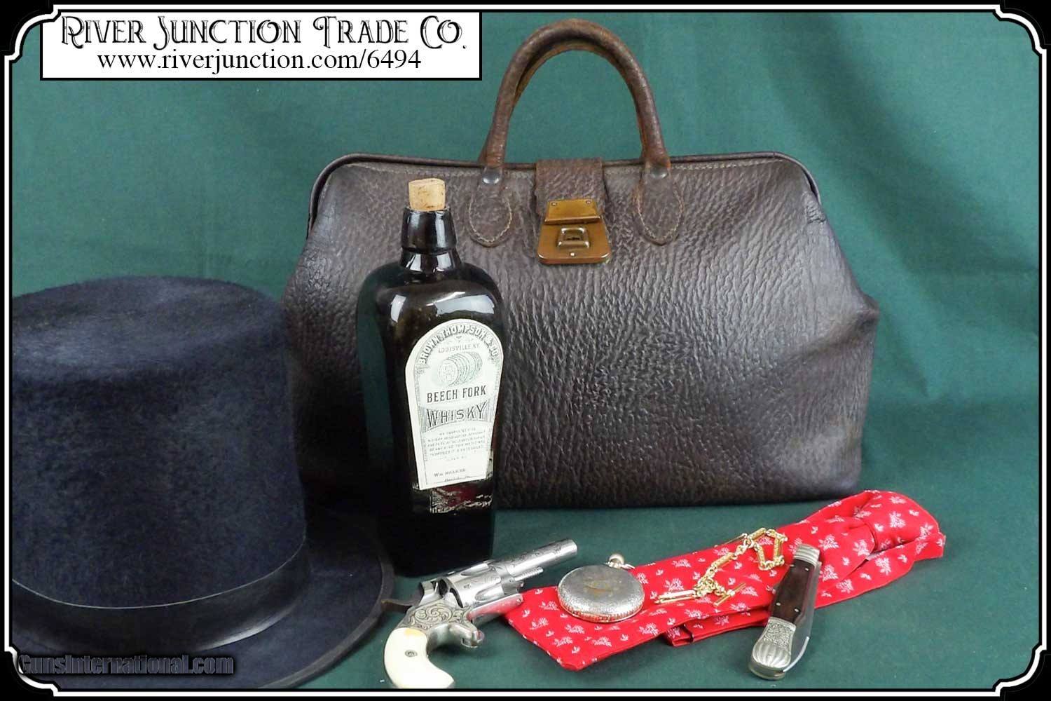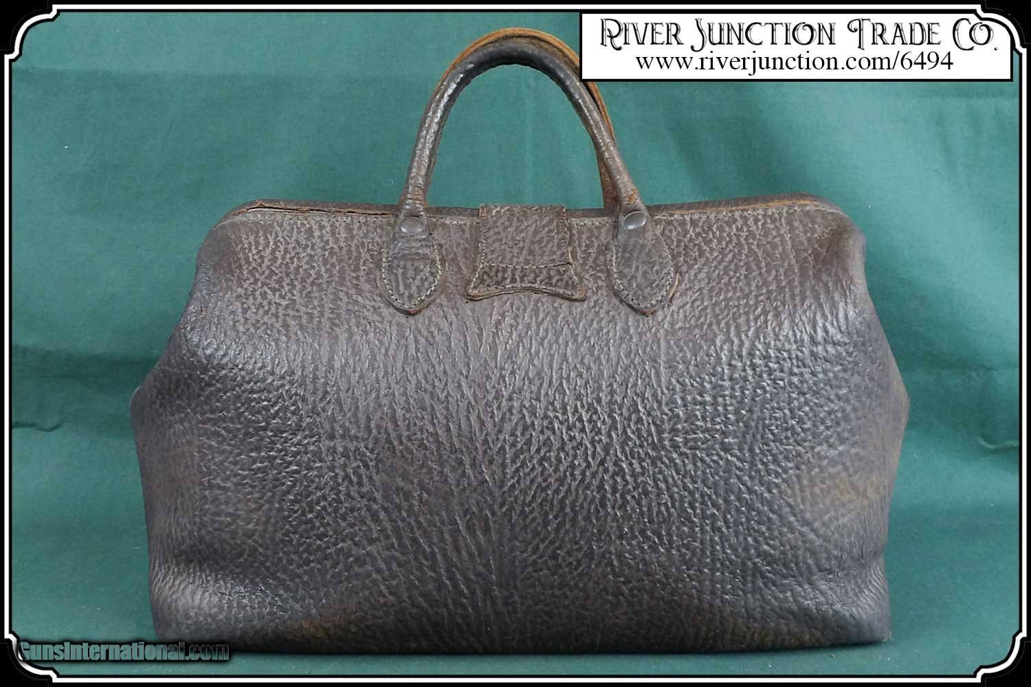 Description: What a great bag. I can think of 100+ uses for it. Doctor's bag, burglar's tool bag, gun tote bag for holster, belt and ammo. Or Gamblers bag. With cards, chips, dice, small cheating devices, a deadly push dagger or brass knuckles to use as your 5th ACE.I hunt for these bags for my customers. I think this is THE NICEST ONE I HAVE EVER FOUND. An antique leather bag made of strong brown leather with a nice patina. THE LEATHER IS FULLY ALIVE WITH ALL STITCHES TIGHT AND INTACT. These bags were mostly used up in the 19th century only a few survive. To find one that is usable and with the handles solidly attached is near impossible. Great for any display or Civil War or Victorian re-enactor. The Leather strap closer clasp functions as it should, though the key is missing. The inside buck tan leather lining is all intact. There is one nice sized inner pocket, able to hold your flask and a pair of sleeve garters or anything else you may need. The Leather Handles are strong and holding just as strong. The stamp on the bottom reads "Genuine Seal” with the number 16 over an 8. Dimensions : 17” x 9” x 10” approx. With handles height 13". This antique leather bag is in very good top condition, and remains fully usable for your travels! Other items are not included. Payment: Item, can be ordered on line with a credit card or paypal on our sight. Just Google (riverjunction) and type in the River Junction Trade Co. item number (6494) in the search box. Before you checkout you will see shipping cost and total. OR If you prefer: Pay by cash, postal money order, cashiers check, personal & business checks. We wait for checks to clear. We always answer questions and entertain offers. Have questions? Call me 563-880-4588. Jim SOLD |