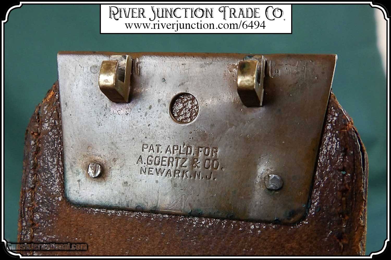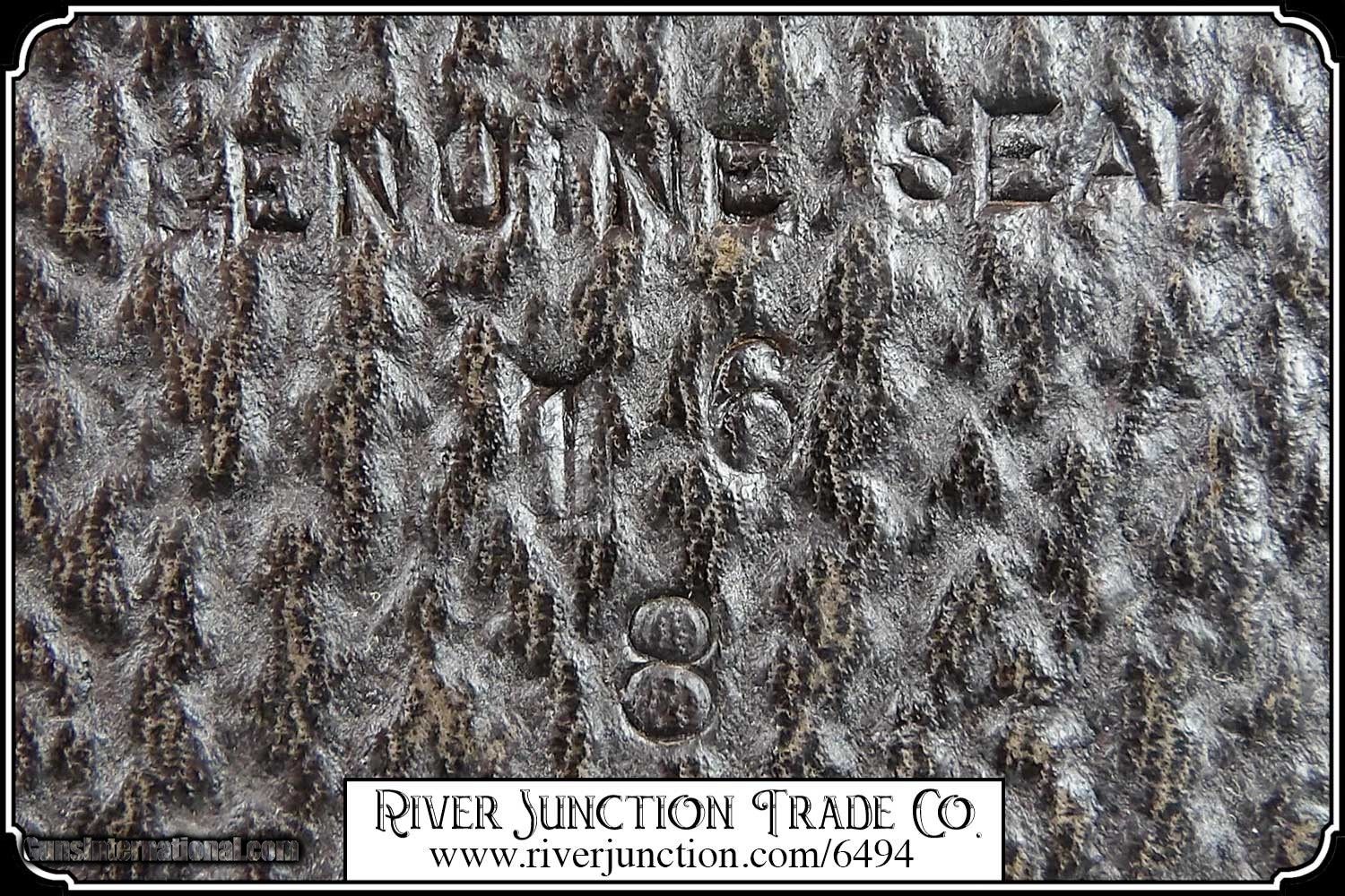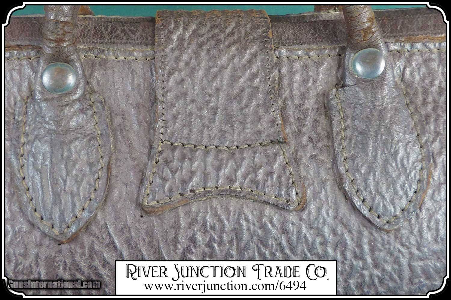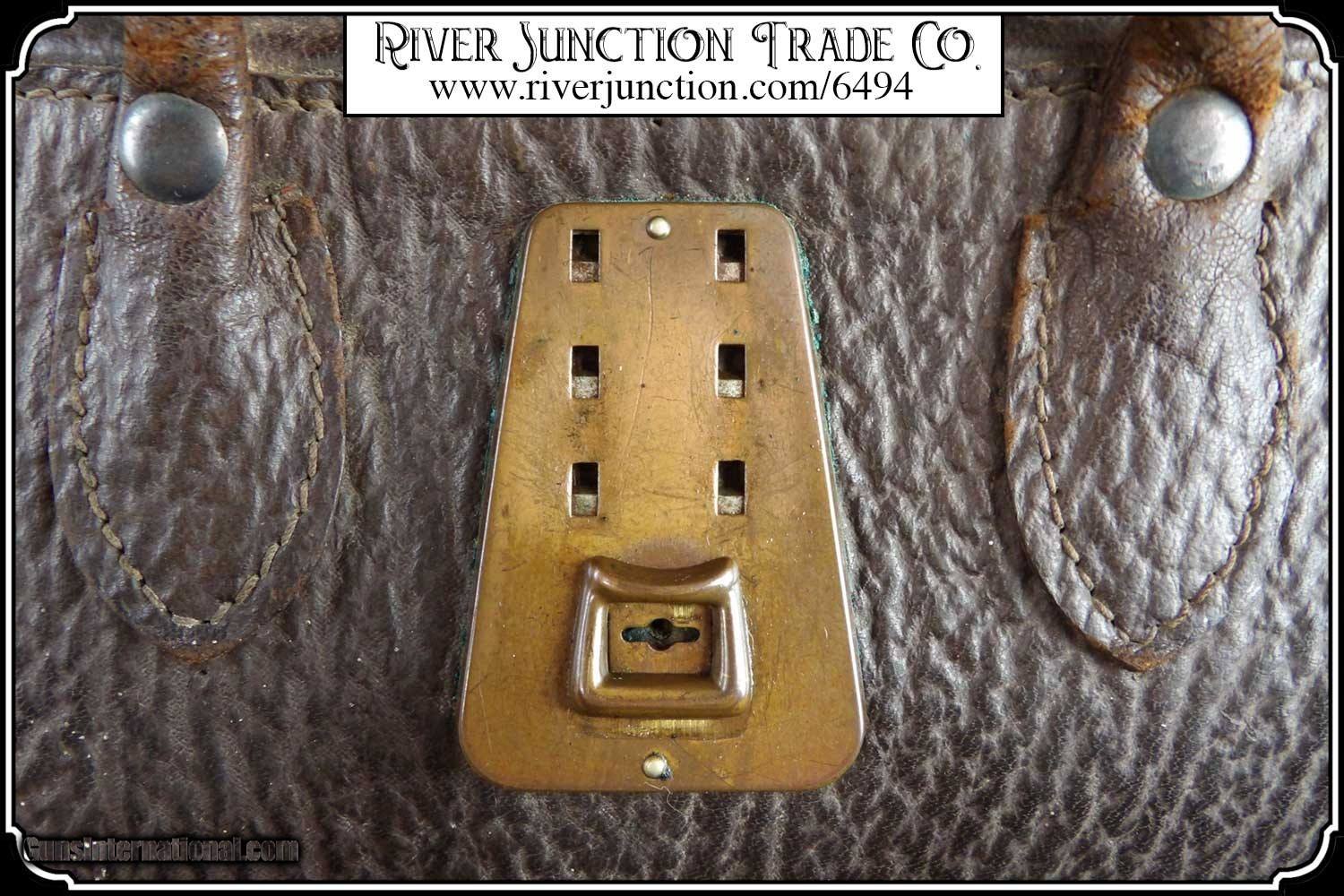 Description: What a great bag. I can think of 100+ uses for it. Doctor's bag, burglar's tool bag, gun tote bag for holster, belt and ammo. Or Gamblers bag. With cards, chips, dice, small cheating devices, a deadly push dagger or brass knuckles to use as your 5th ACE.I hunt for these bags for my customers. I think this is THE NICEST ONE I HAVE EVER FOUND. An antique leather bag made of strong brown leather with a nice patina. THE LEATHER IS FULLY ALIVE WITH ALL STITCHES TIGHT AND INTACT. These bags were mostly used up in the 19th century only a few survive. To find one that is usable and with the handles solidly attached is near impossible. Great for any display or Civil War or Victorian re-enactor. The Leather strap closer clasp functions as it should, though the key is missing. The inside buck tan leather lining is all intact. There is one nice sized inner pocket, able to hold your flask and a pair of sleeve garters or anything else you may need. The Leather Handles are strong and holding just as strong. The stamp on the bottom reads "Genuine Seal” with the number 16 over an 8. Dimensions : 17” x 9” x 10” approx. With handles height 13". This antique leather bag is in very good top condition, and remains fully usable for your travels! Other items are not included. Payment: Item, can be ordered on line with a credit card or paypal on our sight. Just Google (riverjunction) and type in the River Junction Trade Co. item number (6494) in the search box. Before you checkout you will see shipping cost and total. OR If you prefer: Pay by cash, postal money order, cashiers check, personal & business checks. We wait for checks to clear. We always answer questions and entertain offers. Have questions? Call me 563-880-4588. Jim SOLD |