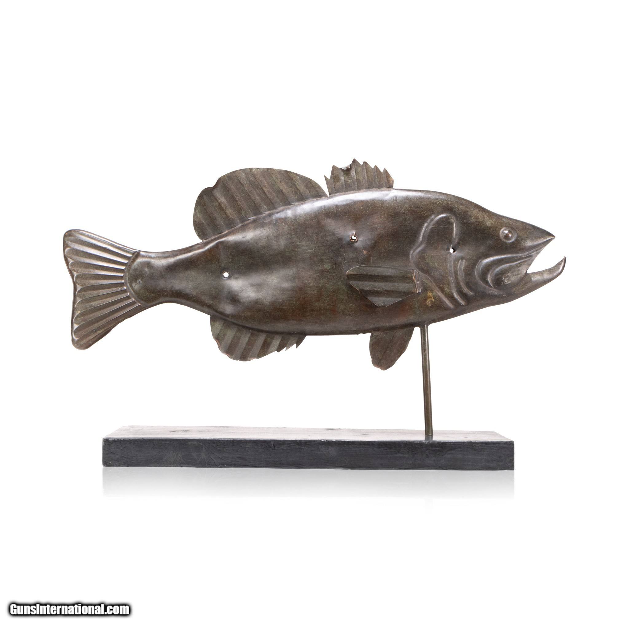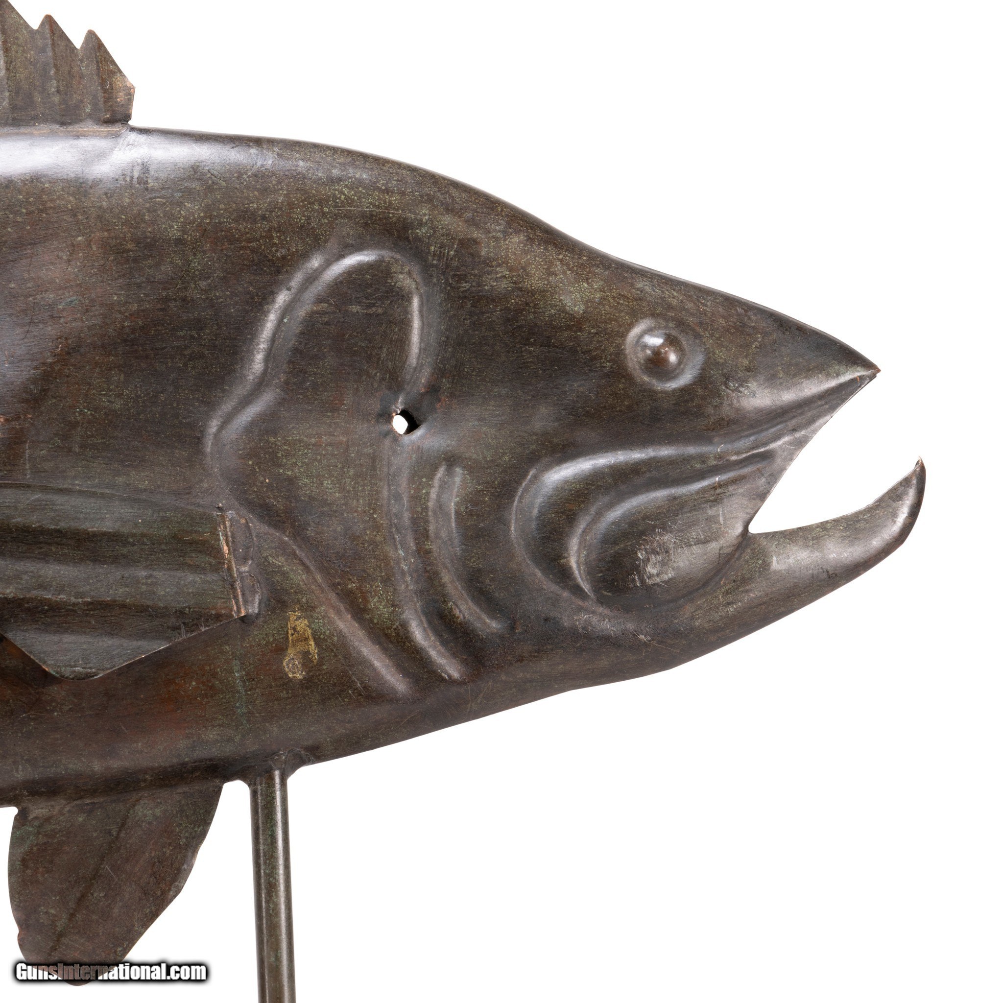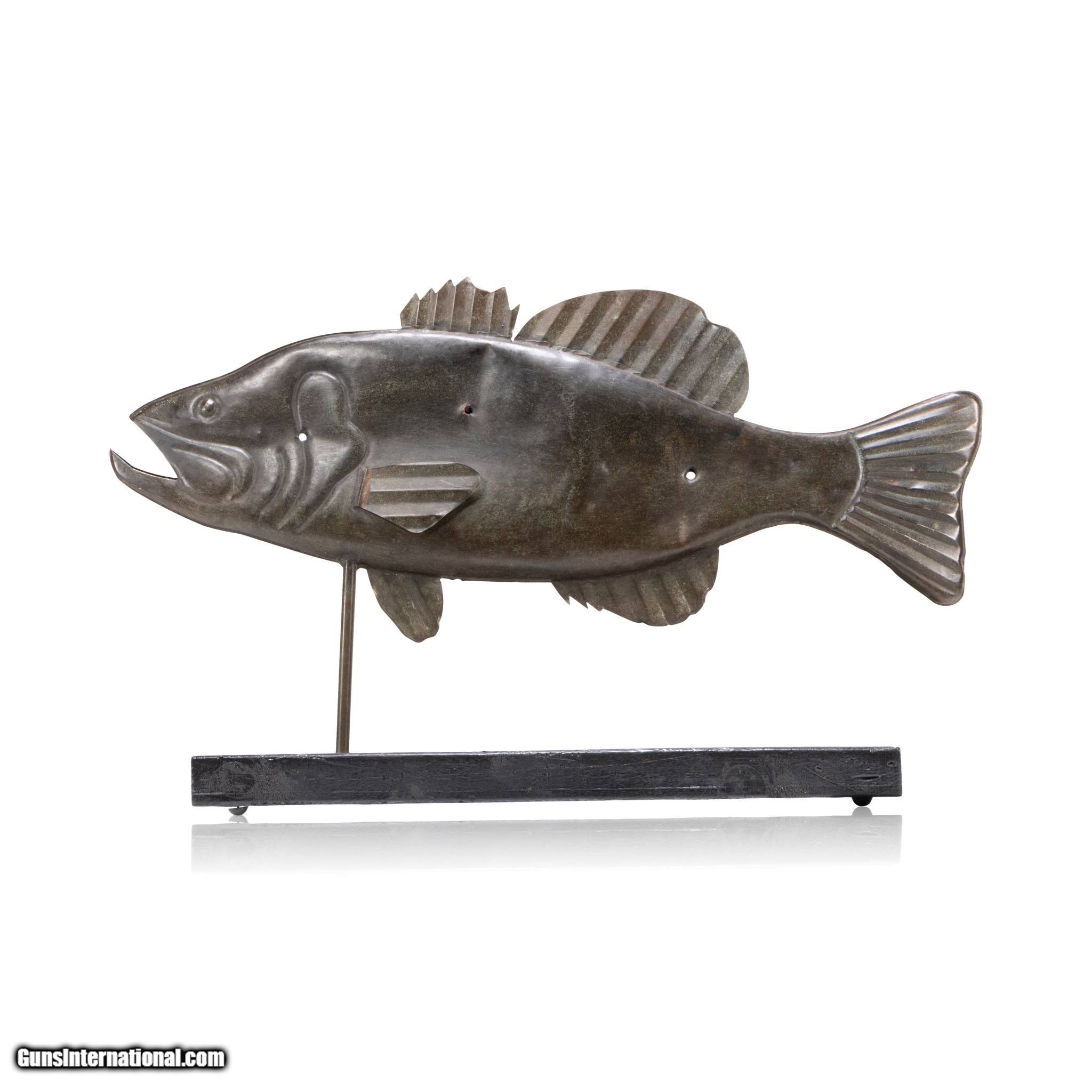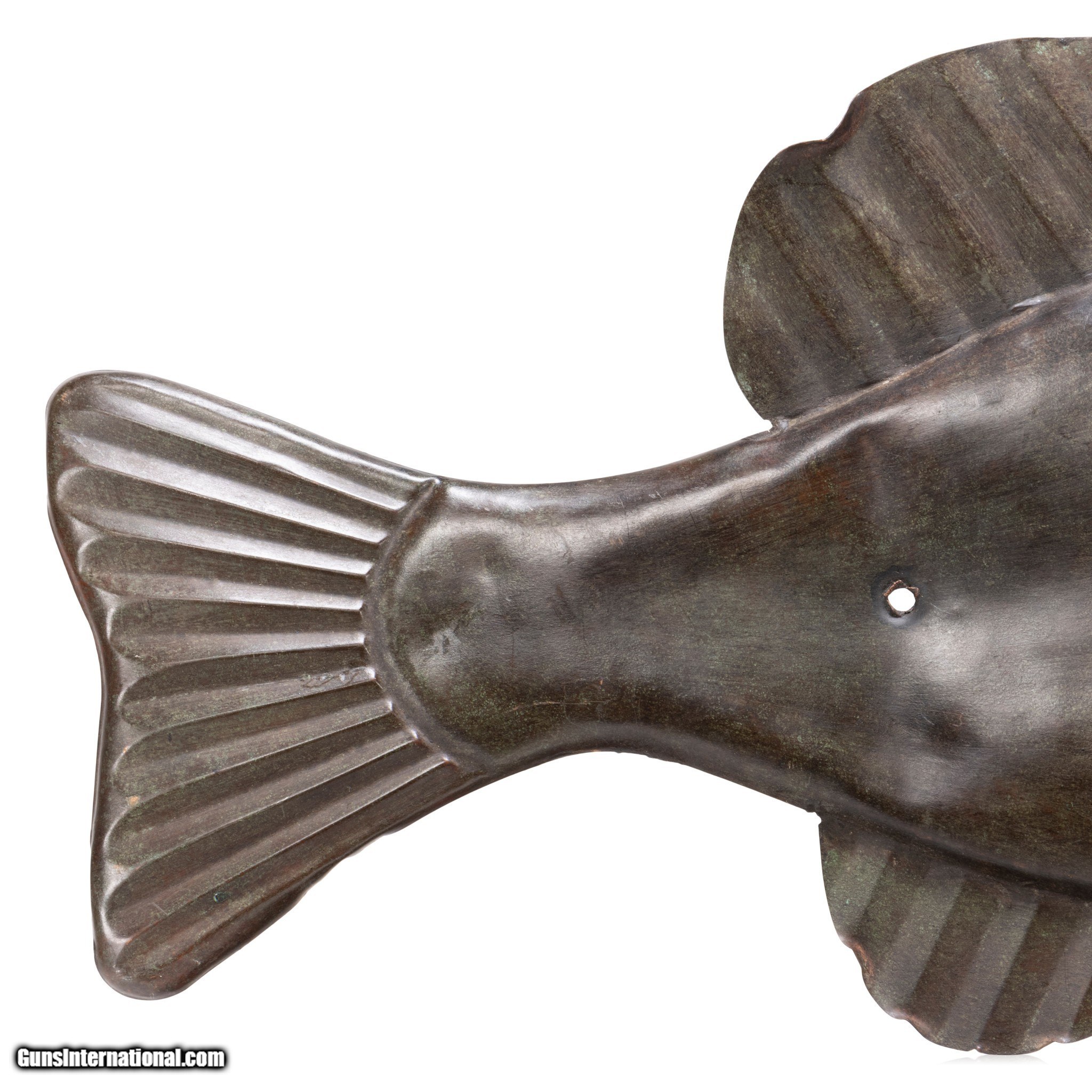 Description: Bass form copper three dimensional weather vane with later wood base. Has a bullet hole, as most early weather vanes do. Well made piece in great condition. Would display nicely in a modern or vintage style home or cabin as a shelf filler or accent piece. Size: Bass 15"H x 26"L; 26" x 7" x 16" incl. base Family Owned & Operated Cisco’s Gallery deals in the rare, exceptional, and one-of-a-kind pieces that define the history of America and the Old West. Our pieces range from American Indian to Cowboy Western and include original items of everyday life, commerce, art, and warfare that tamed America’s frontier. Our 14,000 square foot gallery opened in 1996 in beautiful Coeur d’Alene, Idaho. Personal Service Cisco’s operates on old fashioned values – honesty and integrity, and all of our items are backed by our money back guarantee. We appreciate the opportunity to earn your business. Whether you desire assistance with a jewelry purchase, choosing a gift, identification, or even selling – we hope to be your trusted source. SOLD |