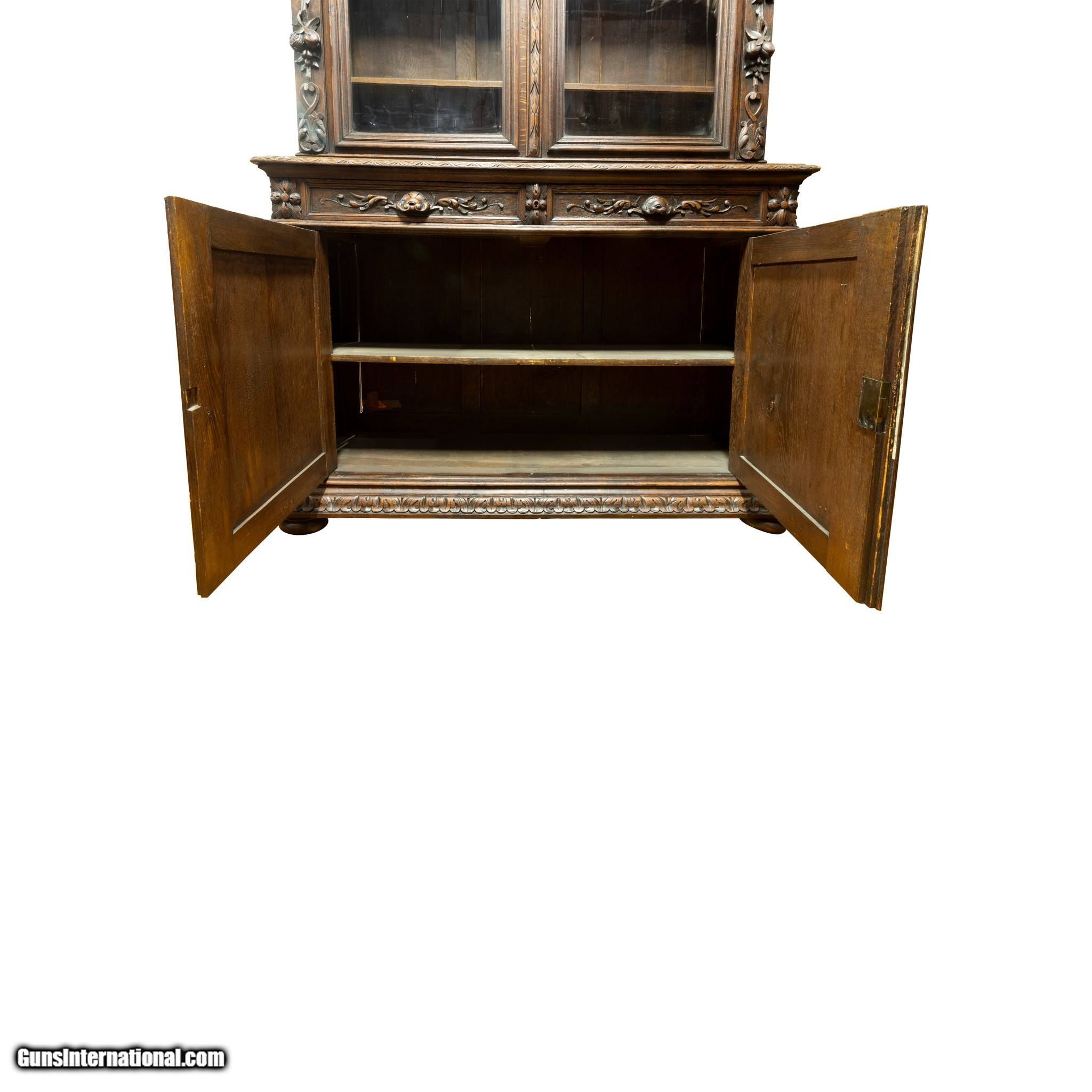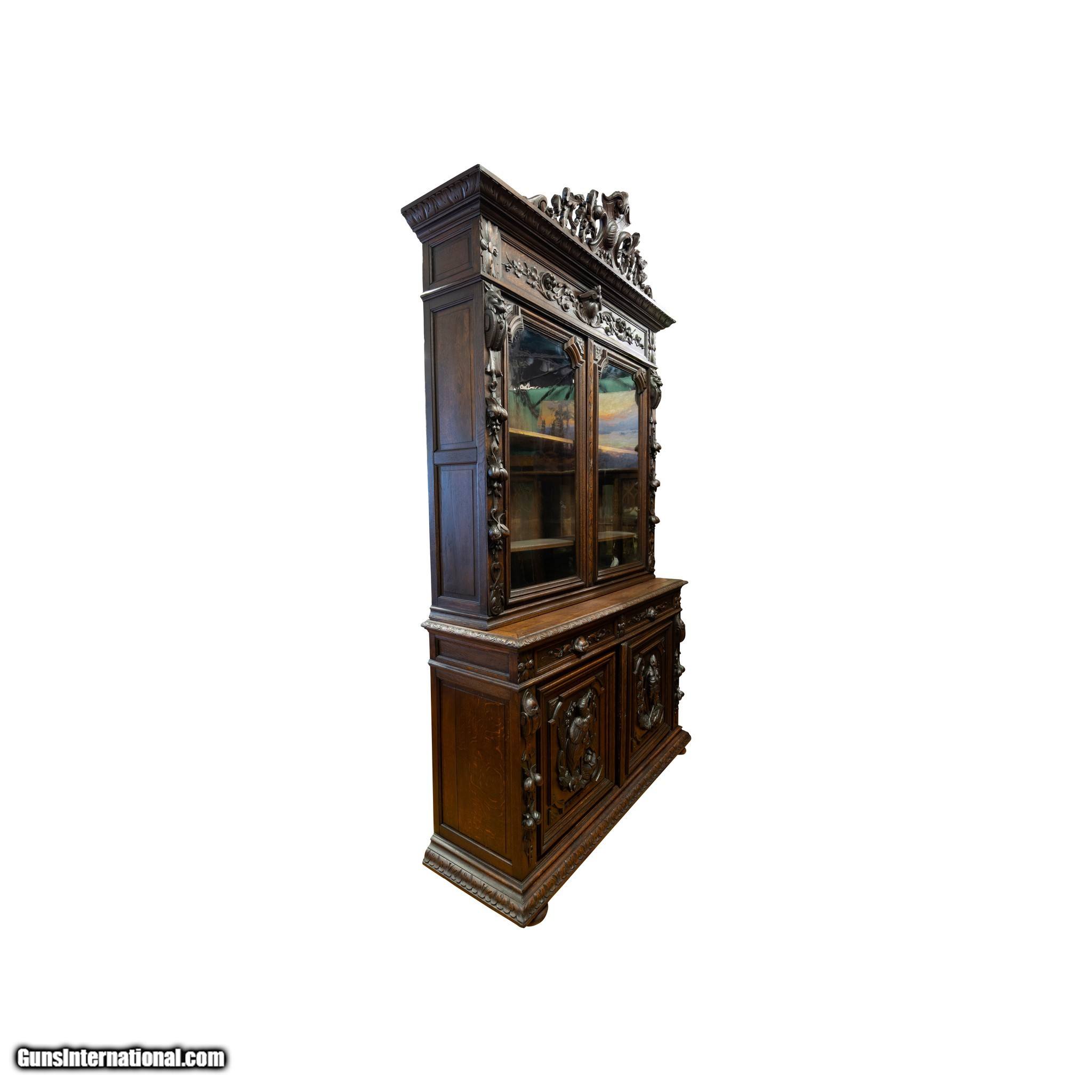 Description: Ornately carved Bavarian oak hutch with carved game birds on panels and crest on top. 57" x 22" x 104". SOLD |