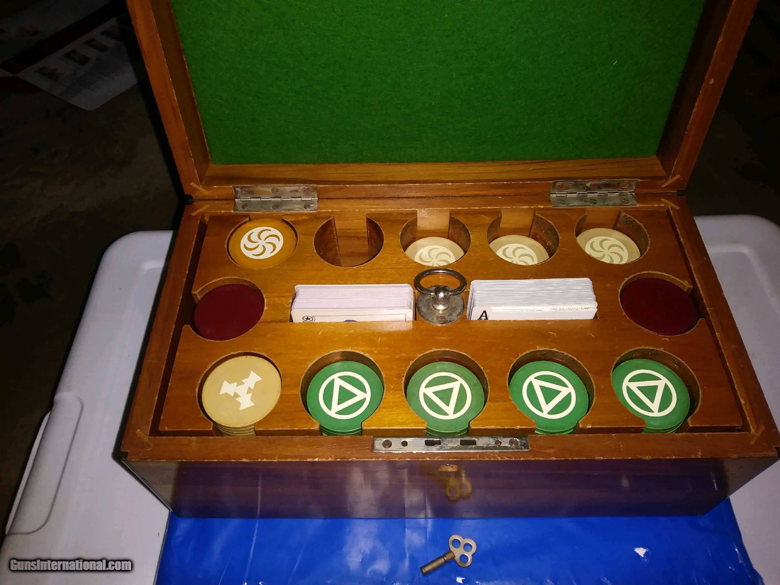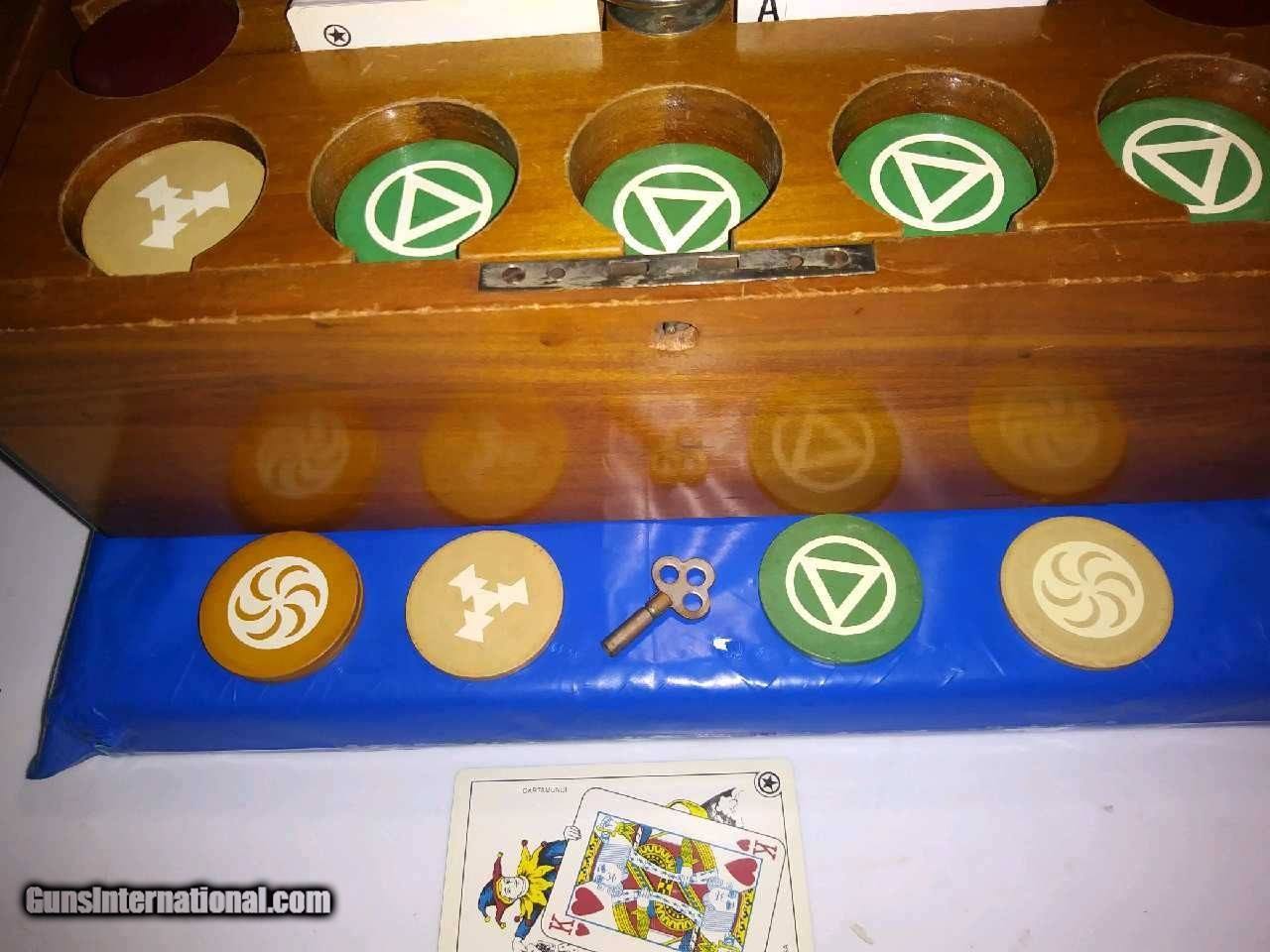 Description: Beautifull cased set of late 1890's poker chips with key. (dated using poker chip reference guide) 4 varieties of inlay chips, 2 decks of contemporary cards, and some red clay chips used for larger values. No issues, email any questions. The chip caddy does come out. No issues wondewrful lightly used condition. SOLD |