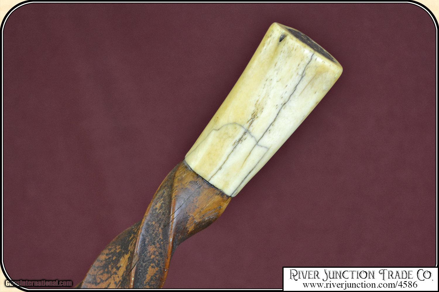 Description: Barley Twist Cane carve from one piece of hickory. Early American Folk Art Cane. Nice hand carved primitive cane. It is 36 1/2 in. long. Finding an antique cane that is tall enough for a 6 foot man is unusual. The top of the shaft is a Polished beef bone handle. The handle shows some cracking but is completely stable. The shaft is expertly carved with a double barley twist. The old varnish has many checks and give this stick a wonderful patina that could only be accomplished with age. It has a crack that runs the length of the stick, but does not effect the strength strength of the cane in anyway. It is ready to use and still has years of use left in it. This is the type of item that lends great authenticity to your re-enactor persona and at the same time increases in value and should bring back good value if you ever wish to sell. It displays well. Payment Cash, postal money order, cashiers check, personal & business checks. Can be ordered with a credit card or paypal at wxx.riverjunction,cxx just type in the number 4586 in the search box. SOLD |
