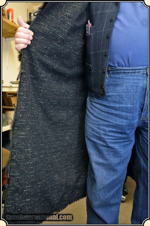 Description: When your on a steamer bound for the Alaskan gold fields and a cold wind is howling over the ships rail, you needs this warn coat to keep from freezing up before you are able to spring your 3 card monte game on them rubes from the creeks. The only way to do that is with this fine black bear hide coat. It has long sleeve, long length. Tanned hair on hide, with a warm woolen cloth lining. Two outside pockets and ten buttons and as befitting of a fancy gambling man like you, it has a racoon trimmed collar and pockets. This coat is in very good condition. I have seen none better. There are no tears or rips, no wear spots and no loose threads anywhere. Will fit man's sizes 46, 48, and 50 comfortably. Large sizes like this are very hard to find. PAYMENT Cash, postal money order, cashiers check, personal & business checks. May order at riverjucntion on-line with credit card or paypal. SOLD |