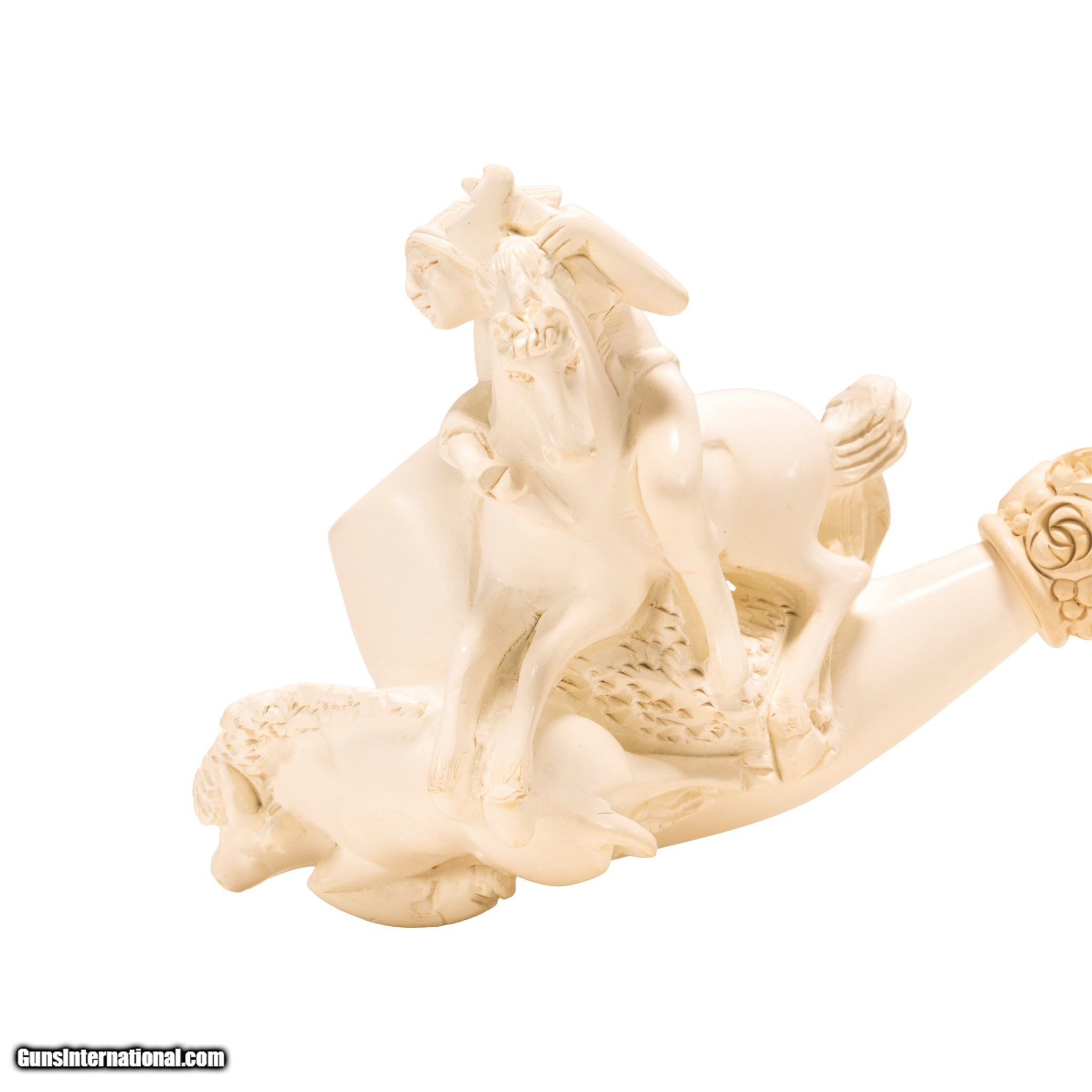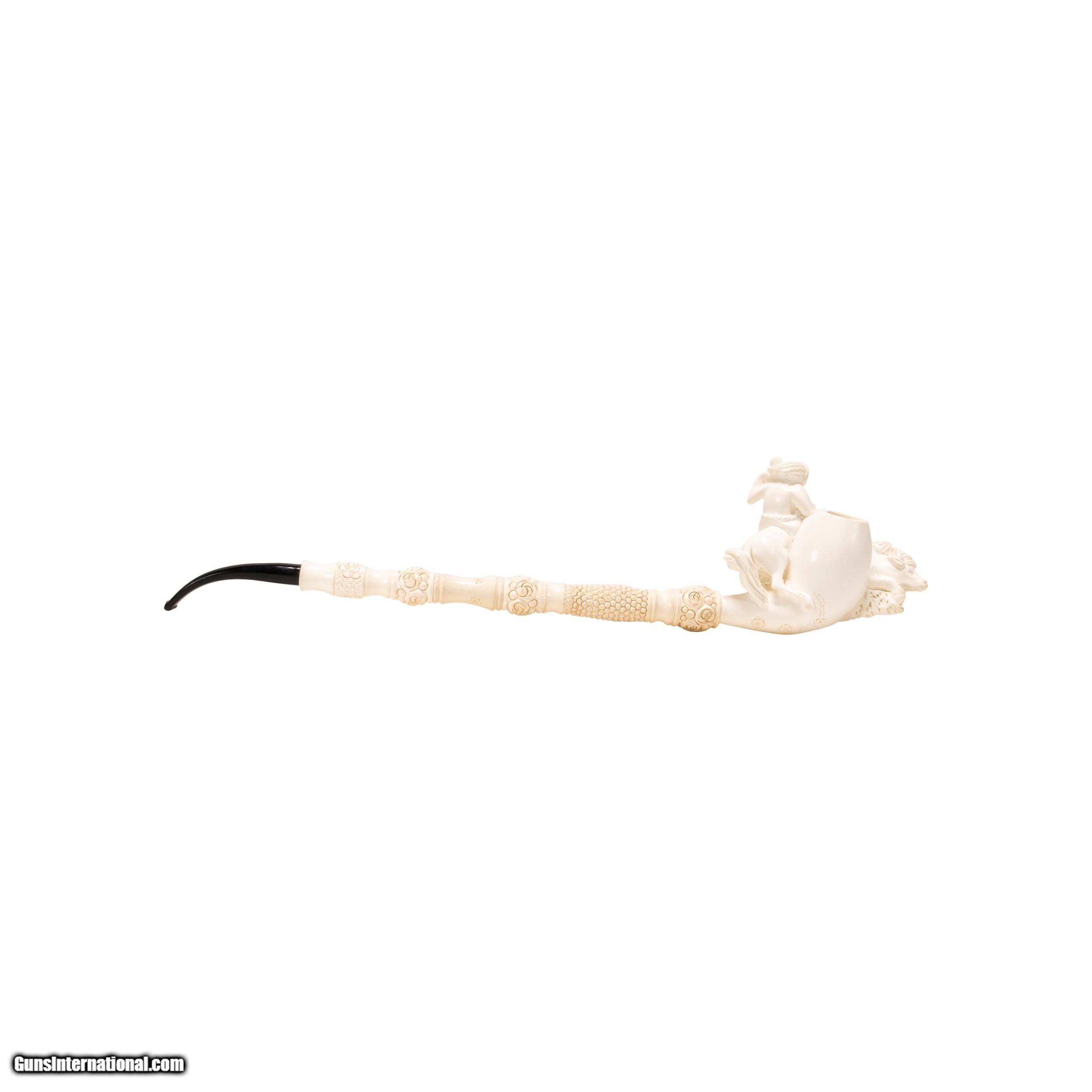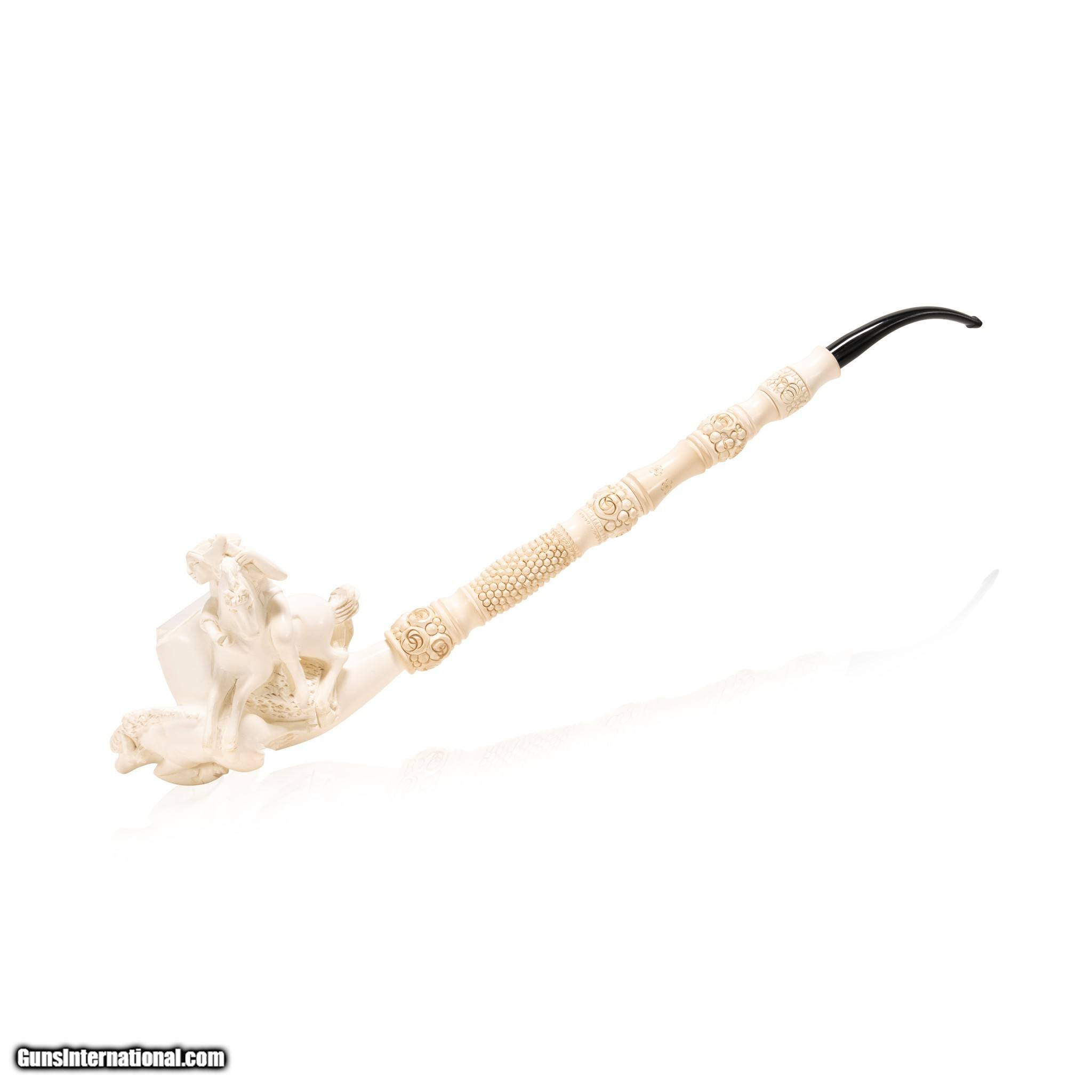 Description: Jumbo size carved Turkish block meerschaum pipe. Piece is highly detailed and elaborately carved. Piece portrays a Native American man in a headdress riding a horse and chasing a buffalo. Featuring a pebbled design that travels up the body of pipe and ends in a horn tip. Also comes with a custom made leather case. Looks to have never been used or rarely used. Would display nicely in a tobacciana or smoking collection, or as decor in a Southwestern style home, cabin, or ranch house. Size: 15"L Family Owned & Operated Cisco’s Gallery deals in the rare, exceptional, and one-of-a-kind pieces that define the history of America and the Old West. Our pieces range from American Indian to Cowboy Western and include original items of everyday life, commerce, art, and warfare that tamed America’s frontier. Our 14,000 square foot gallery opened in 1996 in beautiful Coeur d’Alene, Idaho. Personal Service Cisco’s operates on old fashioned values – honesty and integrity, and all of our items are backed by our money back guarantee. We appreciate the opportunity to earn your business. Whether you desire assistance with a jewelry purchase, choosing a gift, identification, or even selling – we hope to be your trusted source. SOLD |