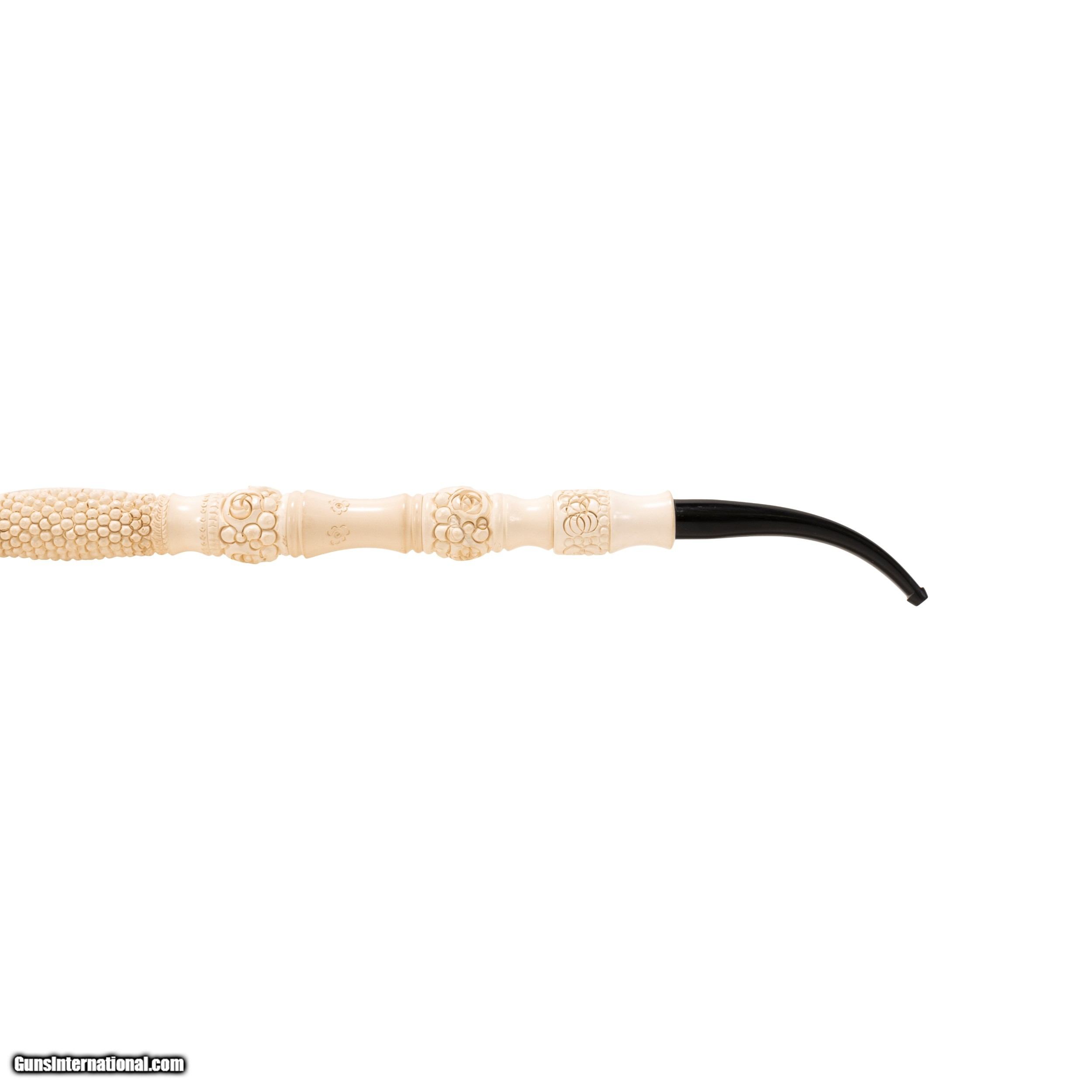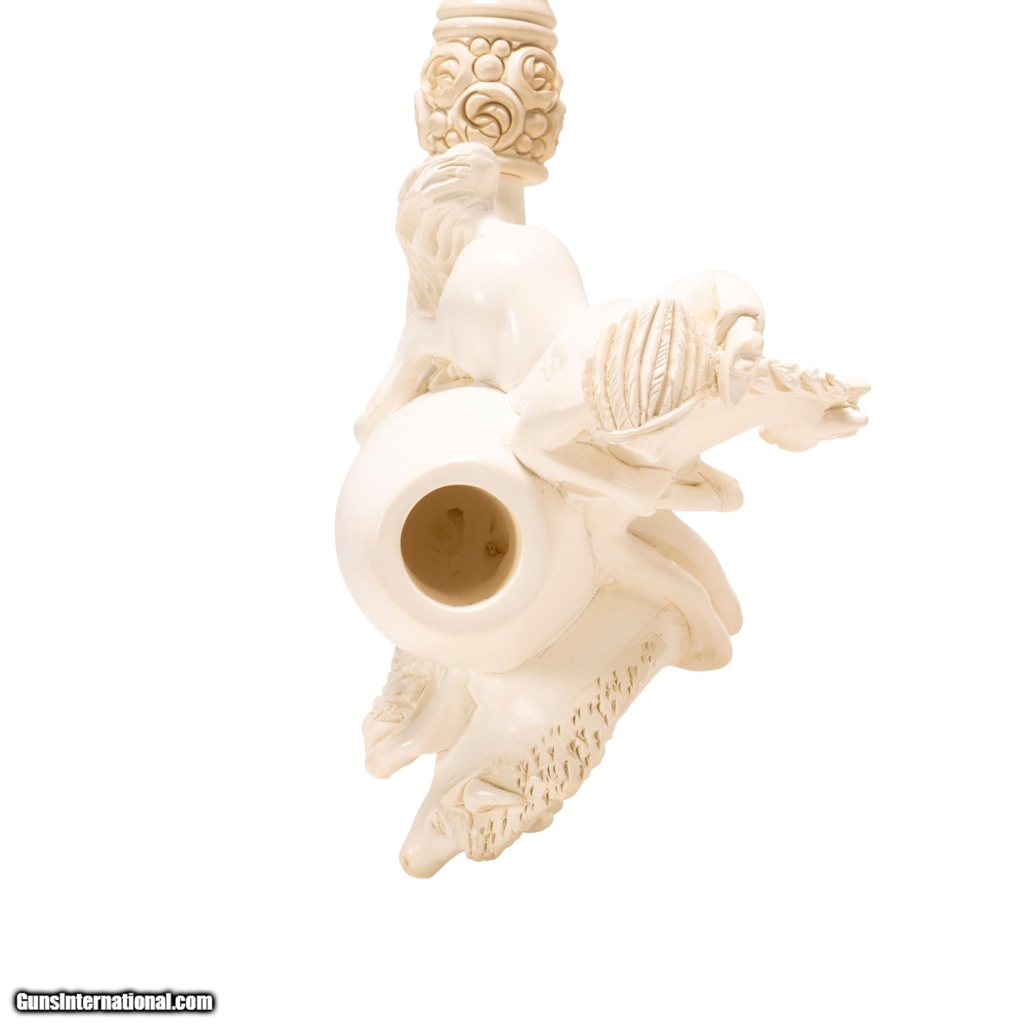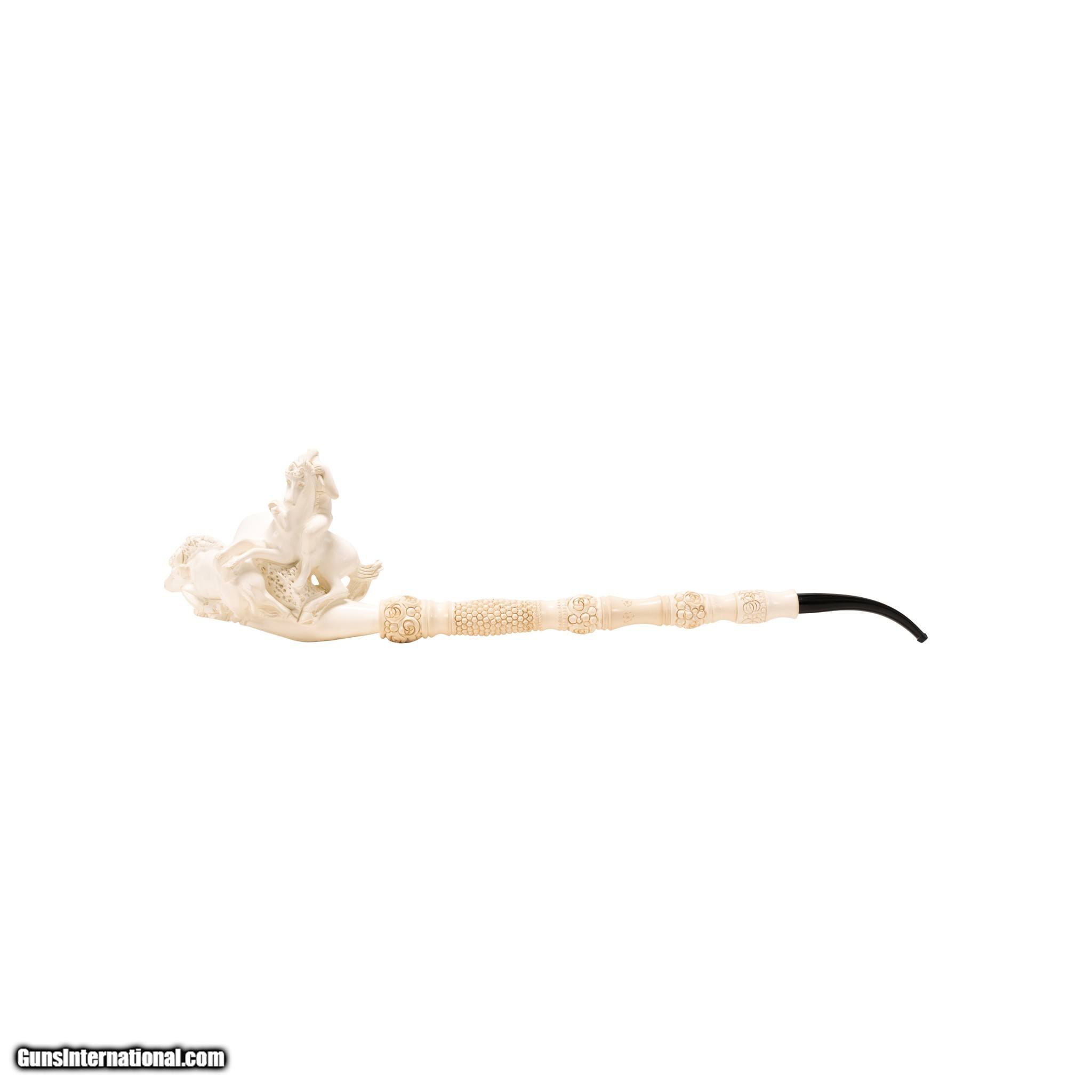 Description: Jumbo size carved Turkish block meerschaum pipe. Piece is highly detailed and elaborately carved. Piece portrays a Native American man in a headdress riding a horse and chasing a buffalo. Featuring a pebbled design that travels up the body of pipe and ends in a horn tip. Also comes with a custom made leather case. Looks to have never been used or rarely used. Would display nicely in a tobacciana or smoking collection, or as decor in a Southwestern style home, cabin, or ranch house. Size: 15"L Family Owned & Operated Cisco’s Gallery deals in the rare, exceptional, and one-of-a-kind pieces that define the history of America and the Old West. Our pieces range from American Indian to Cowboy Western and include original items of everyday life, commerce, art, and warfare that tamed America’s frontier. Our 14,000 square foot gallery opened in 1996 in beautiful Coeur d’Alene, Idaho. Personal Service Cisco’s operates on old fashioned values – honesty and integrity, and all of our items are backed by our money back guarantee. We appreciate the opportunity to earn your business. Whether you desire assistance with a jewelry purchase, choosing a gift, identification, or even selling – we hope to be your trusted source. SOLD |