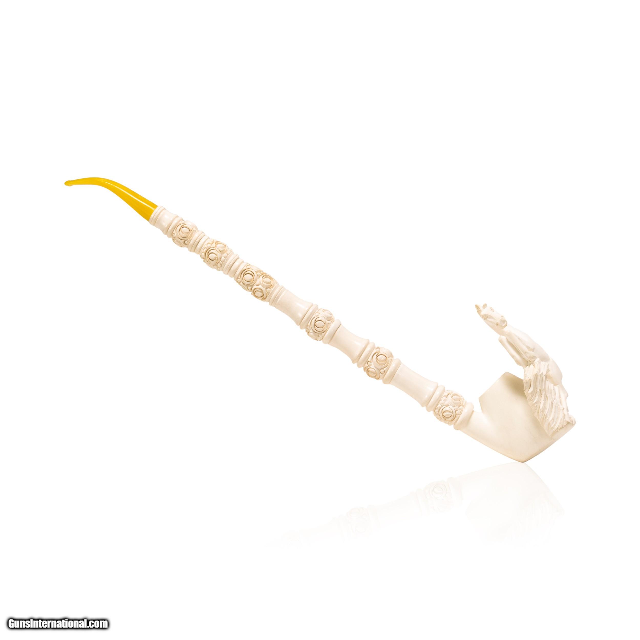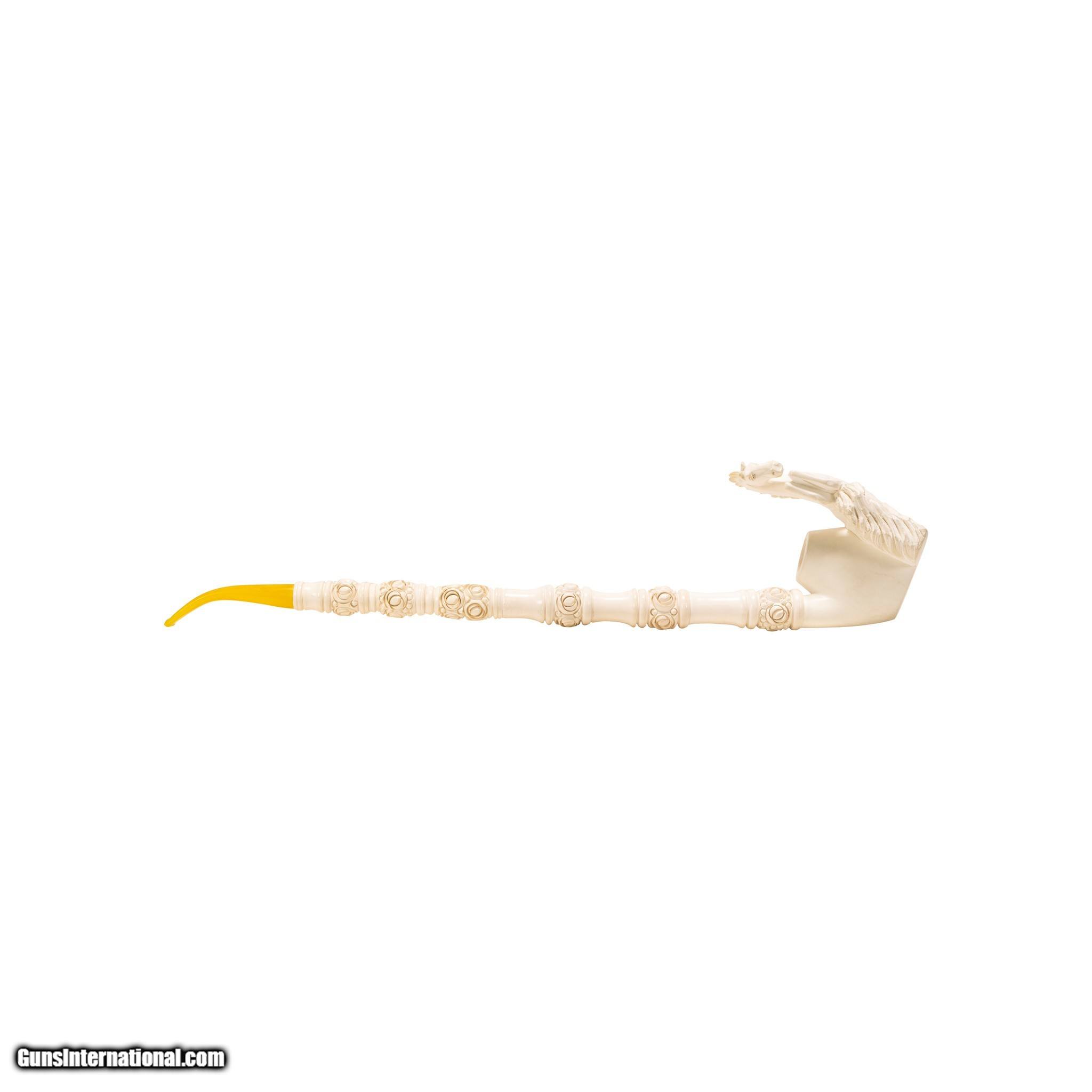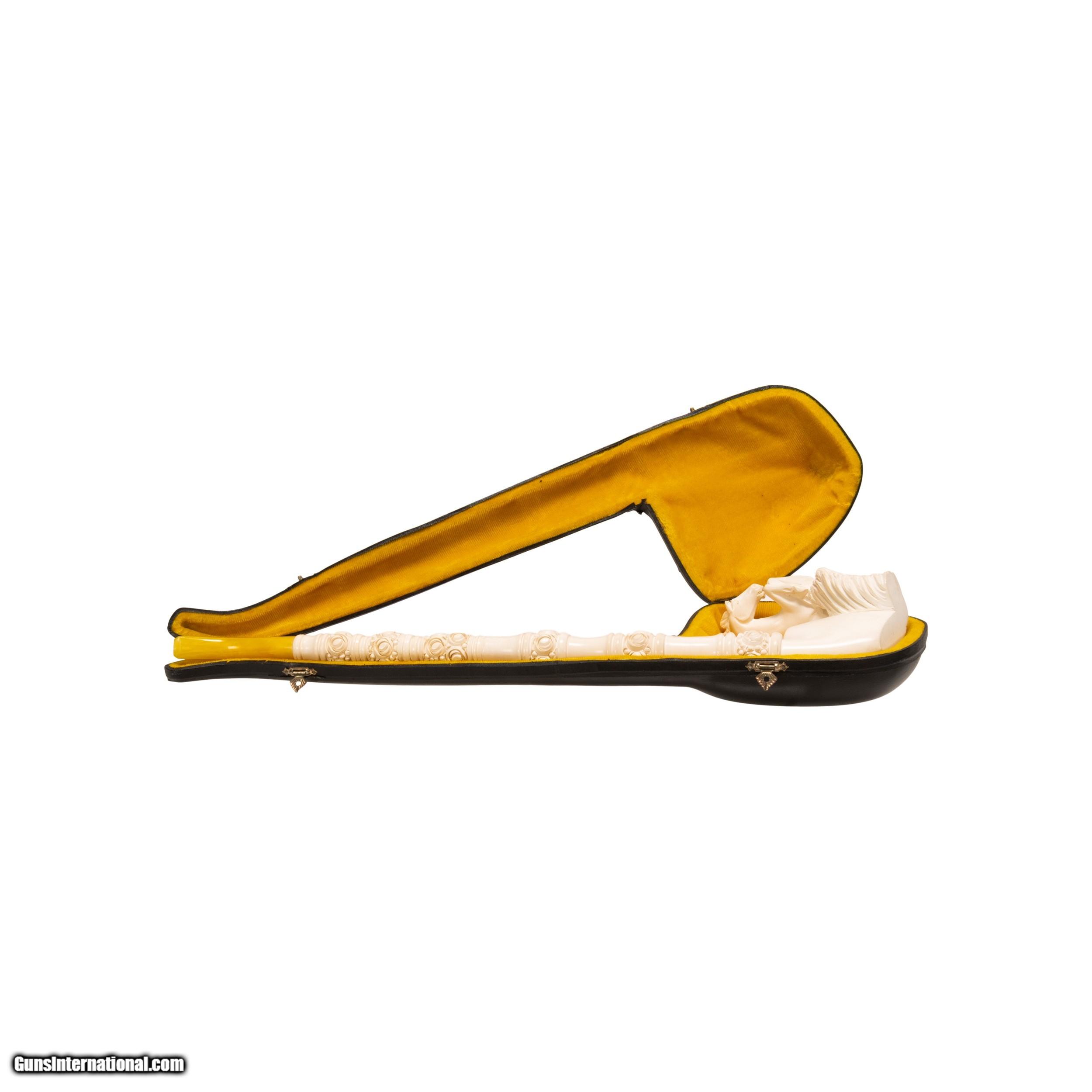 Description: Jumbo size carved Turkish block meerschaum pipe. Piece portrays a rearing stallion on bown. Featuring a rosette design running up body of pipe with other simple carved designs interspersing and ending in a horn tip. Includes a custom made leather case. Looks to have never been used or rarely used. Would display nicely in a tobacciana or smoking collection, or as decor in a Southwestern style home, cabin, or ranch house. Size: 18"L Family Owned & Operated Cisco’s Gallery deals in the rare, exceptional, and one-of-a-kind pieces that define the history of America and the Old West. Our pieces range from American Indian to Cowboy Western and include original items of everyday life, commerce, art, and warfare that tamed America’s frontier. Our 14,000 square foot gallery opened in 1996 in beautiful Coeur d’Alene, Idaho. Personal Service Cisco’s operates on old fashioned values – honesty and integrity, and all of our items are backed by our money back guarantee. We appreciate the opportunity to earn your business. Whether you desire assistance with a jewelry purchase, choosing a gift, identification, or even selling – we hope to be your trusted source. SOLD |