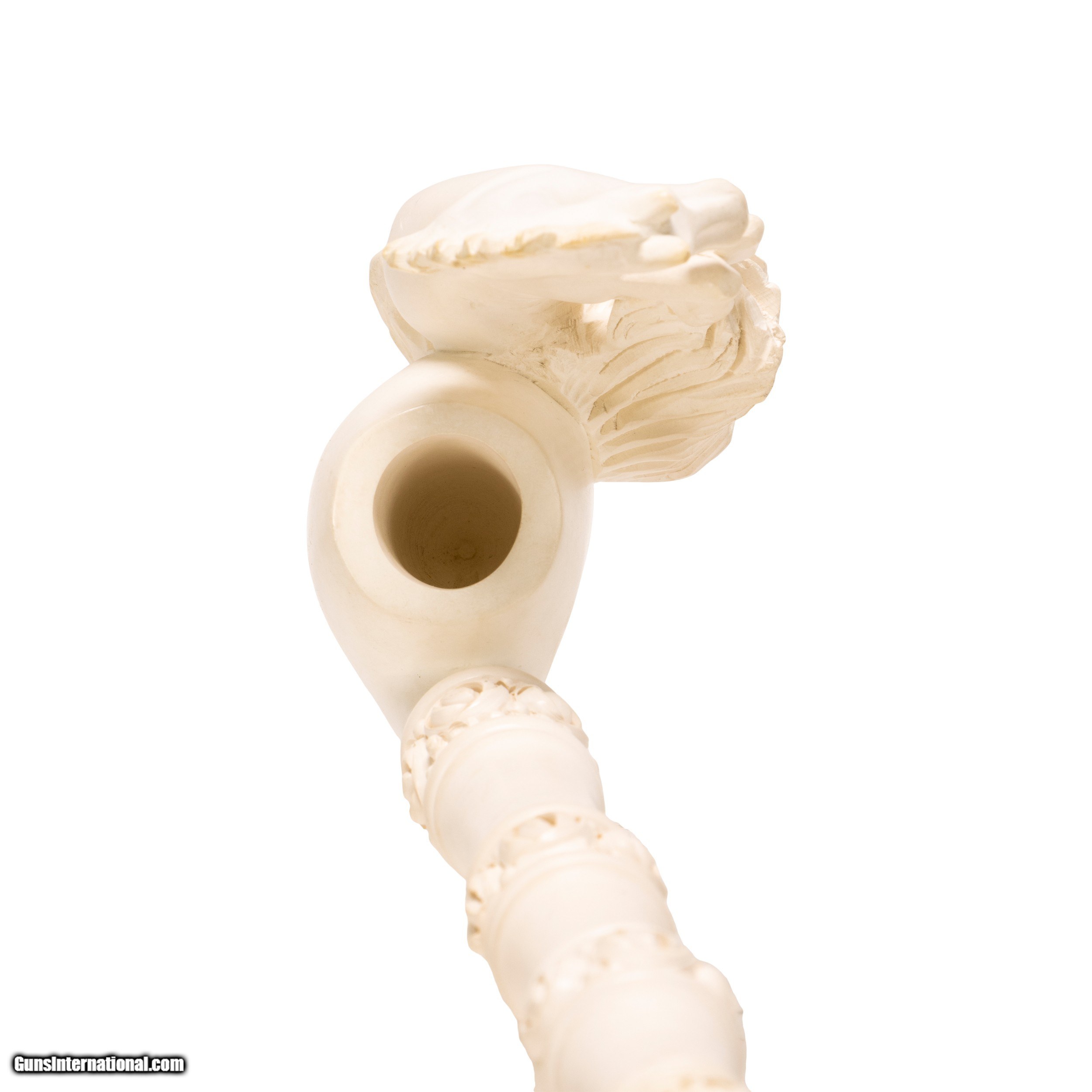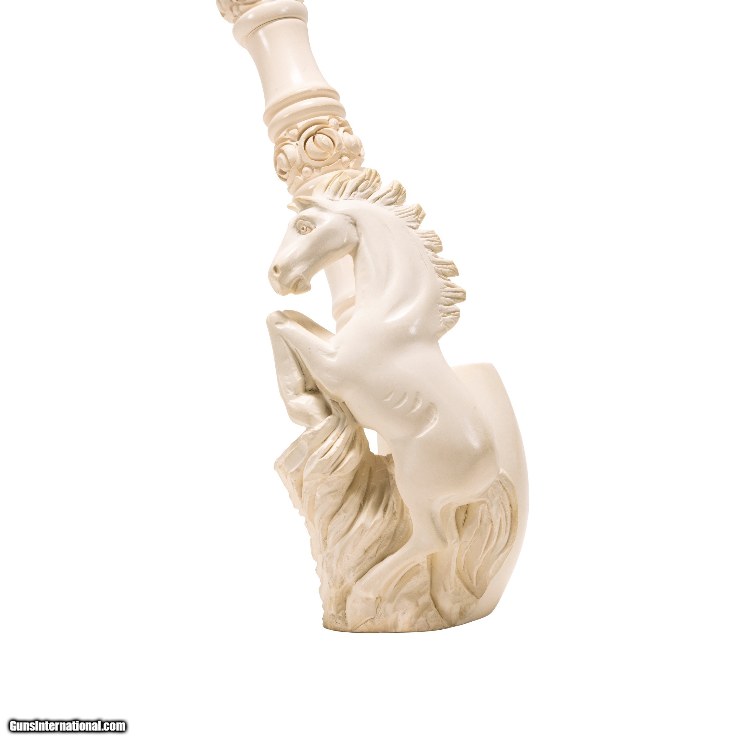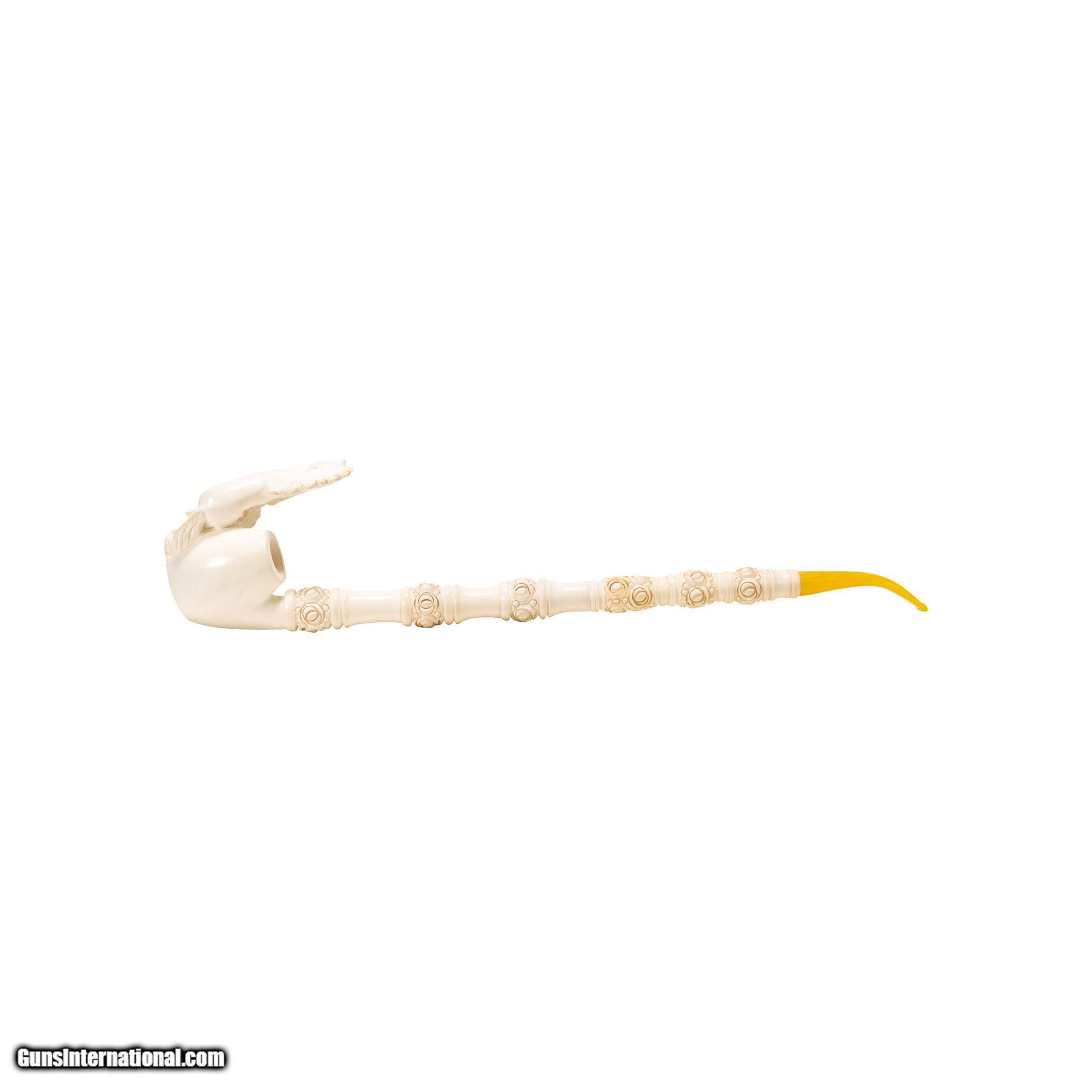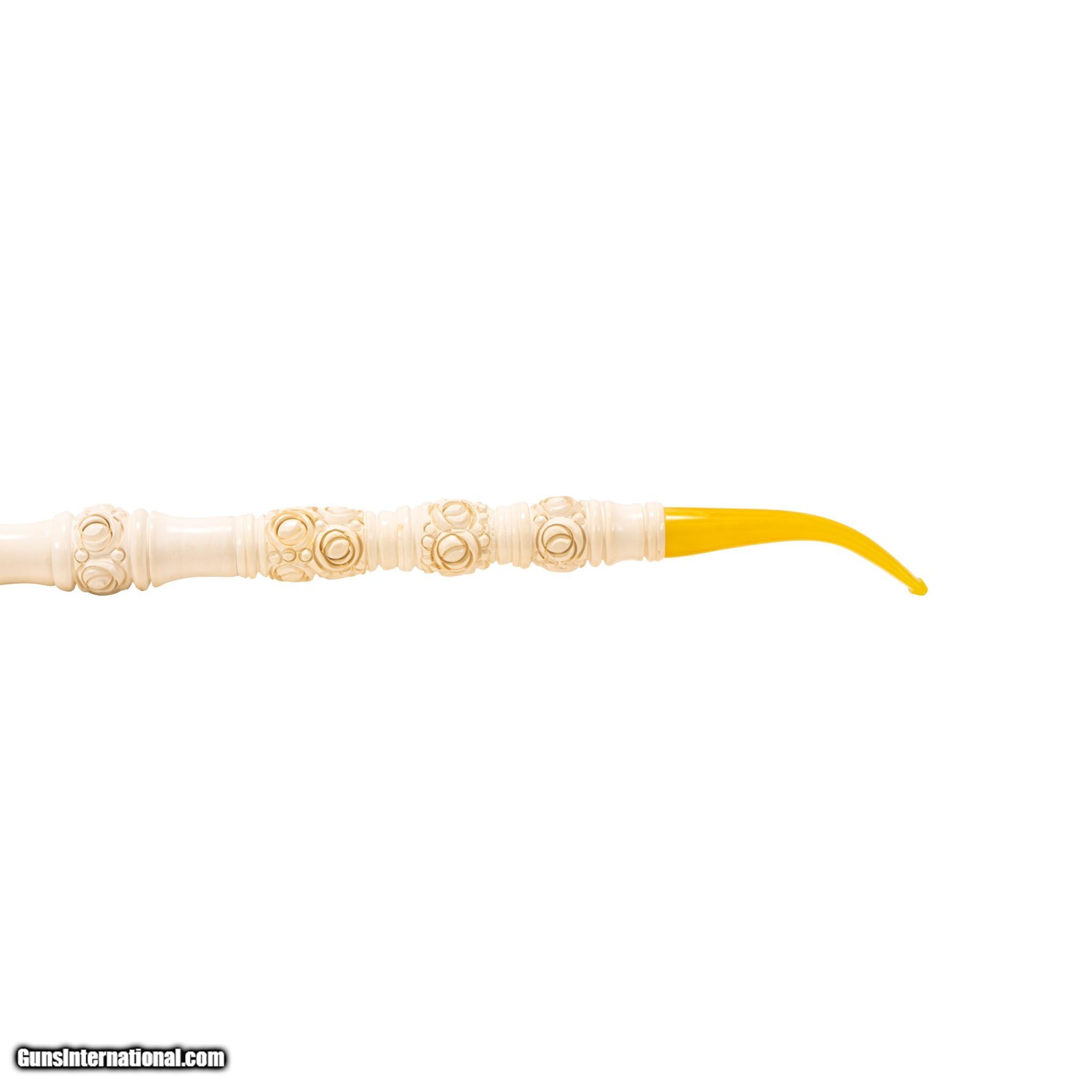Description: Jumbo size carved Turkish block meerschaum pipe. Piece portrays a rearing stallion on bown. Featuring a rosette design running up body of pipe with other simple carved designs interspersing and ending in a horn tip. Includes a custom made leather case. Looks to have never been used or rarely used. Would display nicely in a tobacciana or smoking collection, or as decor in a Southwestern style home, cabin, or ranch house. Size: 18"L Family Owned & Operated Cisco’s Gallery deals in the rare, exceptional, and one-of-a-kind pieces that define the history of America and the Old West. Our pieces range from American Indian to Cowboy Western and include original items of everyday life, commerce, art, and warfare that tamed America’s frontier. Our 14,000 square foot gallery opened in 1996 in beautiful Coeur d’Alene, Idaho. Personal Service Cisco’s operates on old fashioned values – honesty and integrity, and all of our items are backed by our money back guarantee. We appreciate the opportunity to earn your business. Whether you desire assistance with a jewelry purchase, choosing a gift, identification, or even selling – we hope to be your trusted source. SOLD |