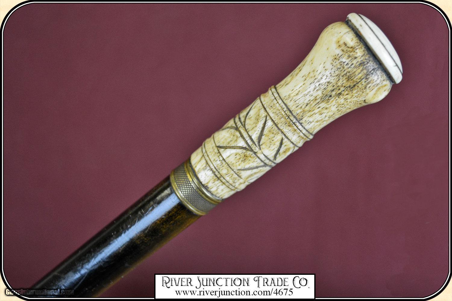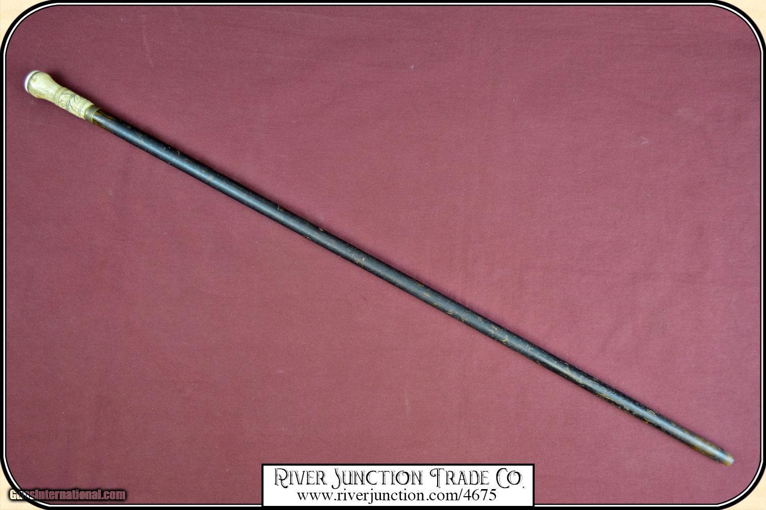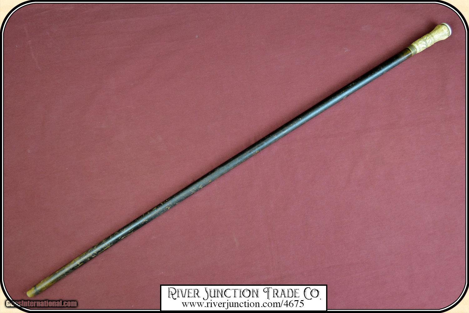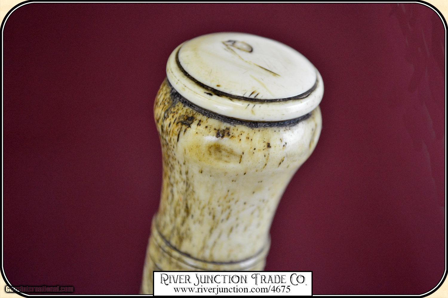 Description: I believe this may be a folk art cane, but well done by a skilled artist. The handle is done with bone topped with an Ivory cap. The handle is about 3 1/4" long, with a brass band at the collar. It has well carved design that surrounds the handle. Additionally the shaft has been ebonized in black to give a dressy and elegant appearance. The overall length is 36 1/4" and the condition is very good. It is American, ca 1880. The handle and wood are all stable with no cracks and ready to use. No gentleman would be caught on the town without a strong cane to fend of brigands and dogs. Payment Cash, postal money order, cashiers check, personal & business checks. Can be ordered with a credit card or paypal at wxx.riverjunction,cxx just type in the number 4675 in the search box. SOLD |