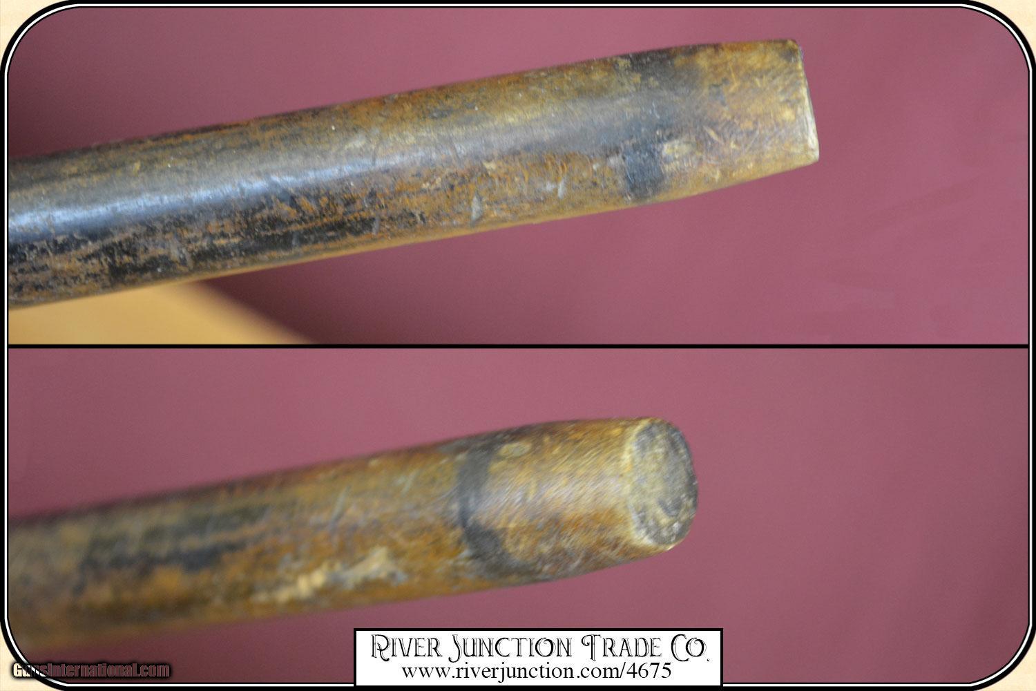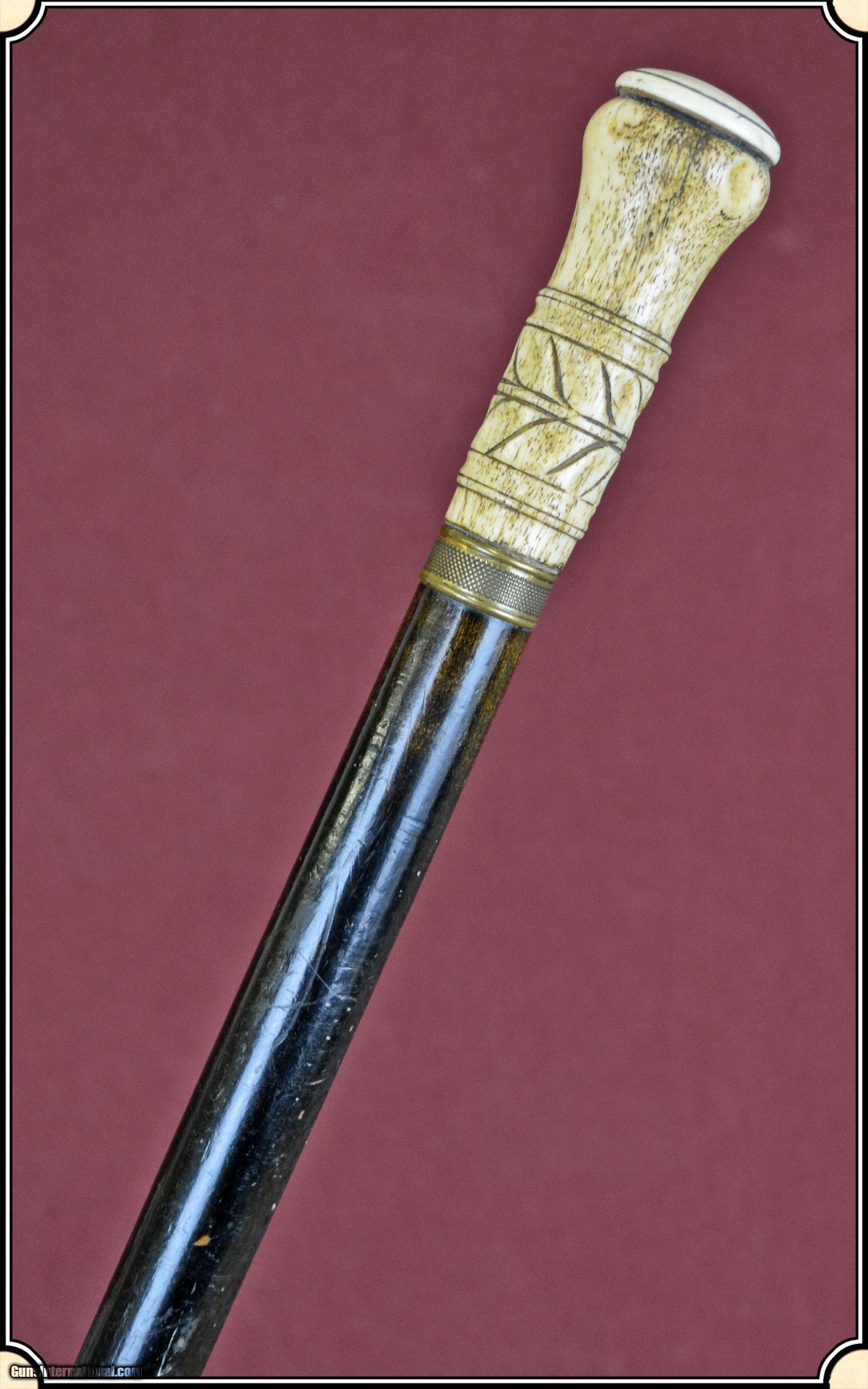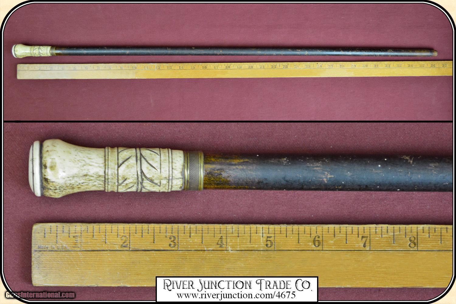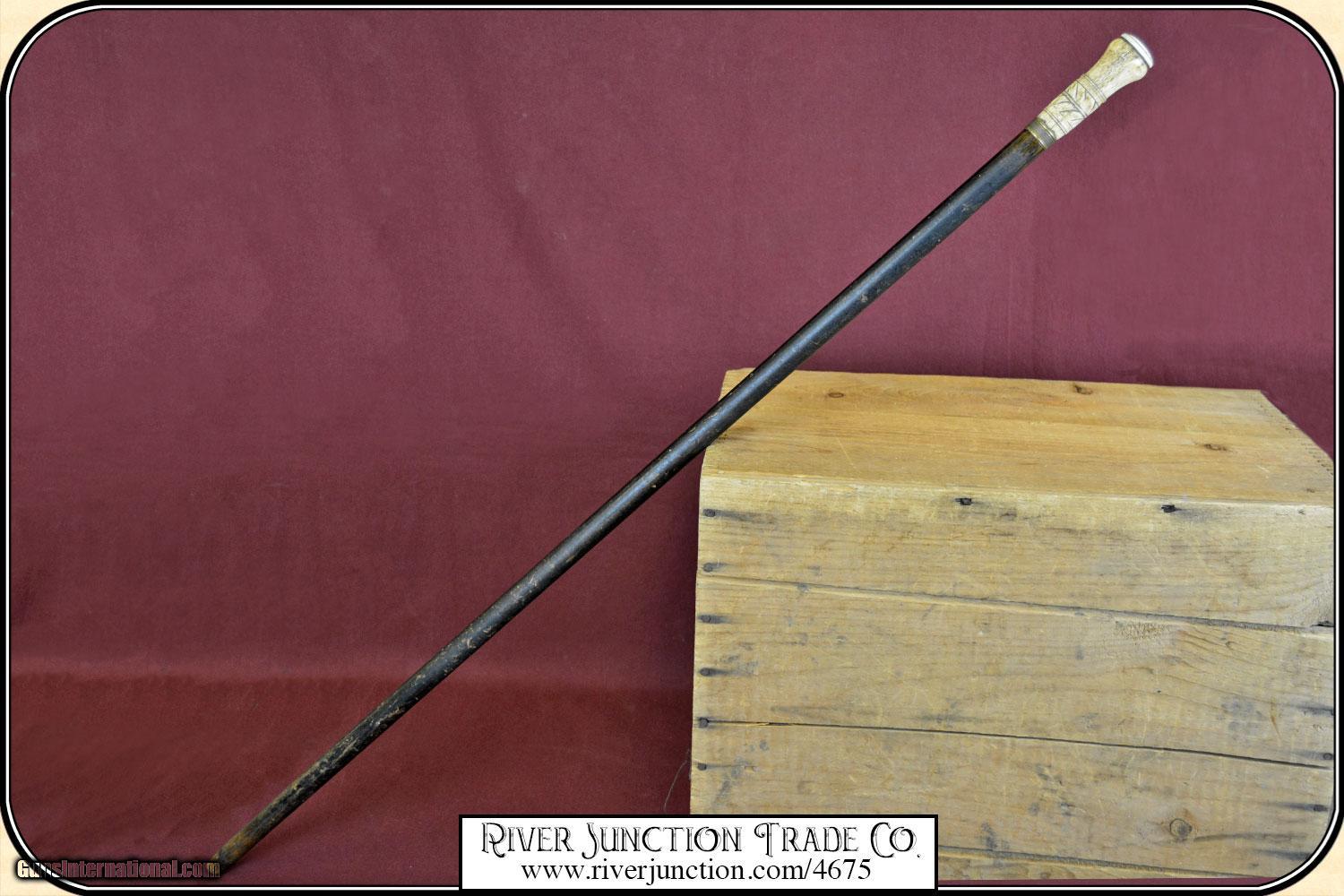Description: I believe this may be a folk art cane, but well done by a skilled artist. The handle is done with bone topped with an Ivory cap. The handle is about 3 1/4" long, with a brass band at the collar. It has well carved design that surrounds the handle. Additionally the shaft has been ebonized in black to give a dressy and elegant appearance. The overall length is 36 1/4" and the condition is very good. It is American, ca 1880. The handle and wood are all stable with no cracks and ready to use. No gentleman would be caught on the town without a strong cane to fend of brigands and dogs. Payment Cash, postal money order, cashiers check, personal & business checks. Can be ordered with a credit card or paypal at wxx.riverjunction,cxx just type in the number 4675 in the search box. SOLD |