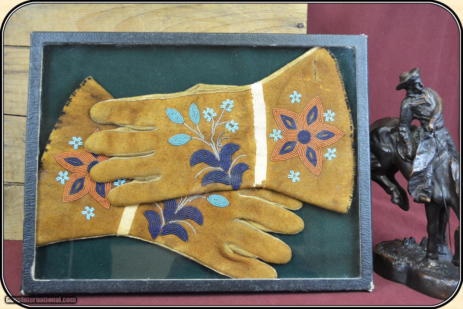 Description: Indian tanned, buckskin leather gauntlet gloves. Expertly made these gloves show the original smoke color. They are velvety soft and flexible. These Leather Gauntlet Gloves are hand sewn and hand beaded in a floral pattern. Beading on the gauntlet area and the entire back of the hand. All beading is tight with only a few missing beads in the knuckle area, you have to look close to see. The Star/Flower on the cuff is made up of white heart and cobalt blue seed beads. The beading was done by stitching and sewing down one bead at a time, a task that takes a lot of tedious work to complete. All seams are fully welted, again a sign of the best in craftsmanship. I believe these gauntlets were originally made in the 19th century. The gauntlet is lined in plaid cotton flannel and the edge of the cuff is blanket stitched with cotton thread which has not stood up well to time. It would be an easy matter to redo the blanket stitch if you wish. There are no rips or tears. These will fit a large or medium-sized man's hand. They measure 13" long by 8 1/2" wide at the cuff. These gauntlet gloves are in near perfect condition and have had no wear. They are a wonderful Old West collectable. Payment Cash, postal money order, cashiers check, personal & business checks. Can be ordered with a credit card or paypal at wxx.riverjunction,cxx just type in the number 4481 in the search box. SOLD |