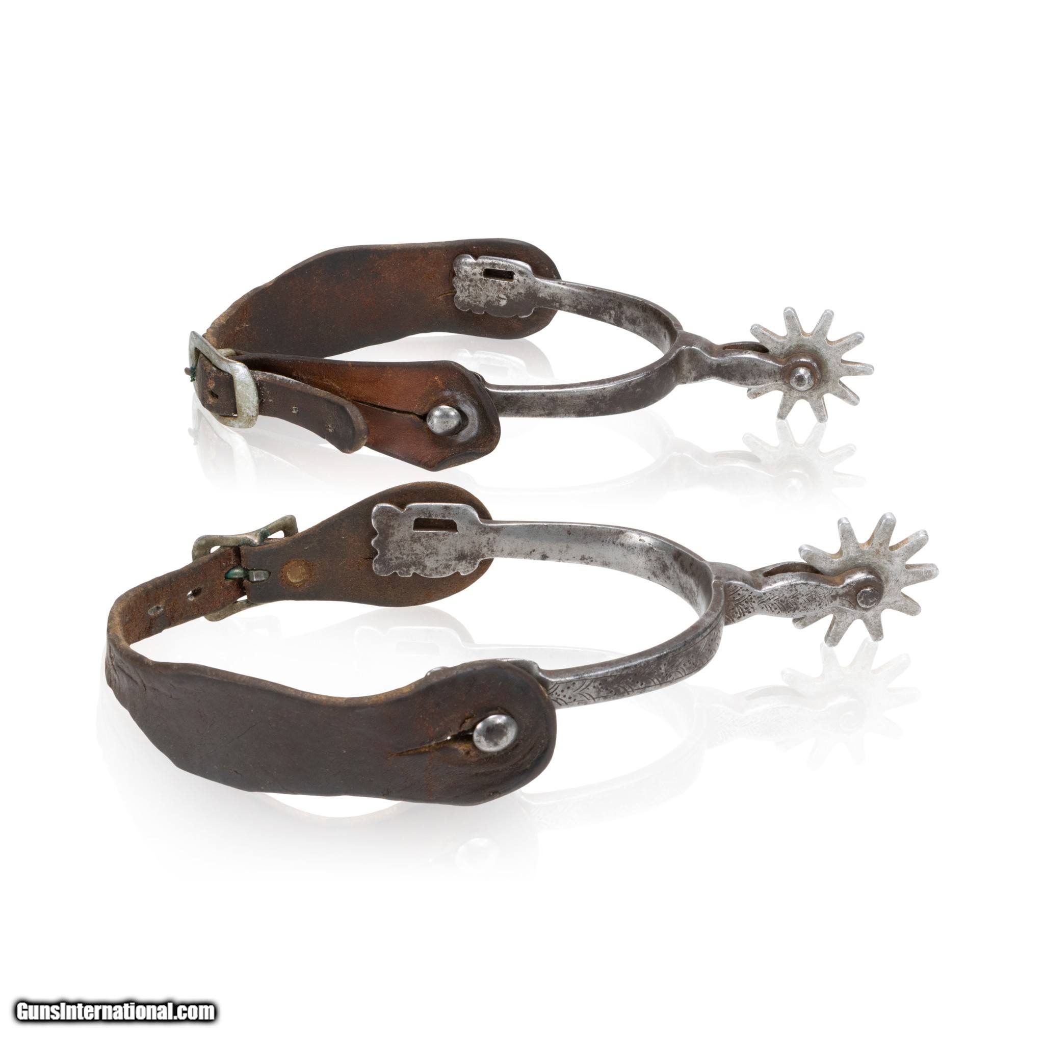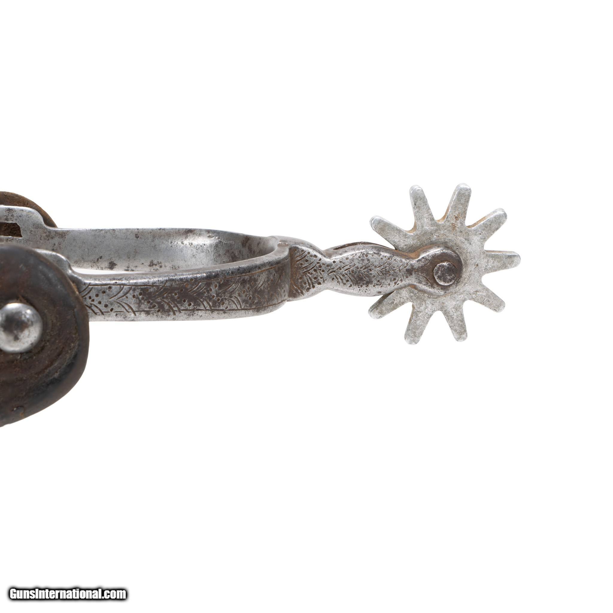 Description: Buermann iron spurs with old leathers. (Buermann attributed). Not marked. Leaf and berry design punched into one side. Simple design, still in good contiditon with some patina on metal of spurs. Good for continued use or display in a western, frontier, equestrian, or cowboy collection. Would also display nicely in a Southwestern style farm or ranch house as decor. Made during the 19th century. Size: 7 3/4" heel 3" rowels 3/4" Family Owned & Operated Cisco’s Gallery deals in the rare, exceptional, and one-of-a-kind pieces that define the history of America and the Old West. Our pieces range from American Indian to Cowboy Western and include original items of everyday life, commerce, art, and warfare that tamed America’s frontier. Our 14,000 square foot gallery opened in 1996 in beautiful Coeur d’Alene, Idaho. Personal Service Cisco’s operates on old fashioned values – honesty and integrity, and all of our items are backed by our money back guarantee. We appreciate the opportunity to earn your business. Whether you desire assistance with a jewelry purchase, choosing a gift, identification, or even selling – we hope to be your trusted source. SOLD |