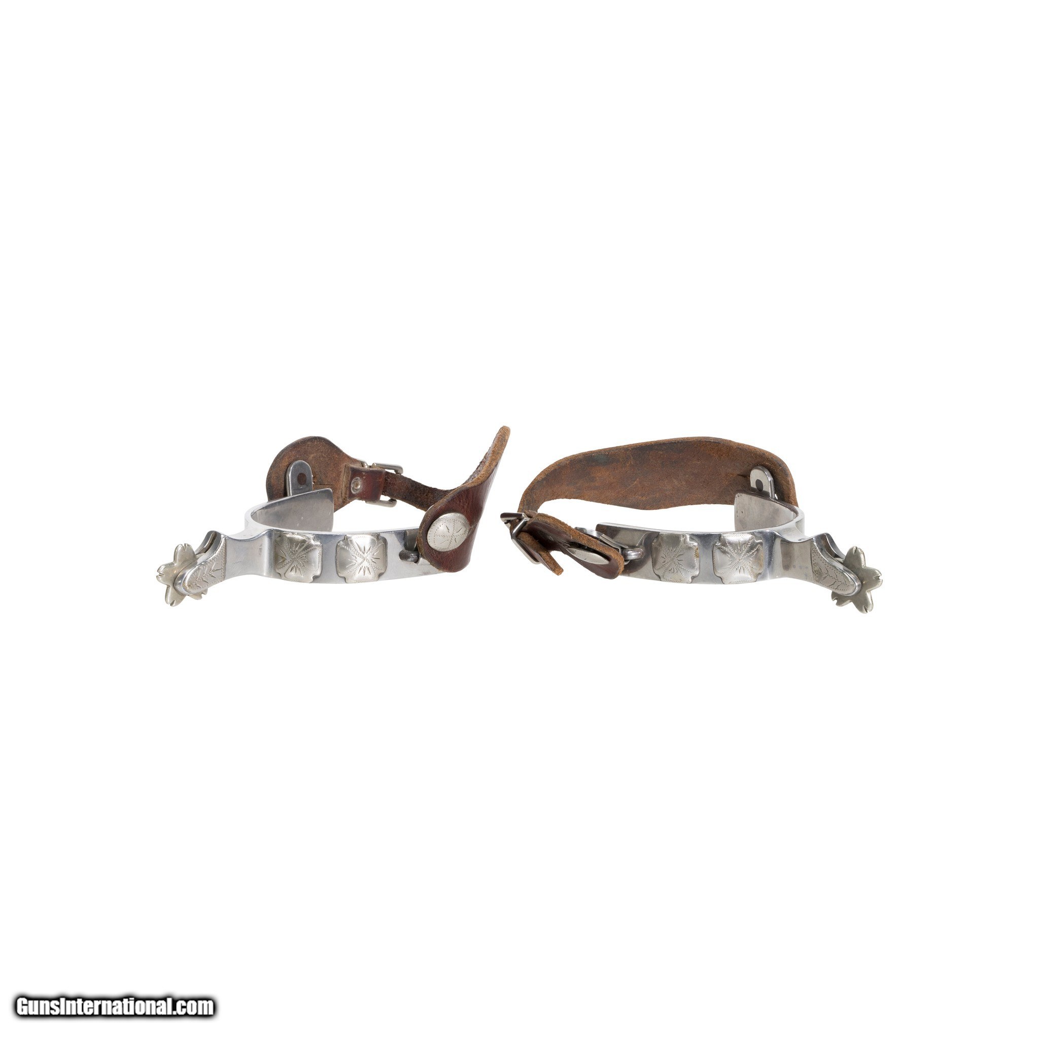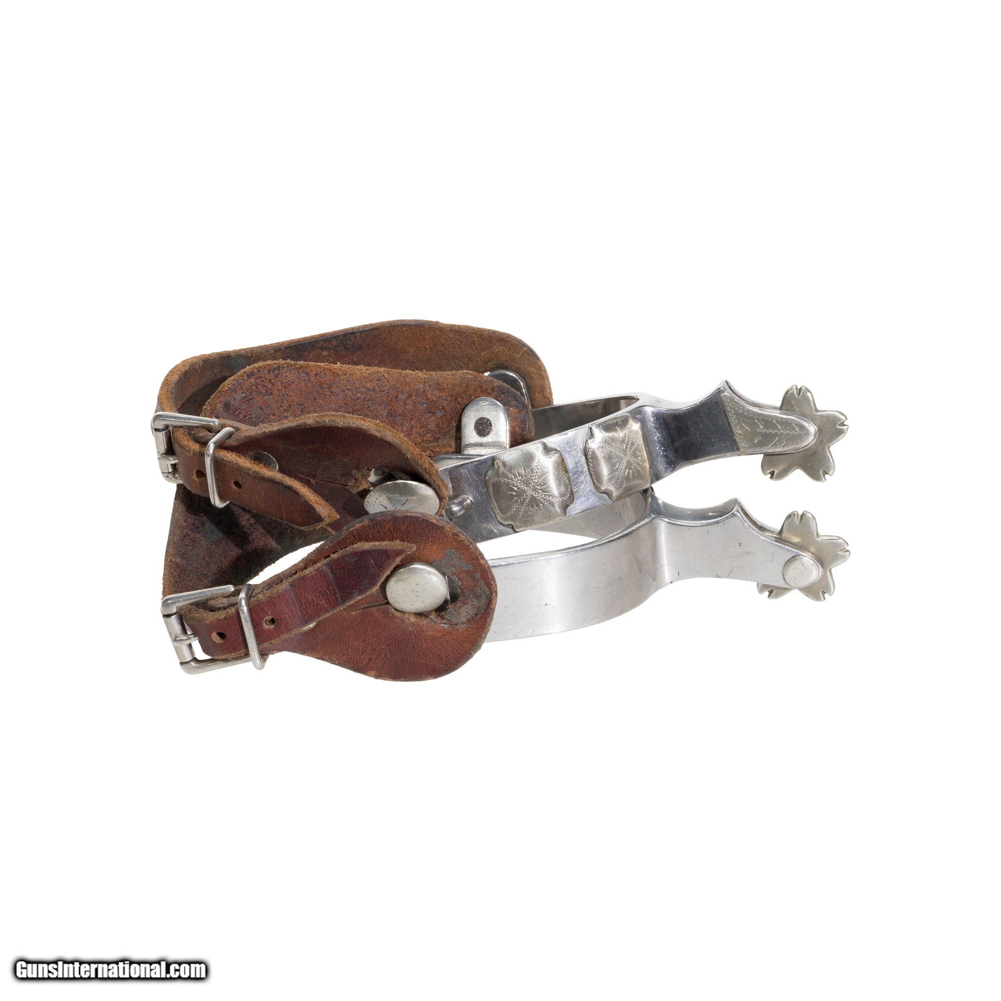 Description: Bull rider's spurs with silver overlay and original leathers. Marked "ST" for stainless and maker's mark Crockett. Beautiful set in excellent condition. Great for continued equestrian use, or would make for excellent decor in a Western, cowboy, farm, or ranch house. Made in the Western United States during the mid 20th century. Size: 5 1/2"L x 3 1/2"W SOLD |