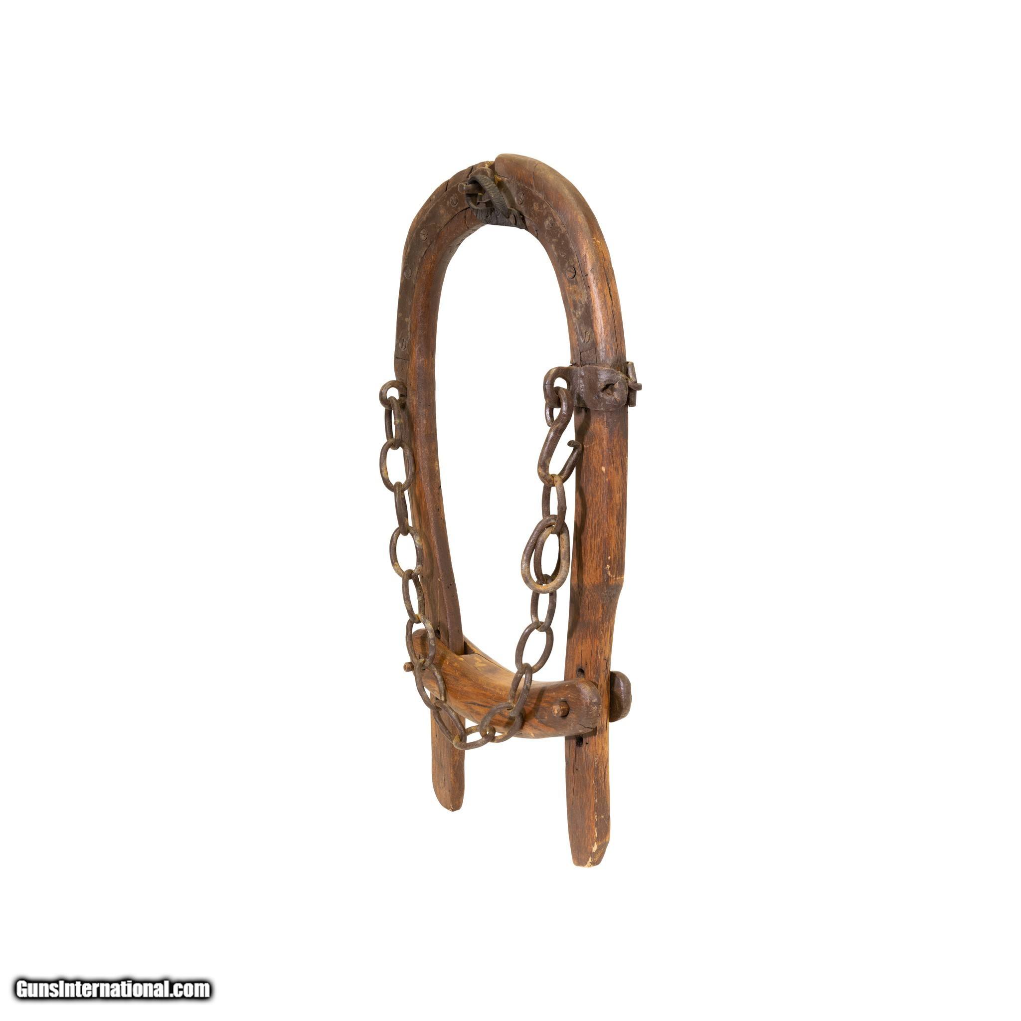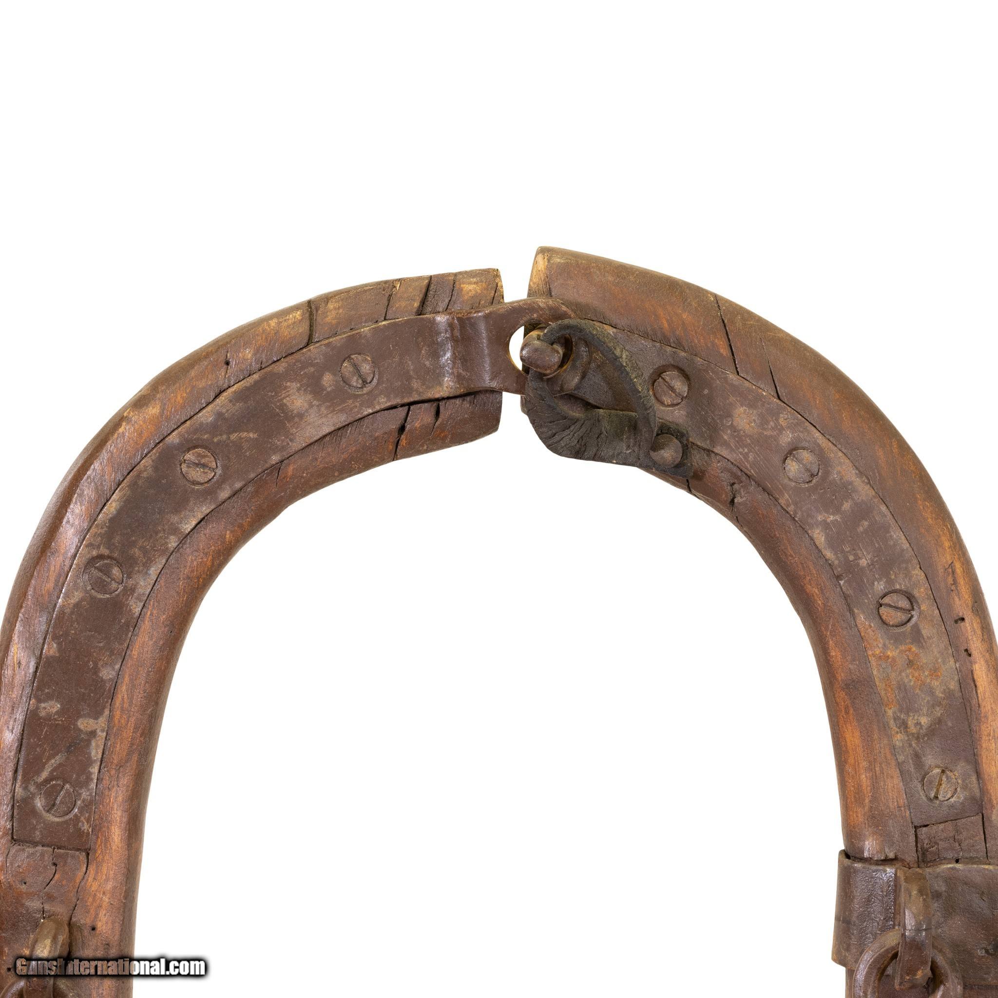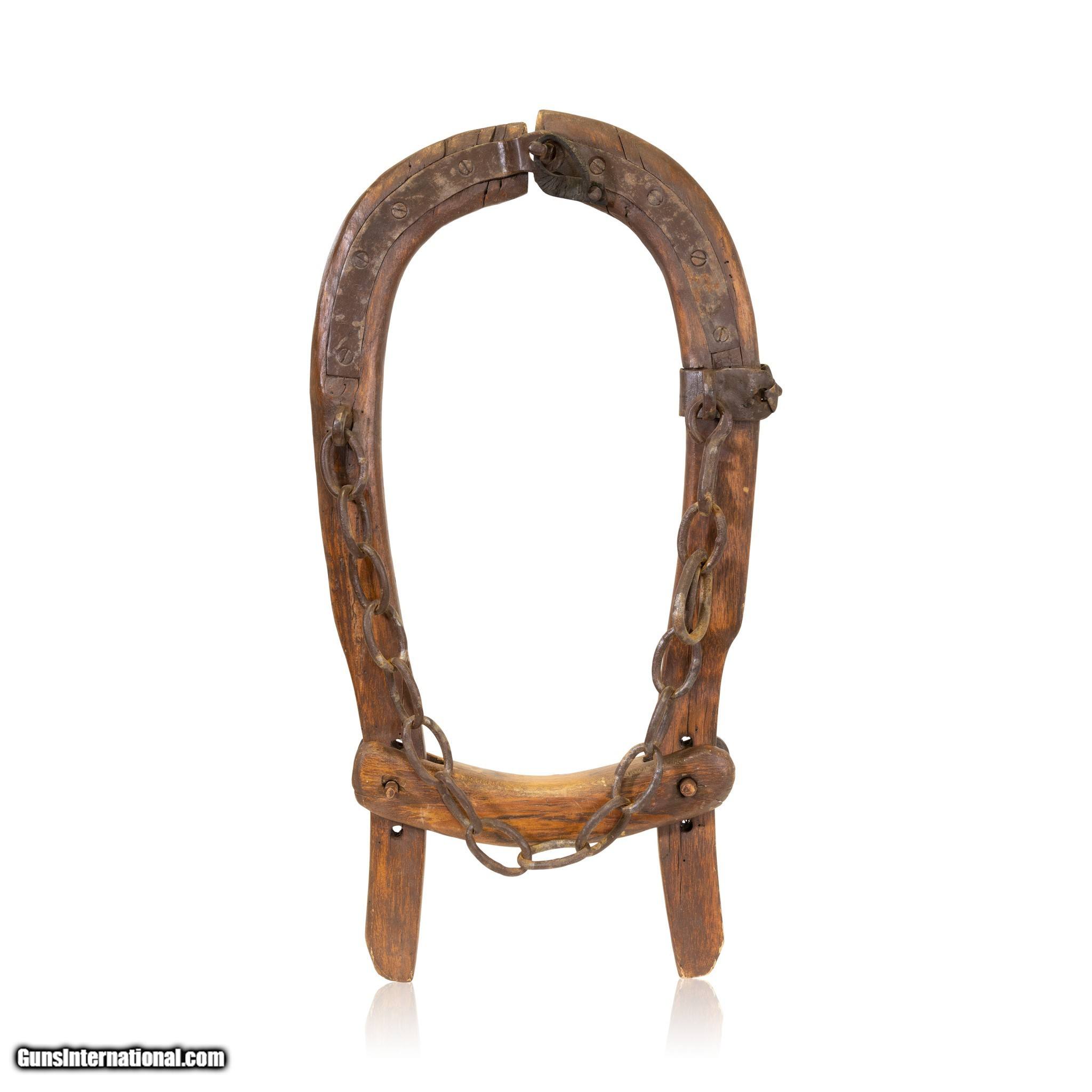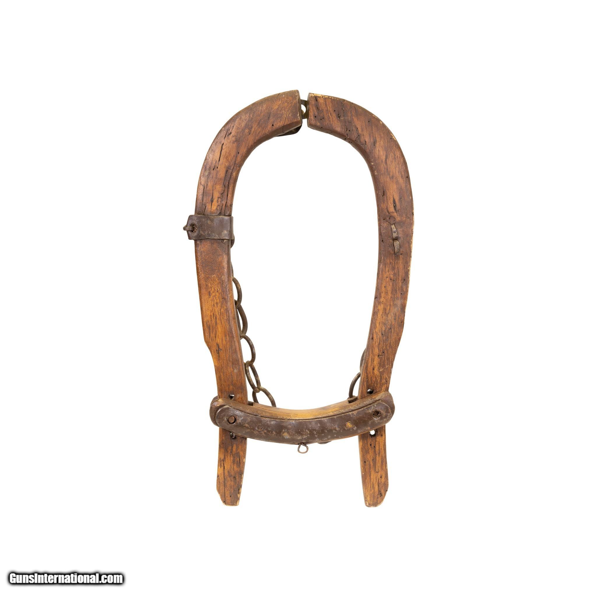 Description: Frontier and blacksmith made reinforced wooden collar for a burro used to pull a mining cart. Note wear in chainlinks. A much used piece. One of a kind wall hanger. 24" x 12". Last half 19th cenutry. SOLD |