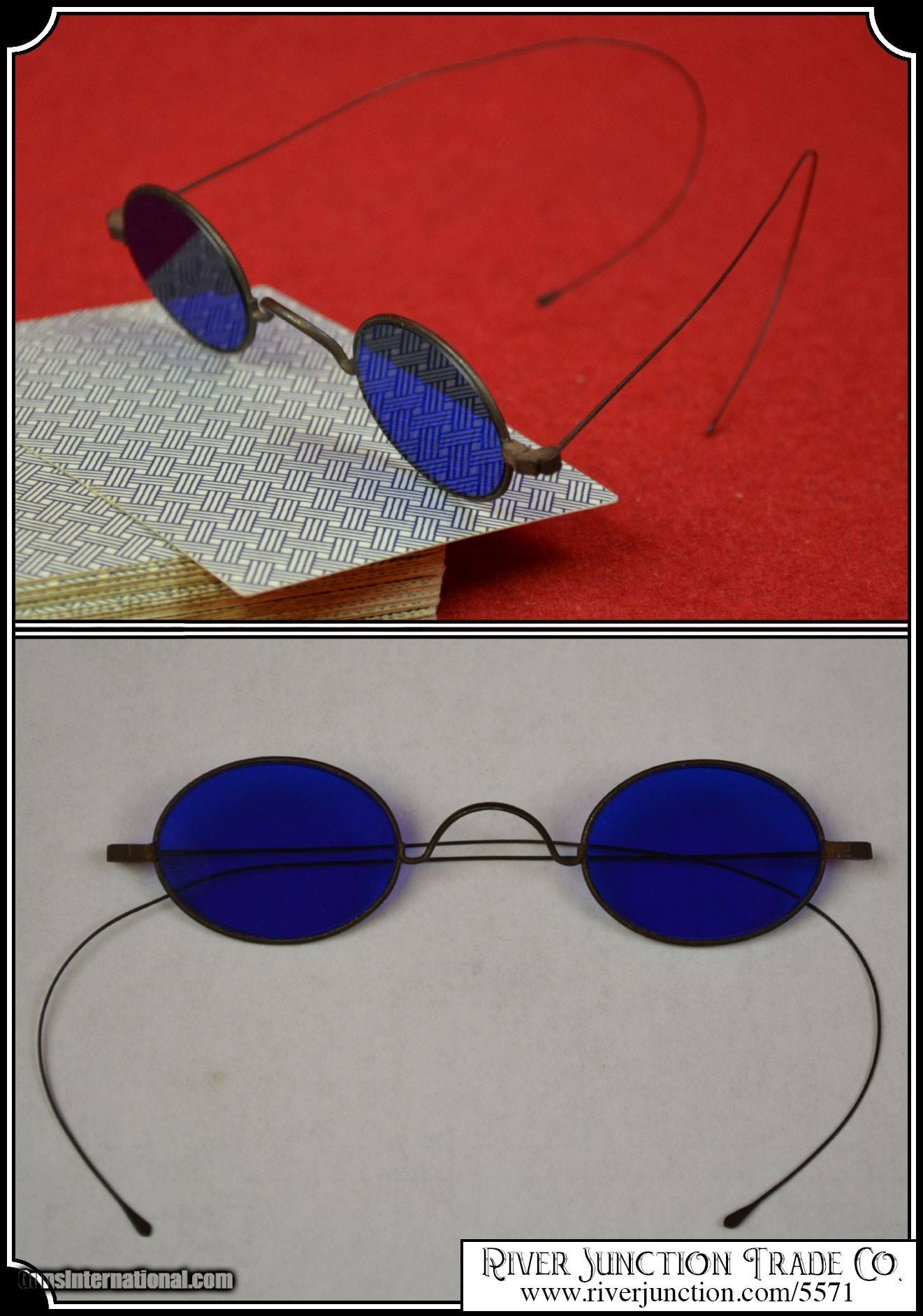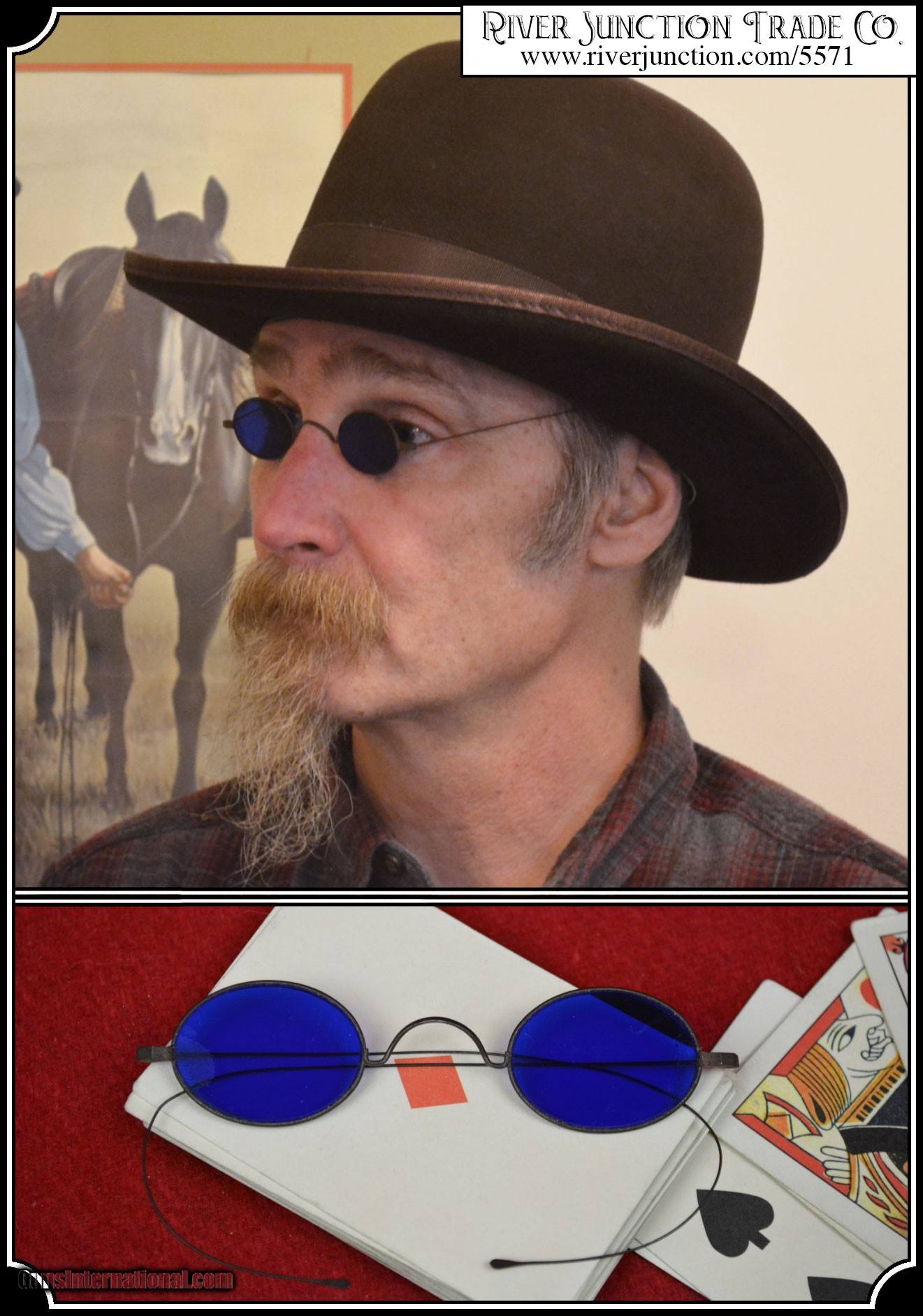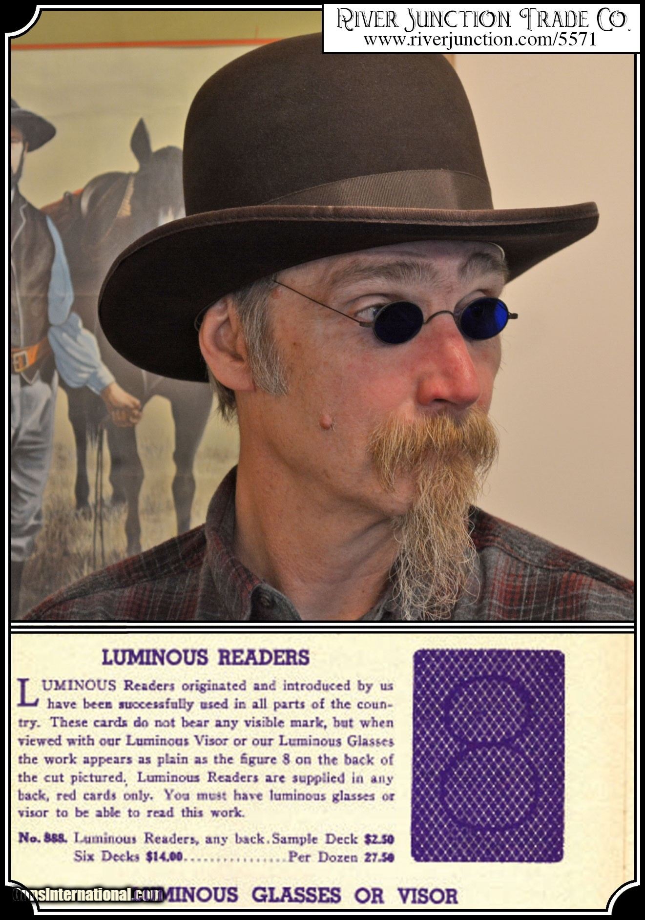 Description: Gambler's Cheater Glasses. These glasses are cheating spectacles. Blue-tinted spectacles (as they were called back in the day) afforded the wearer a huge advantage over all other card players at the table because with the use of phosphorescent ink he could mark a deck of cards and with the use of these special glasses he could view the markings while his opponents could not. In K. C. Card Co. Blue Book Number 436, page 22 there is a listing for Luminous Readers. The book states "Luminous Readers originated and introduced by us have been successfully used in all parts of the country. These cards do not bear any visible mark, but when viewed with our Luminous Visor or our Luminous Glasses the work appears as plain as the figure 8 on the back of the card pictured". Also listed on that page are; Luminous Glasses or Visor, Luminous Material, Luminous Ink and Luminous Daub. SAVVY SAYIN! "Never gamble with a man who knows both sides of the cards." Payment: Item, can be ordered on line with a credit card or paypal on our sight. Just Google (riverjunction) and type in the River Junction Trade Co. item number (5571) in the search box. Before you checkout you will see shipping cost and total. OR If you prefer: Pay by cash, postal money order, cashiers check, personal & business checks. We wait for checks to clear. We always answer questions and entertain offers. Have questions? Call me 563-880-4588. Jim SOLD |