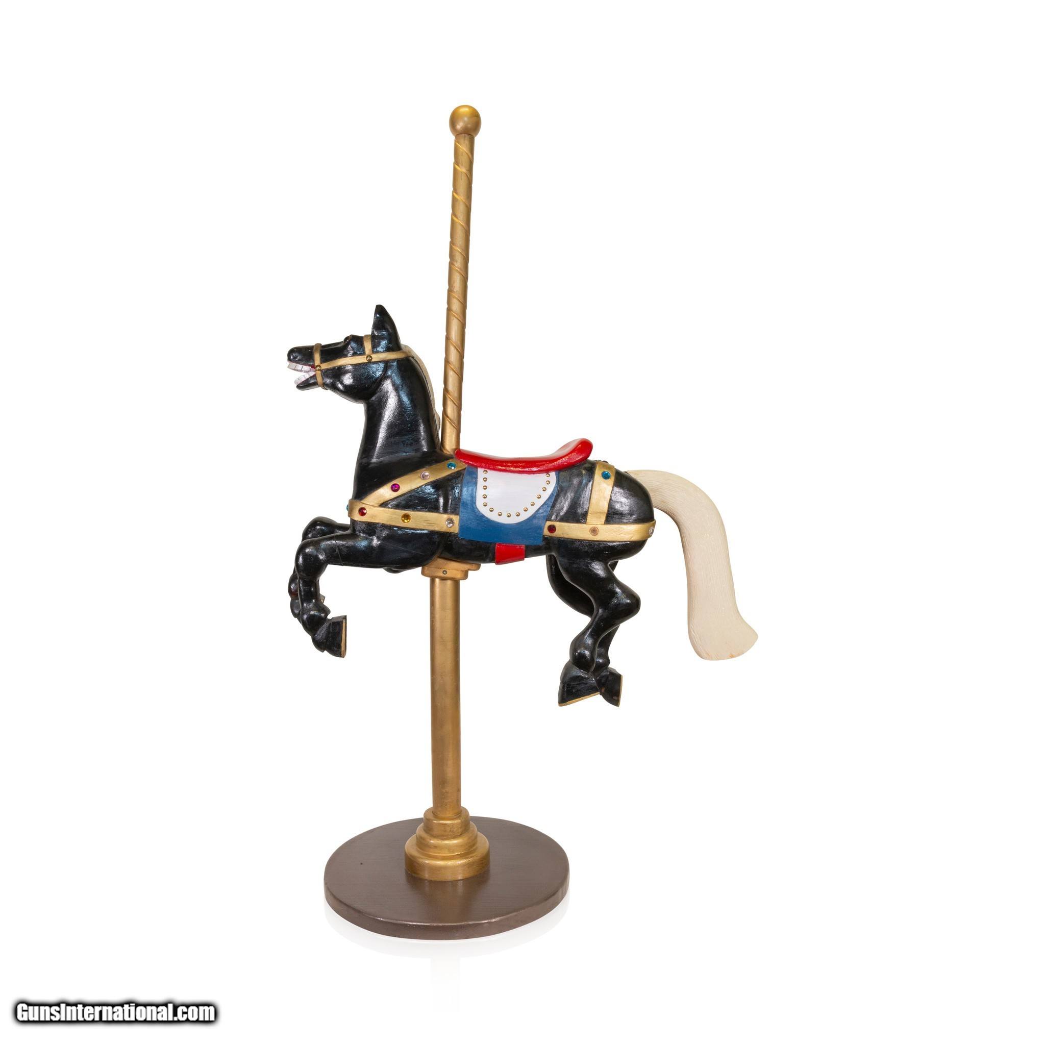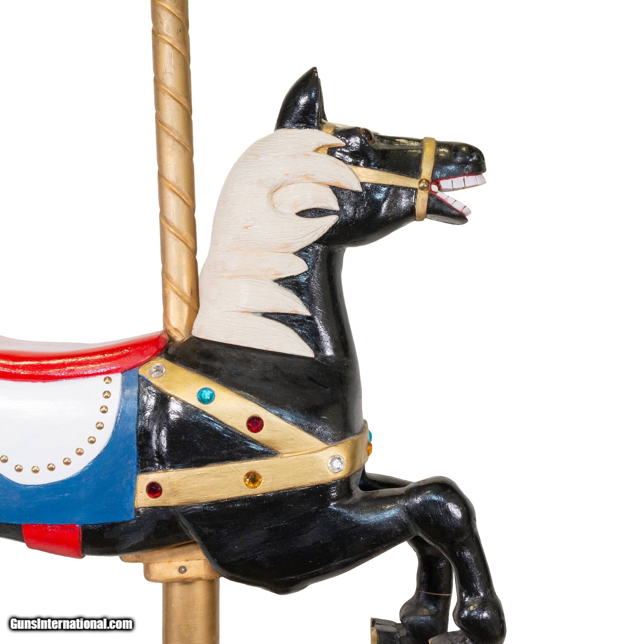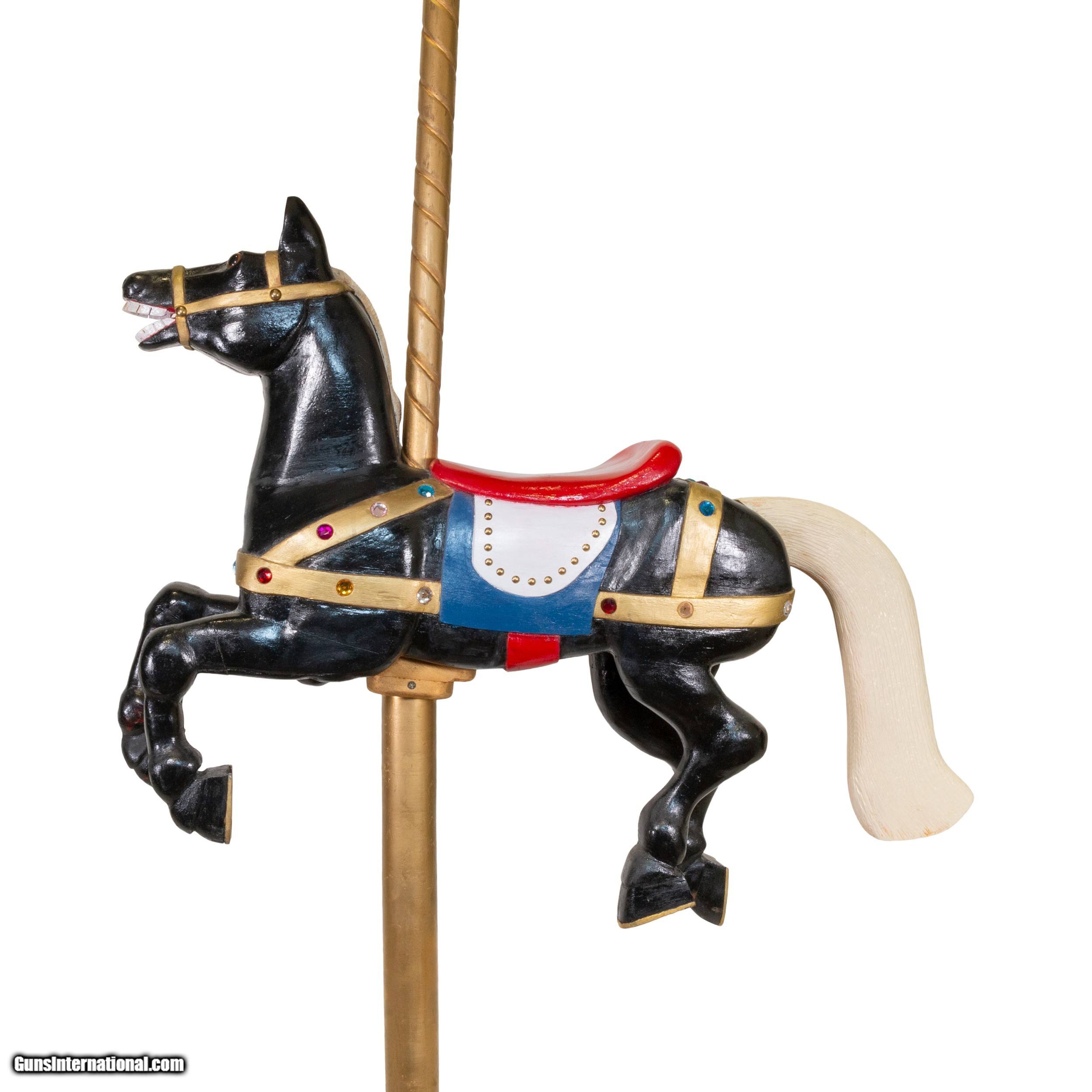 Description: Jeweled carousel horse carved by Tony Demma ( - 2015). Multi colored faceted glass jewels. One of kind of kind, hand carved, solid wood and hand painted. Tony Demma was a prolific wood carver in North Idaho after retiring in his 70s and 80s. This was his last piece. Absolutely stunning collectible that would make an amazing piece of decor in a variety of different styles of homes, or a great piece for display. Size: Horse 24" x 36" Stands 54"; Side to side at front of chest is 7". Front hoof to ear is 24", nose to tail is 34". SOLD |