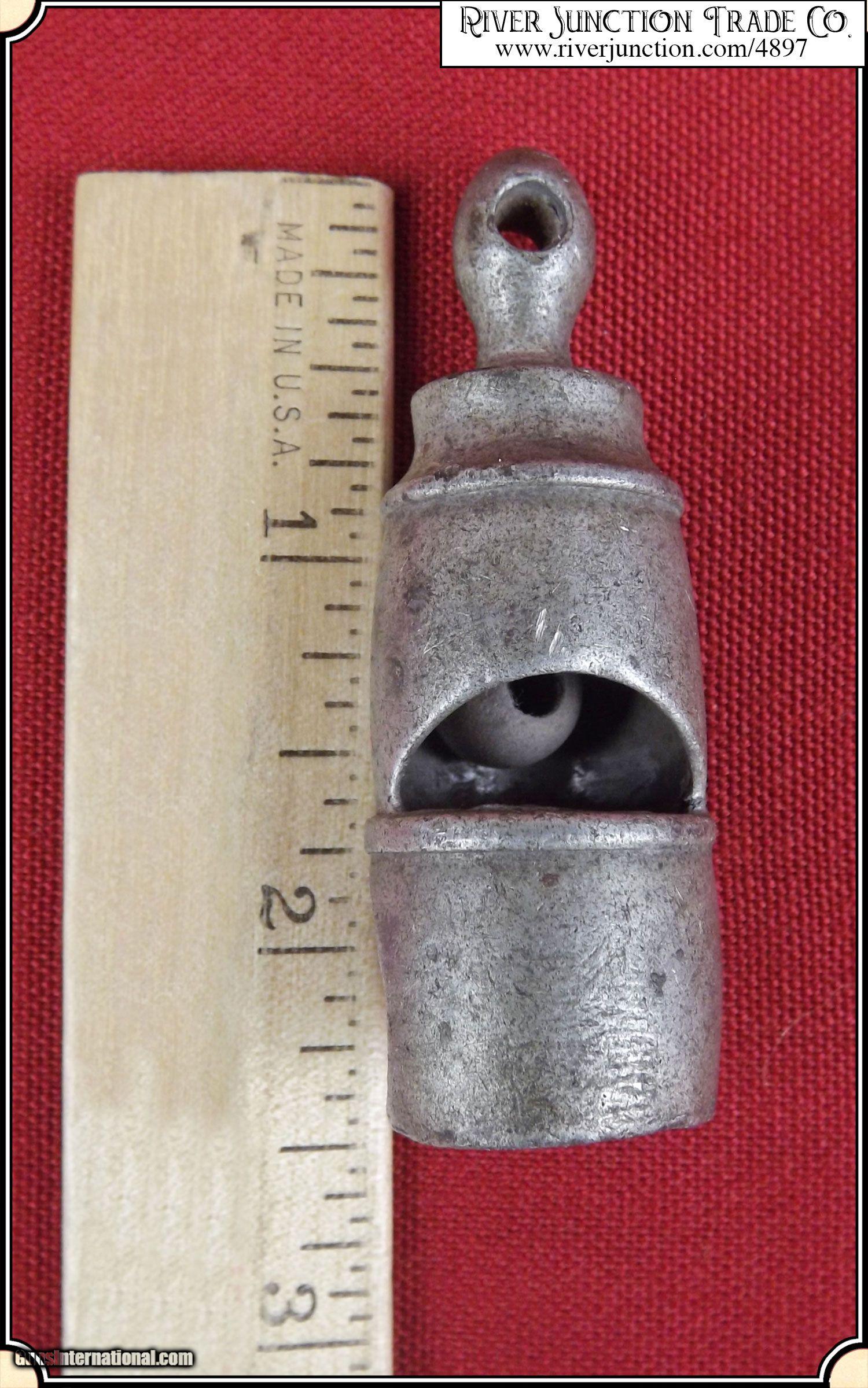 Description: This is a great Find. A rare Civil War Military/Militia Whistle. This piece comes to us from a collector who loved to search the Civil War battle Fields and had many battle field finds. We think this Whistle maybe one of them. This Whistle is made of Pewter and still has the ball (either Wood or Cork). It has a couple of small "corrosion spots" that could easily be cleaned off, otherwise this Whistle has a great patina. There are no cracks, chips or holes, and it still sounds good and loud when blown. This piece could have been used by Militia or even NCO as an alarm or signal to friendly troops. This kind of whistle could also have been used to command troops on the battlefields. There is some documentation of this mostly by Southern Confederate Troops of the Missouri Brigade. "We were also joined by a company from the Second regiment, Col. F. M. Cockrell. The three companies formed a battalion and were placed under command of Lieut. Col. Hubb[ell] of the Third Missouri. Our movements were executed by calls from a whistle instead of the bugle. We discarded the bugle some months previous though the influence of Capt. Burke, as the calls on this instrument were the same as those used by the federal forces. Hence, while we had the advantage of knowing his movements by the bugle calls, he could not anticipate our moves, as he was not familiar with our orders by the whistle. This change afforded us great advantage and amusement while we anticipated his every move." - Joseph Boyce, Captain Joseph Boyce and the 1st Missouri Infantry, C.S.A., ed. William C. Winter, p. 105-6 See further information on the Missouri Brigade including the above quote by searching the 1st Missouri Brigade These whistles are hard to find, especially in this condition, and are highly collectable. This would be a fantastic add to any Civil War Collection. Payment Cash, postal money order, cashiers check, personal & business checks. Can be ordered with a credit card or paypal at wxx.riverjunction,cxx just type in the number 4897 in the search box. SOLD |