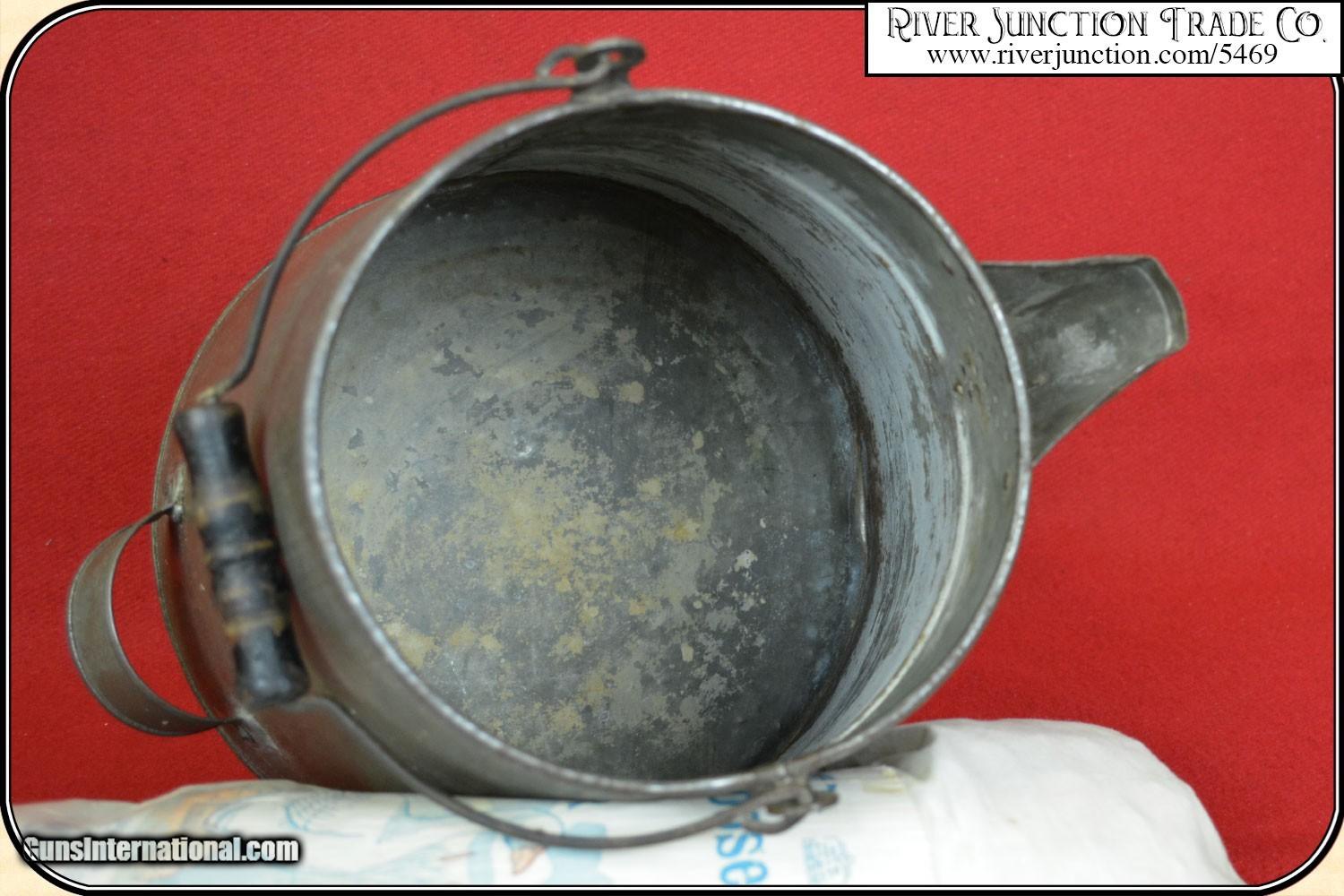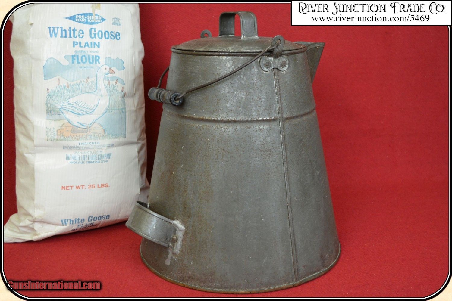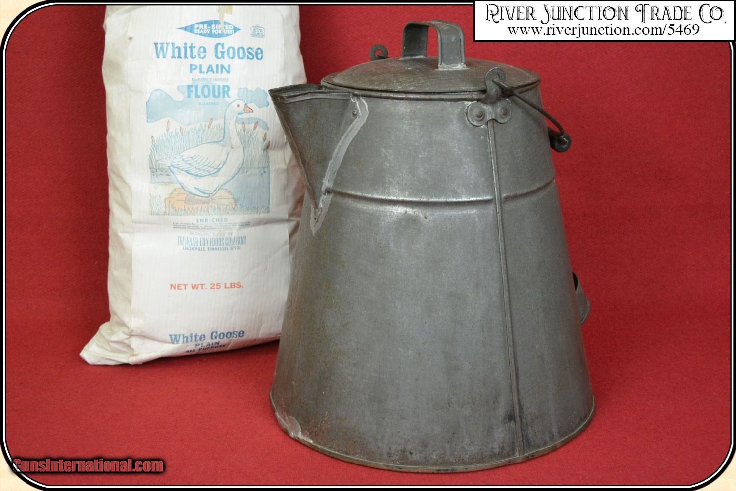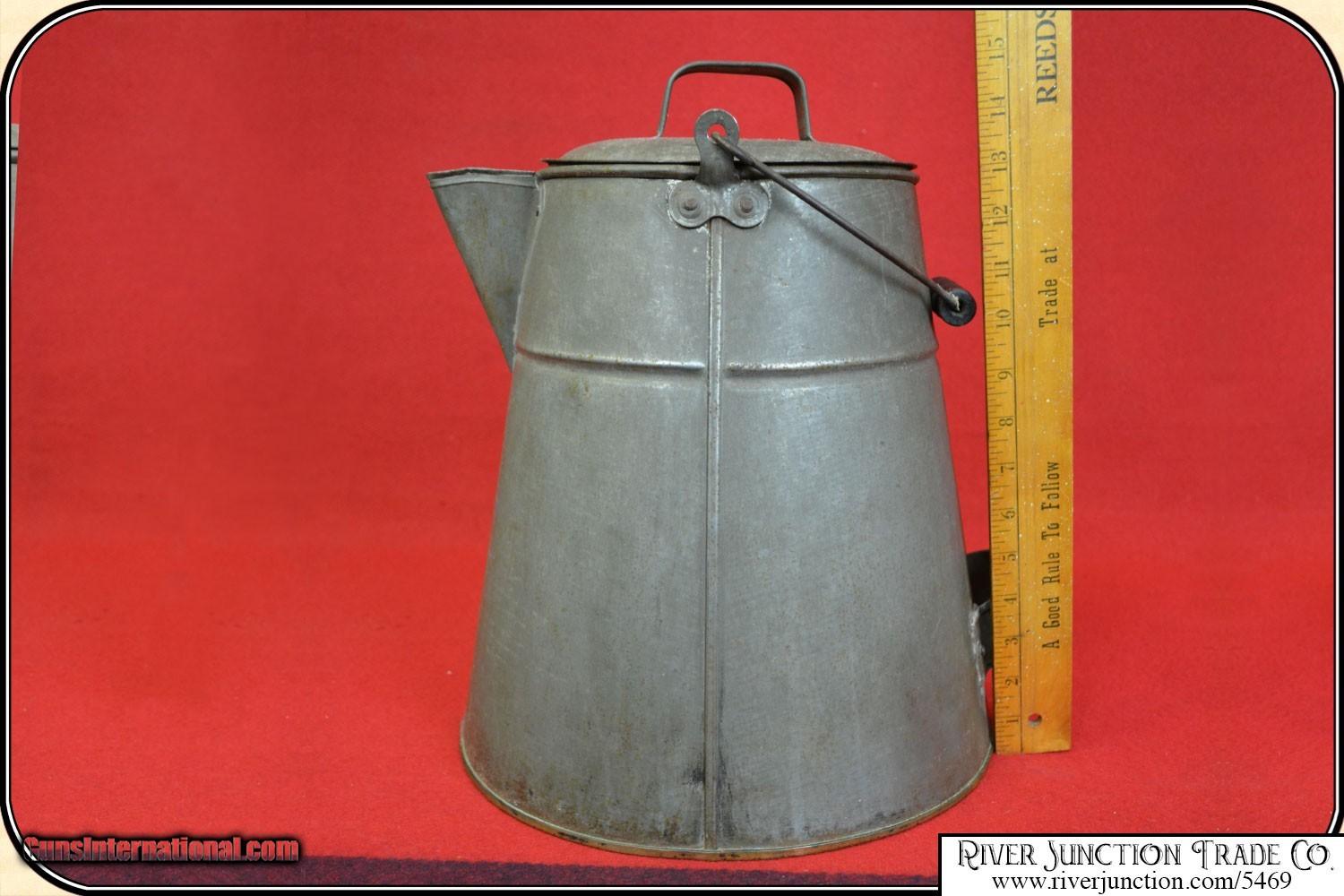 Description: A very very large copper bottomed tin coffee pot. In good condition, Stands about 15 inches tall overall with a 13 inch base and will hold 4 1/2 Gallon capacity filled to the brim. I would call it a 4 gallon pot. This is the real deal likely used on round up in Arizona as I bought it in an antique store in Clarkdale Az. 40 years ago. It does have a tiny pin hole that leaks but, on a camp fire you would not notice it. This is the type of pot old cooky kept on the fire all day. Made to handle a big round up, were the common 2 gal. pot just wouldn't do.The best cowboy coffee, in my mind, comes out of a cowboy coffee pot. Once the campfire is going, fill the pot with cold water and, when it boils, dump in the coffee grounds. (The only way to know how MUCH coffee is to work at it. Your comfort zone may range from 3/4 cup per quart of water to twice that.) . Let it cook for a minute -- no longer! -- and set the pot in a protected spot to steep for 5 minutes. A soft, sandy soil works well as an insulator here, and it's a good idea to cover it with a small towel.This is a vintage Coffee Pot with a bale handle. This pot is the type that was used on the trail. The grip on the bale handle is wood. The condition is good with NO dents, breaks or cracks. I doubt you will find another. I have only had two and this is the best one. Payment: Item, can be ordered on line with a credit card or paypal on our sight. Just Google (riverjunction) and type in the River Junction Trade Co. item number (5469) in the search box. Before you checkout you will see shipping cost and total. OR If you prefer: Pay by cash, postal money order, cashiers check, personal & business checks. We wait for checks to clear. We always answer questions and entertain offers. Have questions? Call me 563-880-4588. Jim SOLD |