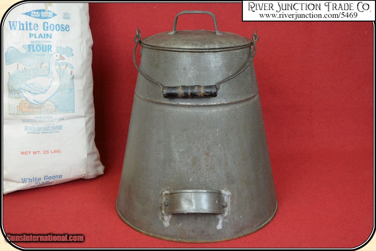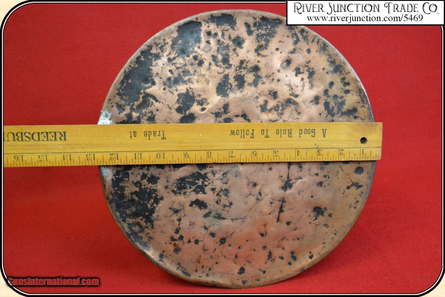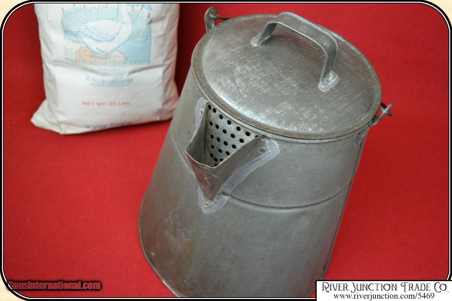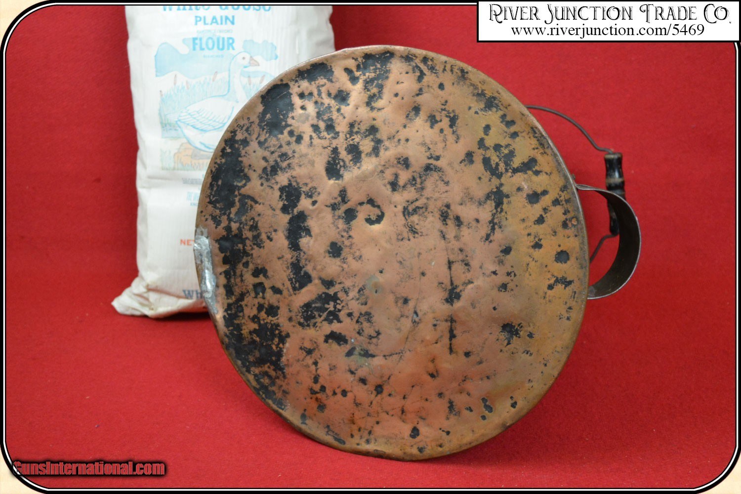Description: A very very large copper bottomed tin coffee pot. In good condition, Stands about 15 inches tall overall with a 13 inch base and will hold 4 1/2 Gallon capacity filled to the brim. I would call it a 4 gallon pot. This is the real deal likely used on round up in Arizona as I bought it in an antique store in Clarkdale Az. 40 years ago. It does have a tiny pin hole that leaks but, on a camp fire you would not notice it. This is the type of pot old cooky kept on the fire all day. Made to handle a big round up, were the common 2 gal. pot just wouldn't do.The best cowboy coffee, in my mind, comes out of a cowboy coffee pot. Once the campfire is going, fill the pot with cold water and, when it boils, dump in the coffee grounds. (The only way to know how MUCH coffee is to work at it. Your comfort zone may range from 3/4 cup per quart of water to twice that.) . Let it cook for a minute -- no longer! -- and set the pot in a protected spot to steep for 5 minutes. A soft, sandy soil works well as an insulator here, and it's a good idea to cover it with a small towel.This is a vintage Coffee Pot with a bale handle. This pot is the type that was used on the trail. The grip on the bale handle is wood. The condition is good with NO dents, breaks or cracks. I doubt you will find another. I have only had two and this is the best one. Payment: Item, can be ordered on line with a credit card or paypal on our sight. Just Google (riverjunction) and type in the River Junction Trade Co. item number (5469) in the search box. Before you checkout you will see shipping cost and total. OR If you prefer: Pay by cash, postal money order, cashiers check, personal & business checks. We wait for checks to clear. We always answer questions and entertain offers. Have questions? Call me 563-880-4588. Jim SOLD |