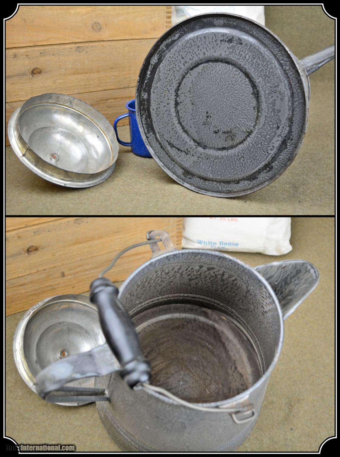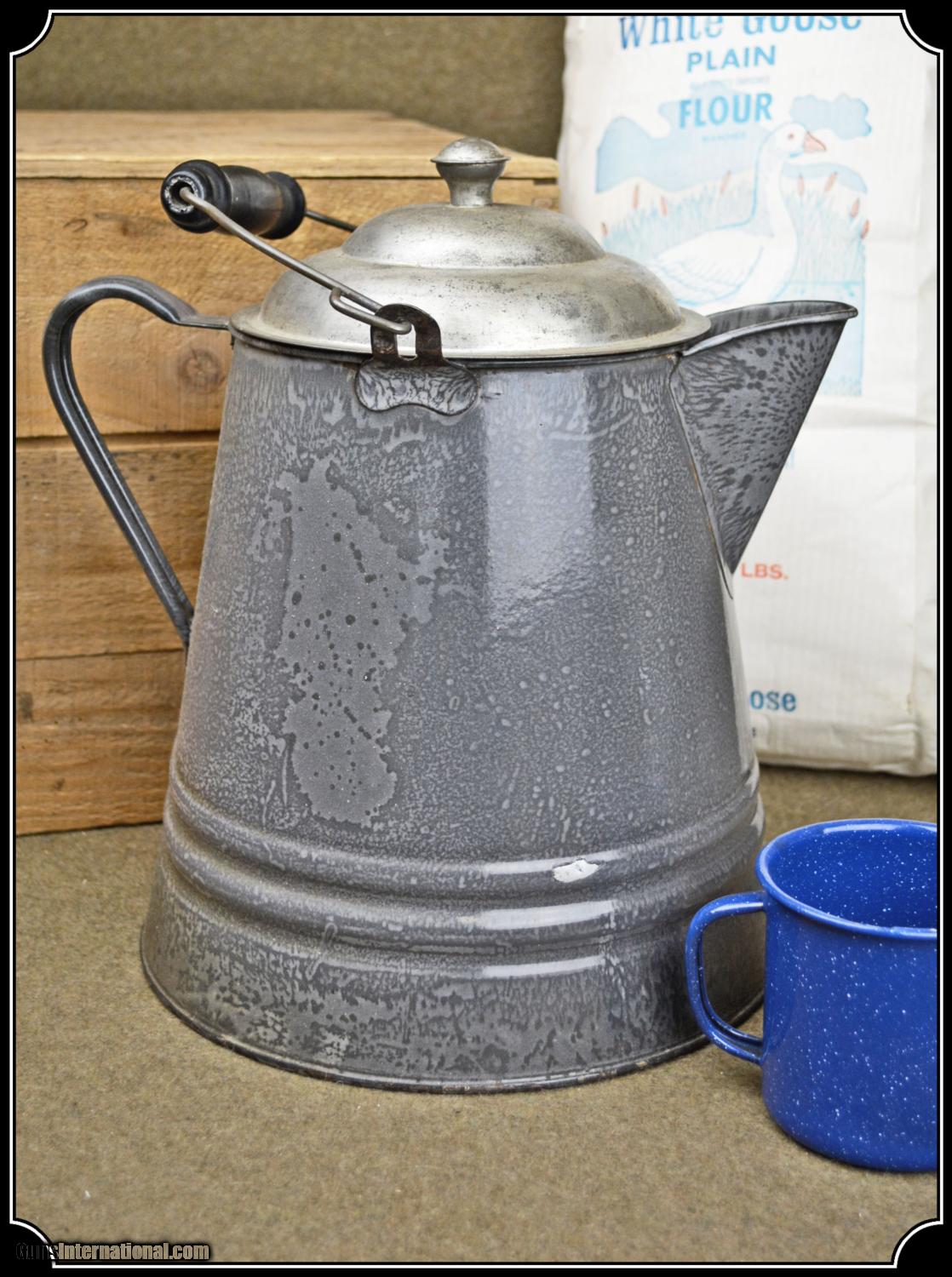 Description: Vintage Gray Enamel One Gallon Coffee Pot A Large-sized enamel or granite wear coffee pot. In very good condition, has only a very little chipping on it, otherwise perfect. Stands about 12 inches tall overall with a 9 3/4 inch base. The condition is very good with NO breaks or holes. The lid fits perfectly. The best cowboy coffee, in my mind, comes out of an enamel pot. Once the campfire is going, fill the pot with cold water and, when it boils, dump in the coffee. (The only way to know how MUCH coffee is to work at it. Your comfort zone may range from 3/4 cup per quart of water to twice that.). Let it cook for a minute -- no longer! -- and set the pot in a protected spot to steep for 5 minutes. A soft, sandy soil works well as an insulator here, and it is a good idea to cover it with a small towel. This is a vintage gray enamel coffee pot with a bale handle. This pot is the type that was used for outside camping or on the trail. The finial top is a metal knob. The lid is tin and in perfect condition. The bale is heavy wire. the bale handle will adjust to set straight up or swivel front to back, PAYMENT Cash, postal money order, cashiers check, personal & business checks. May order at riverjucntion on-line with credit card. SOLD |